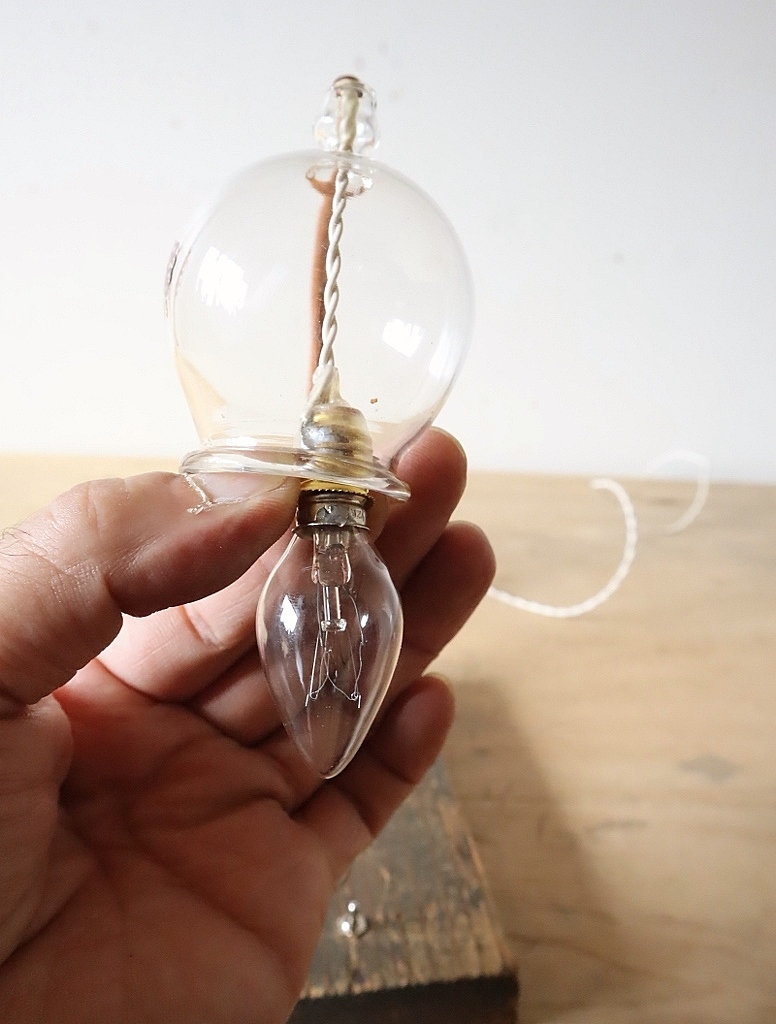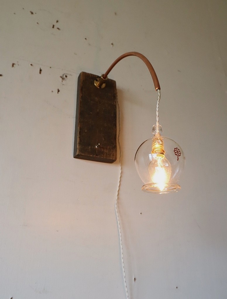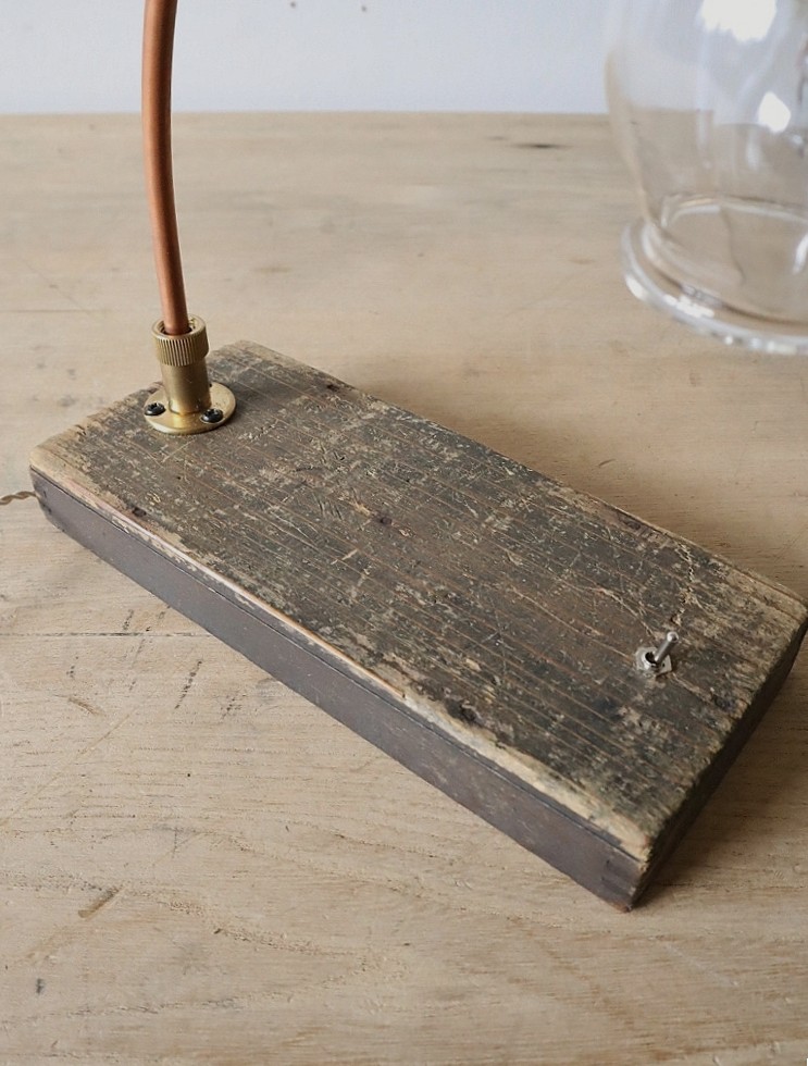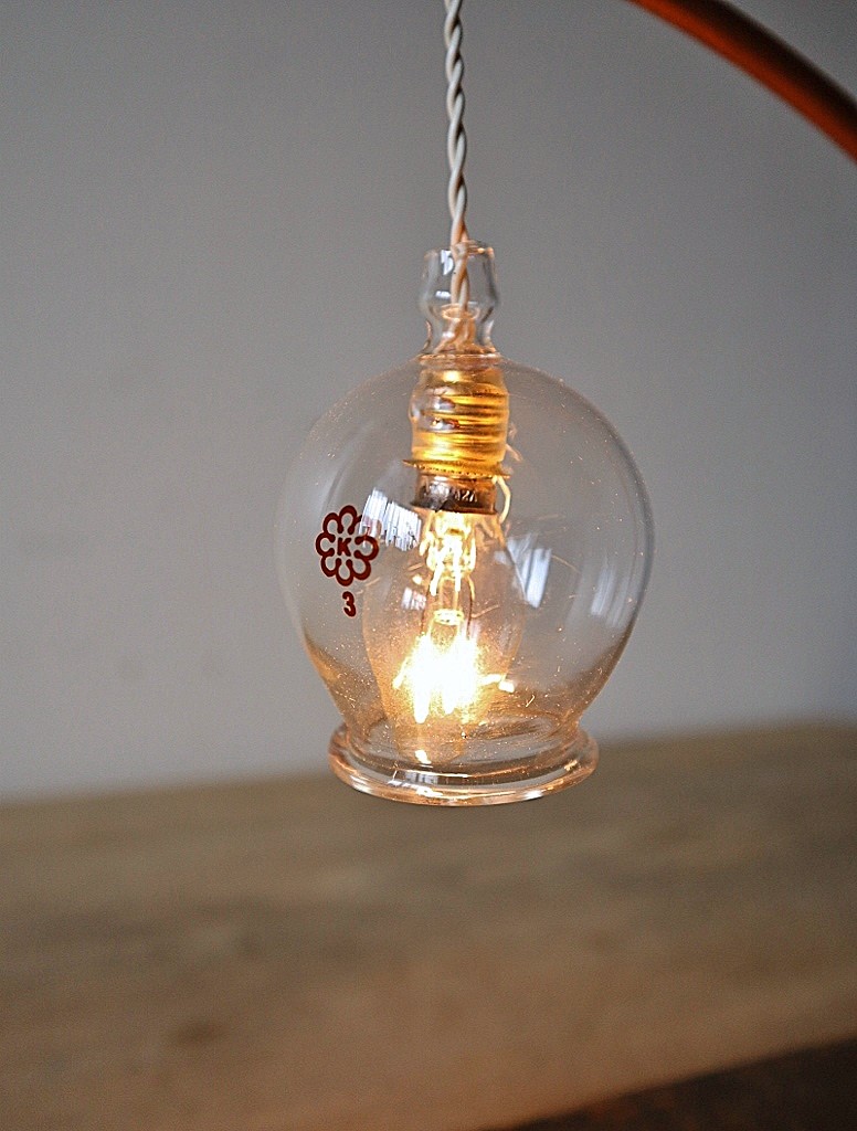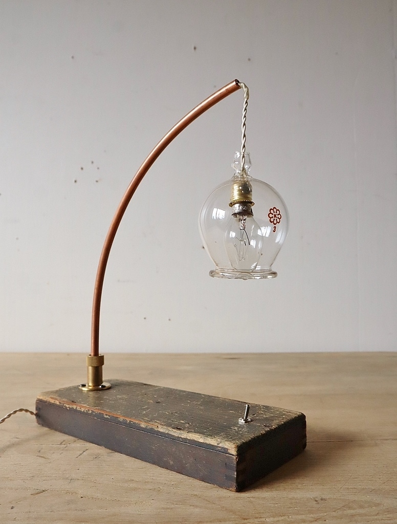 古い小さな吸引ガラスと活版印刷所で使われていた文選箱を組み合わせて制作した古道具紫山オリジナルの照明です。