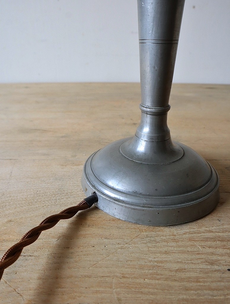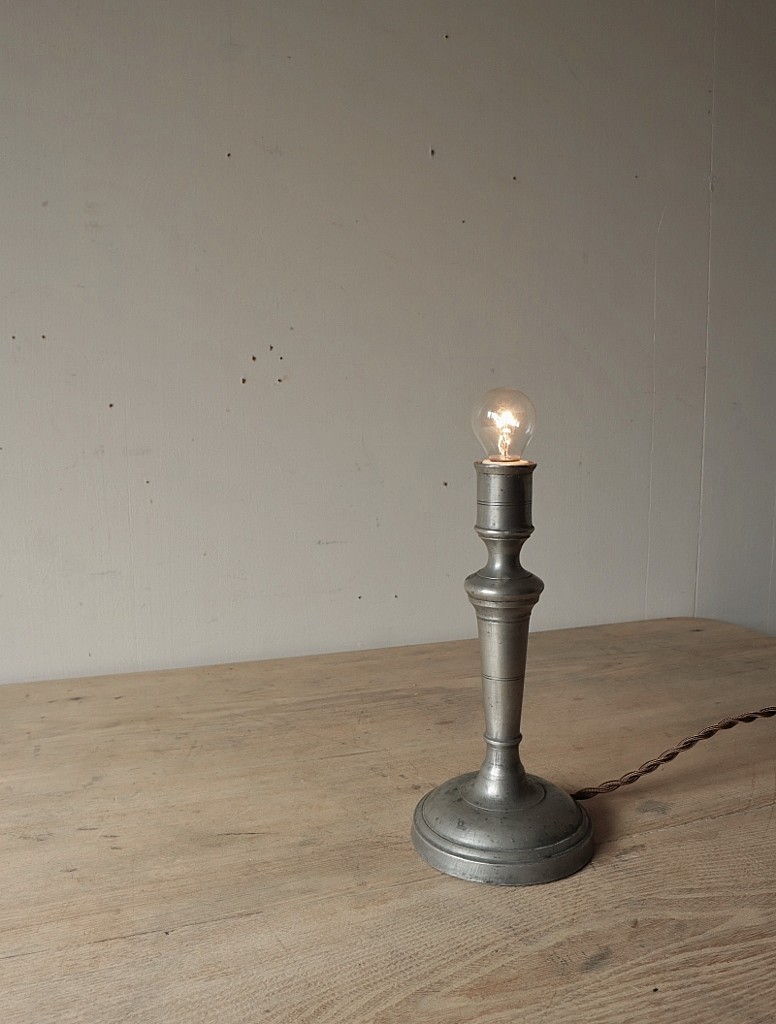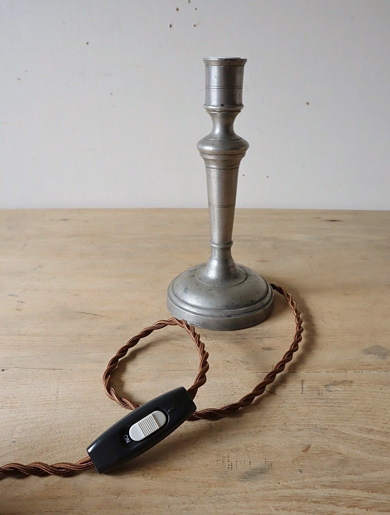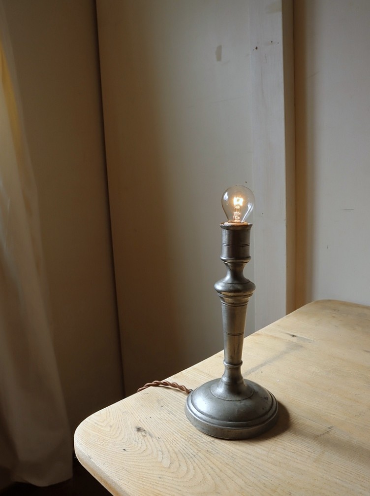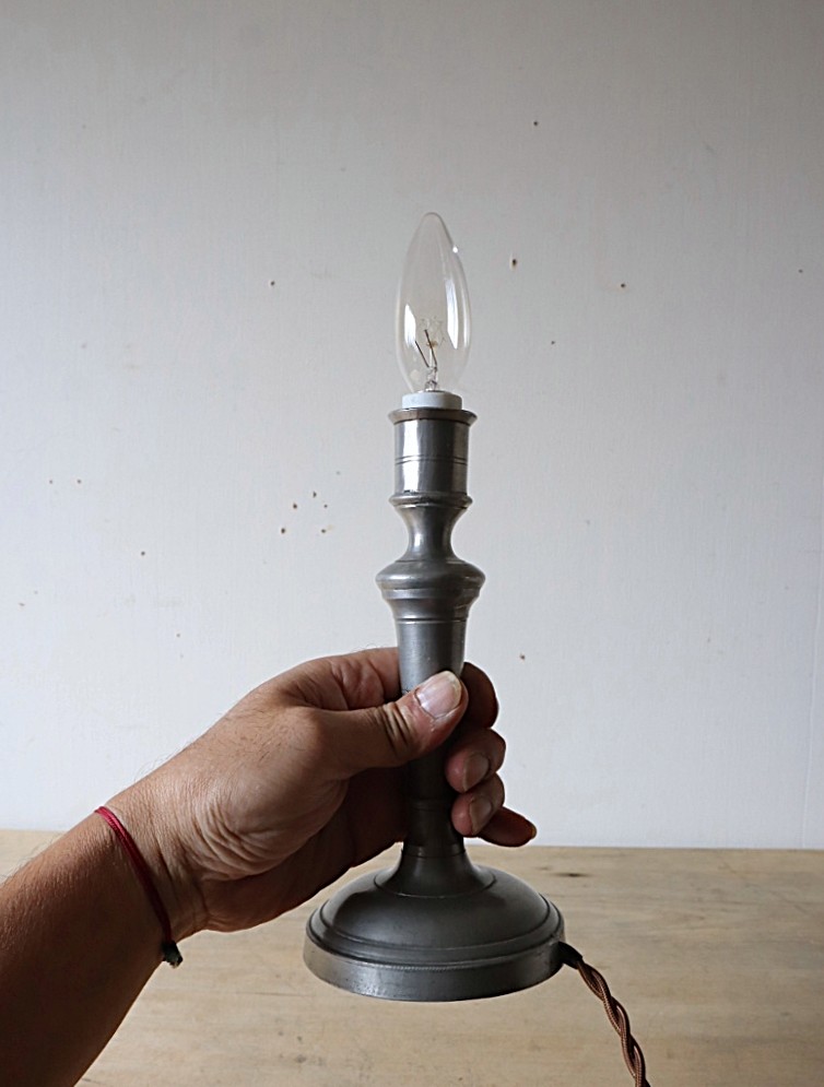 フランスの古い燭台を使い、ソケットとコードを取り付けてリメイクした古道具紫山オリジナルのスタンド型ライトになります。