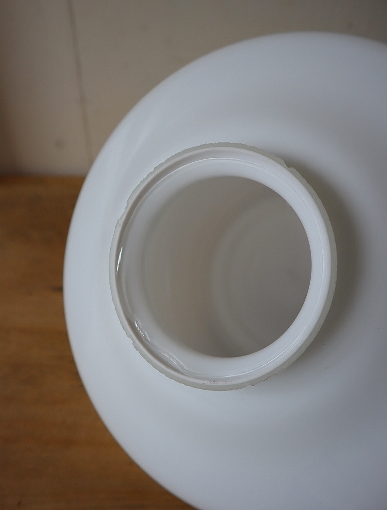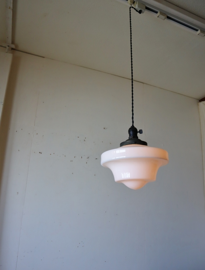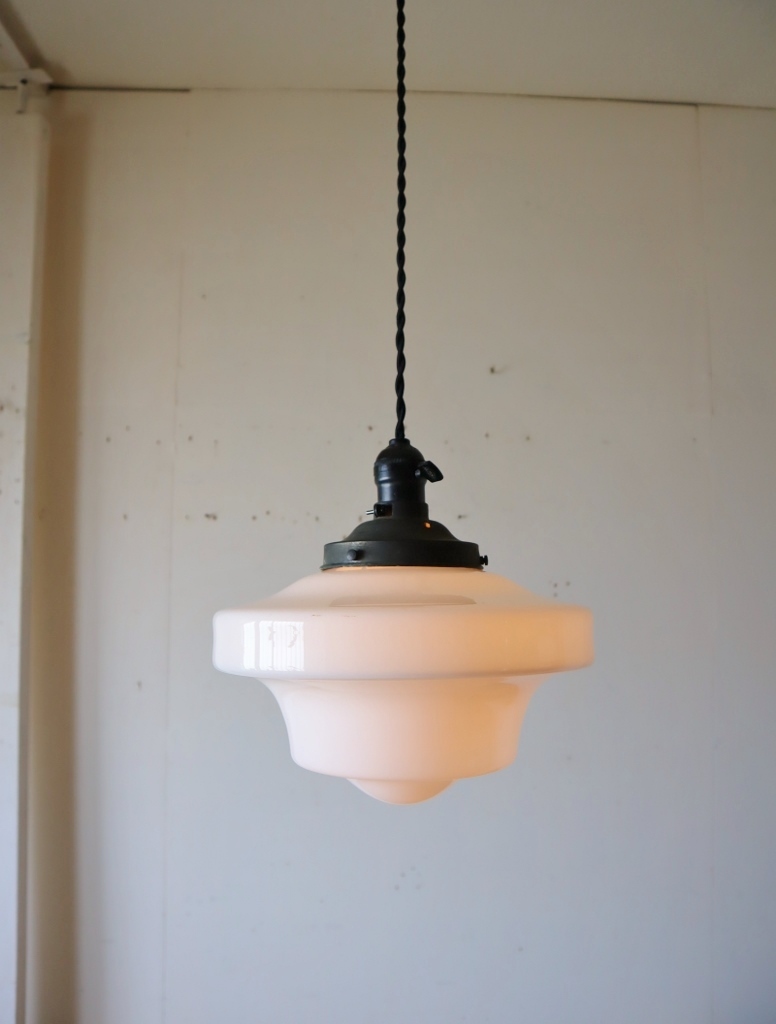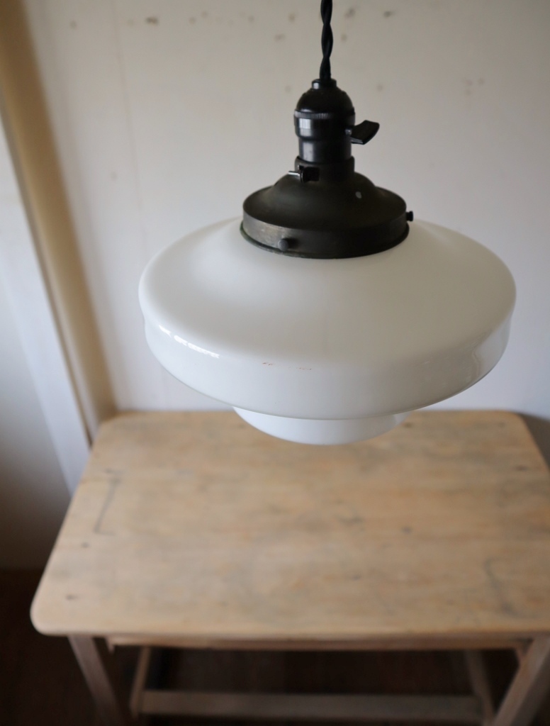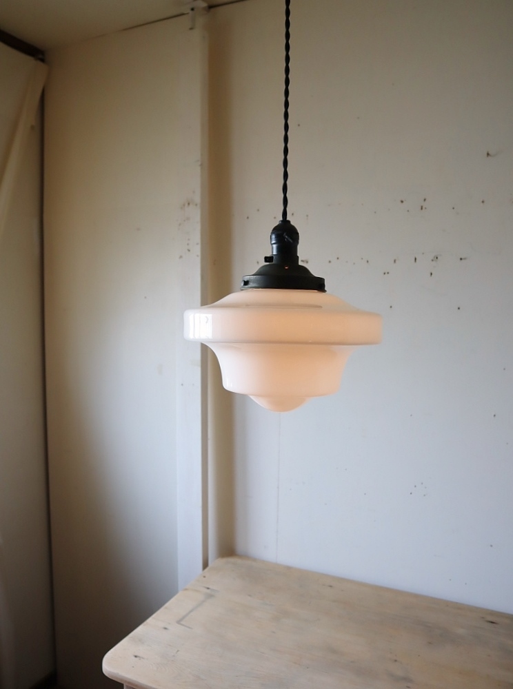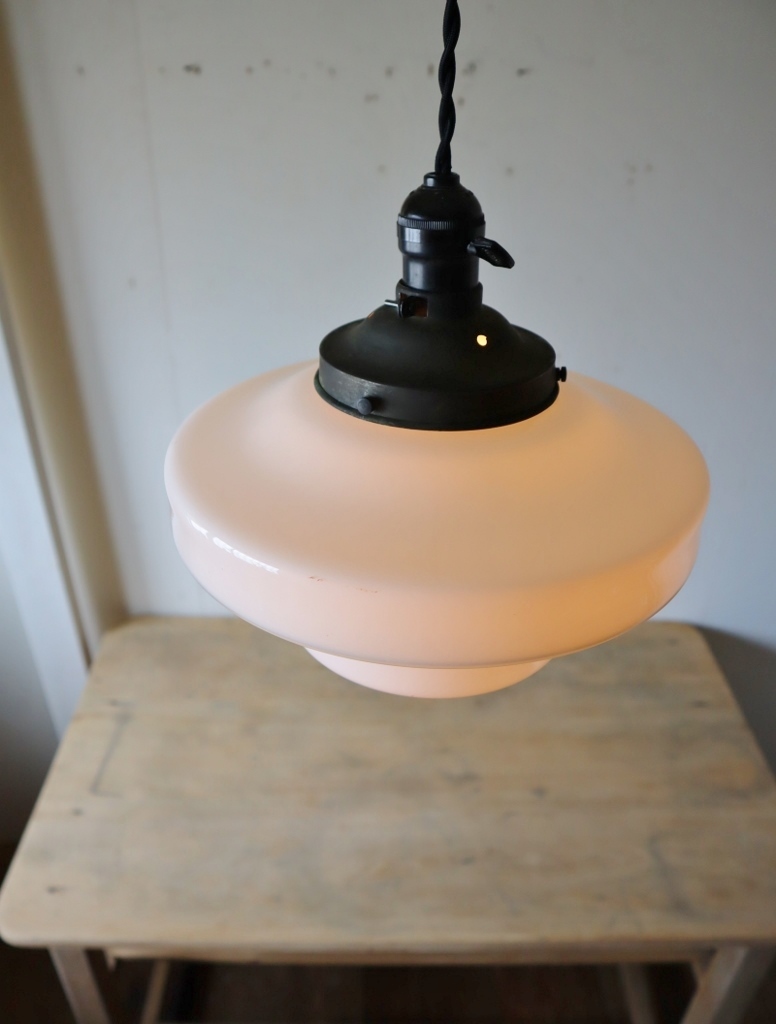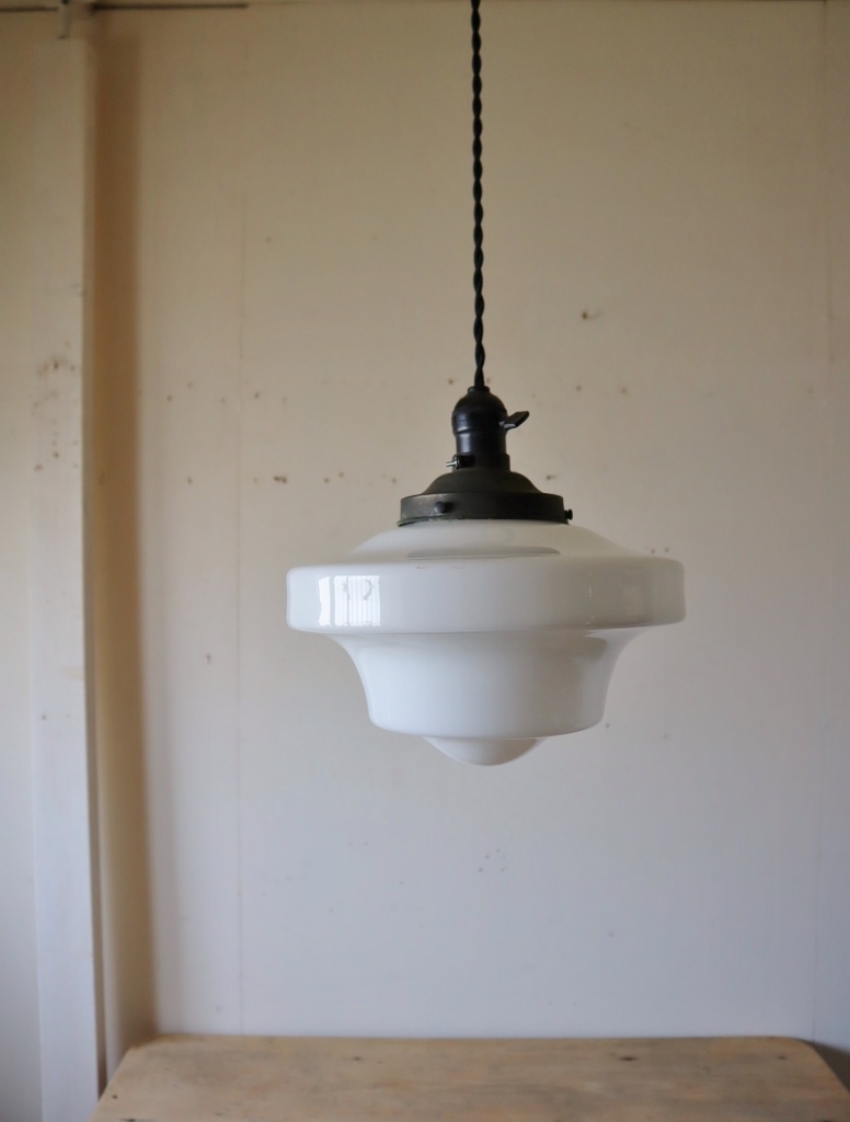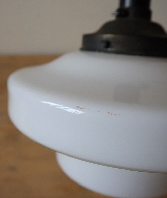 昭和期に使われていた程よい大きさでカタチの綺麗な古い乳白ガラスのシェードが付いた吊り下げライトになります。
