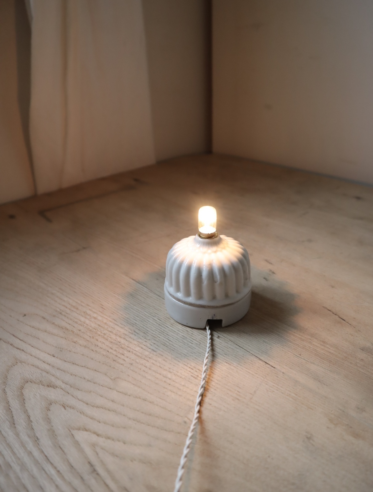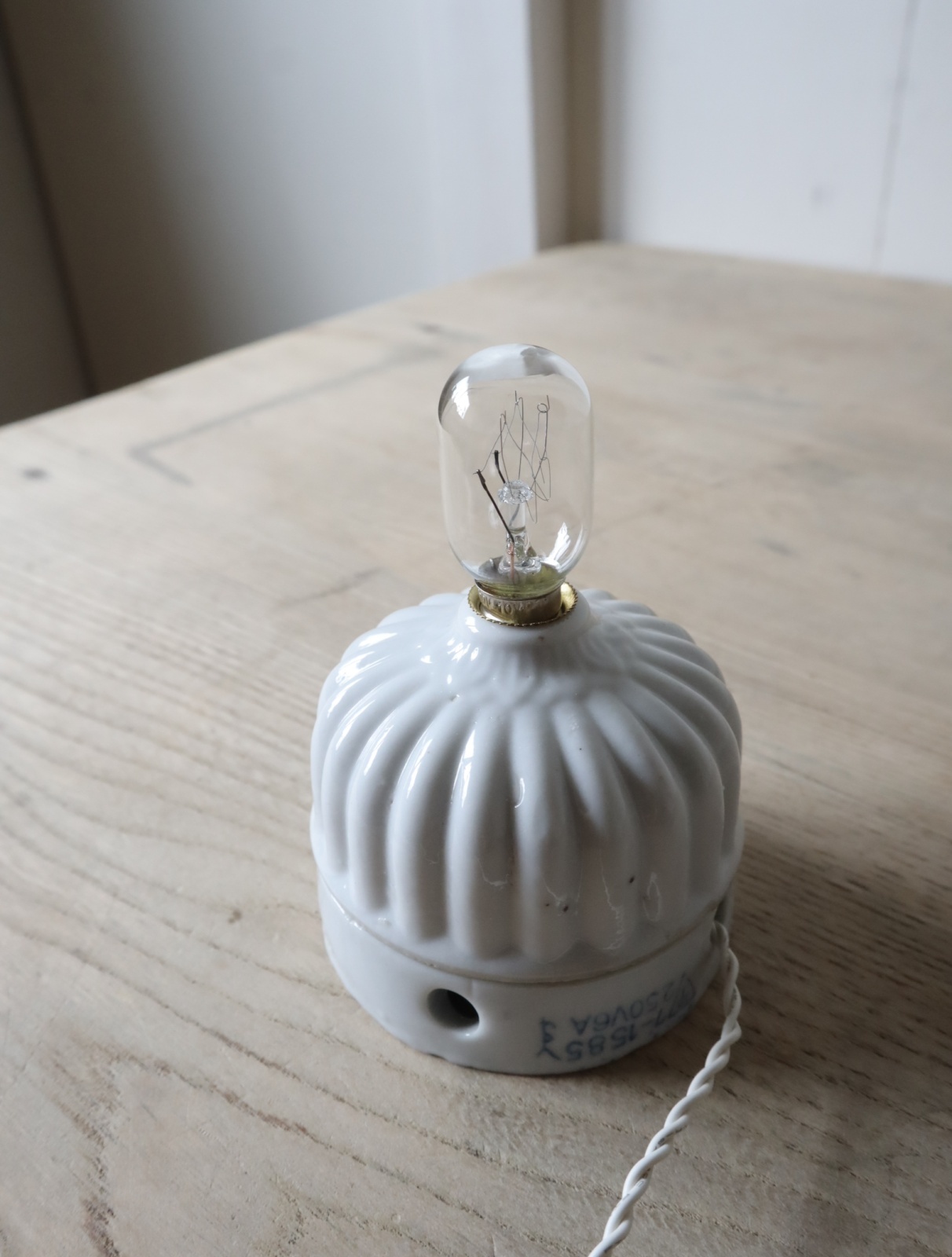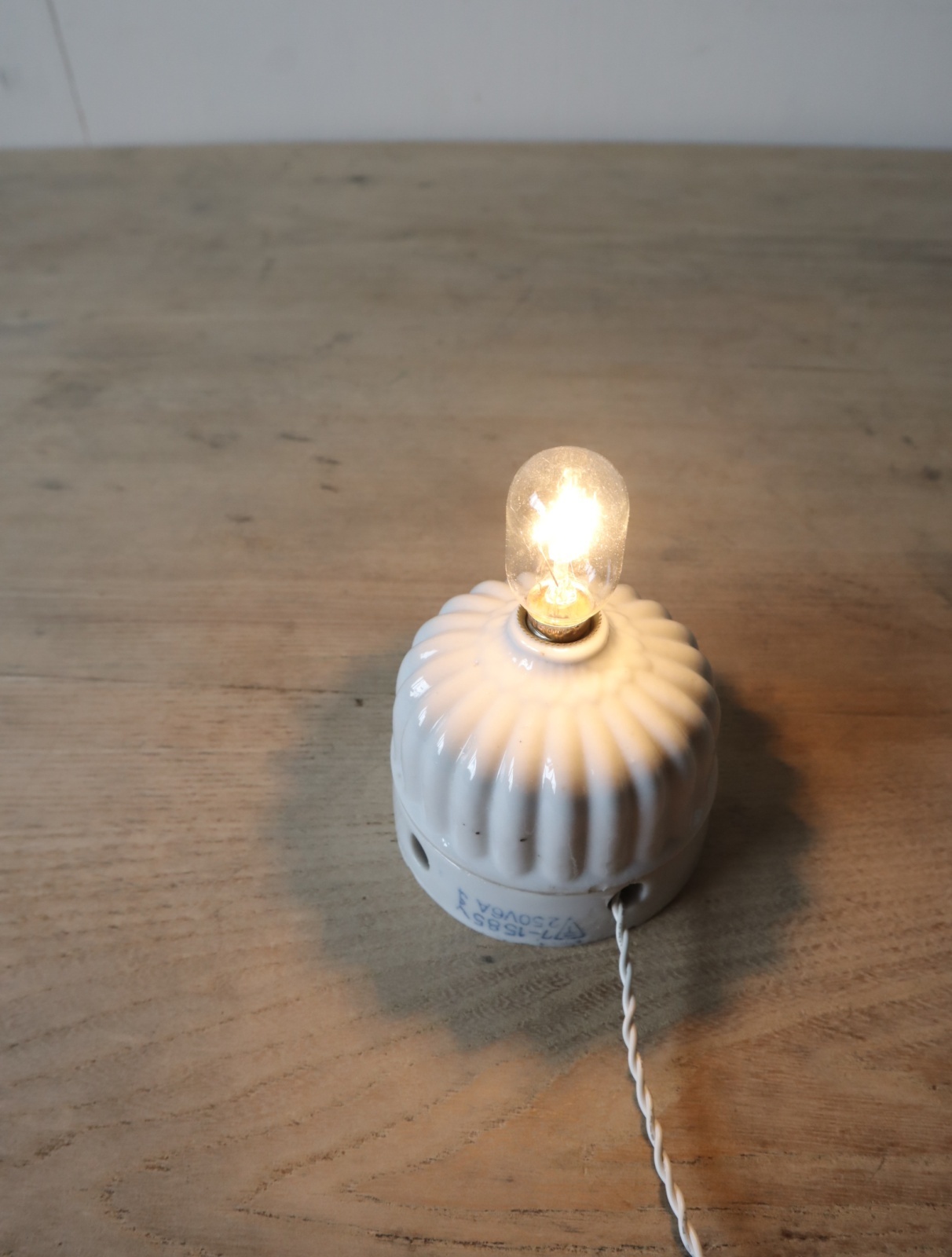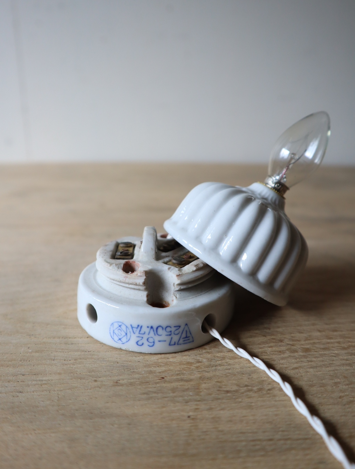 磁器製の菊型のローゼット(天井に取り付けて照明の配線通す器具)を使い、ソケットとコード、スイッチを取り付けてライトに仕立てました。