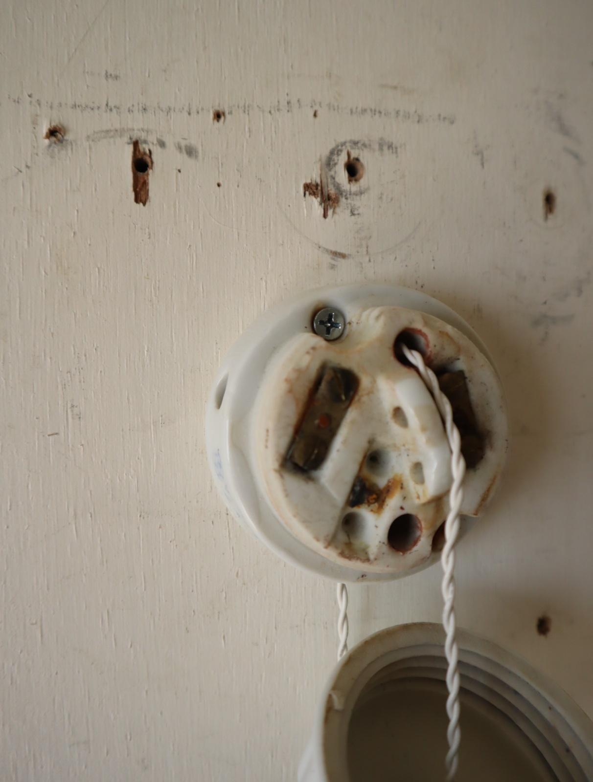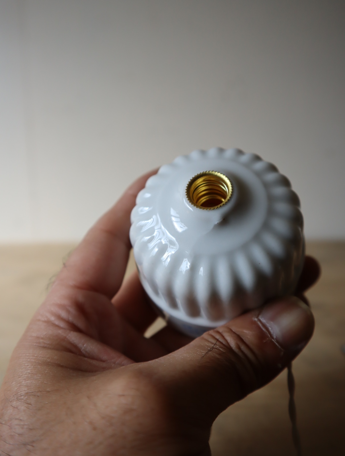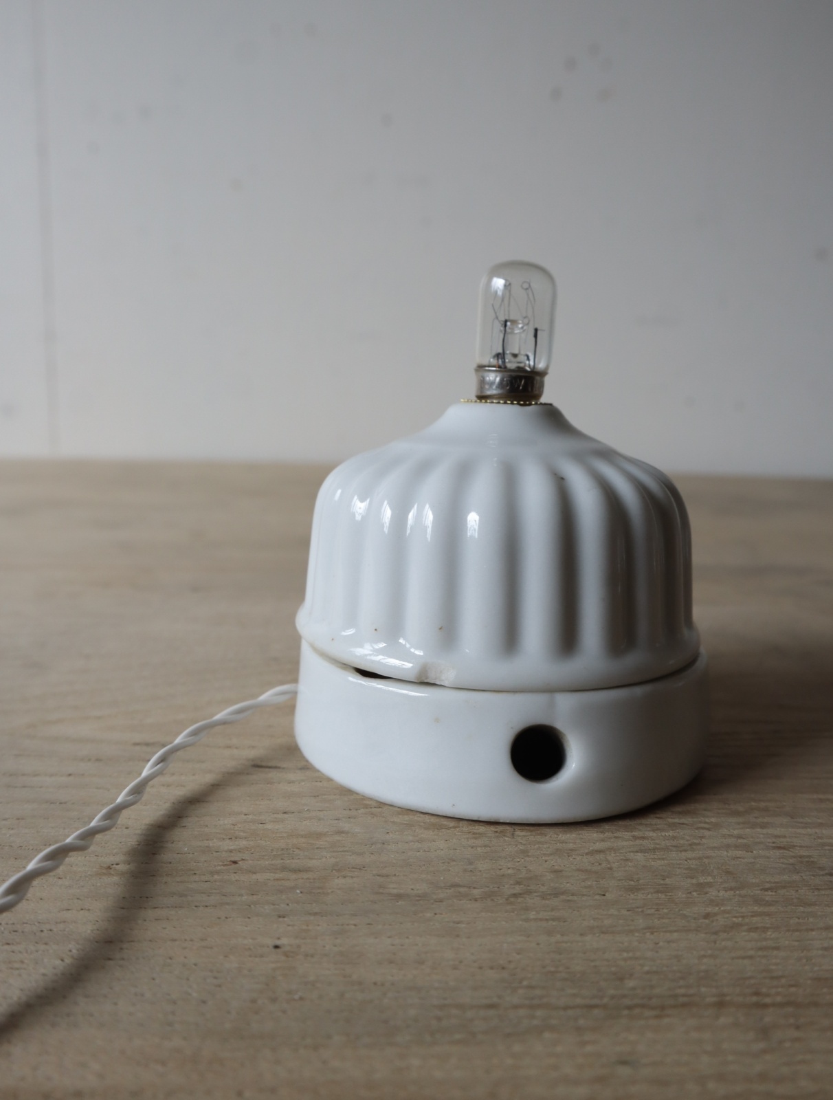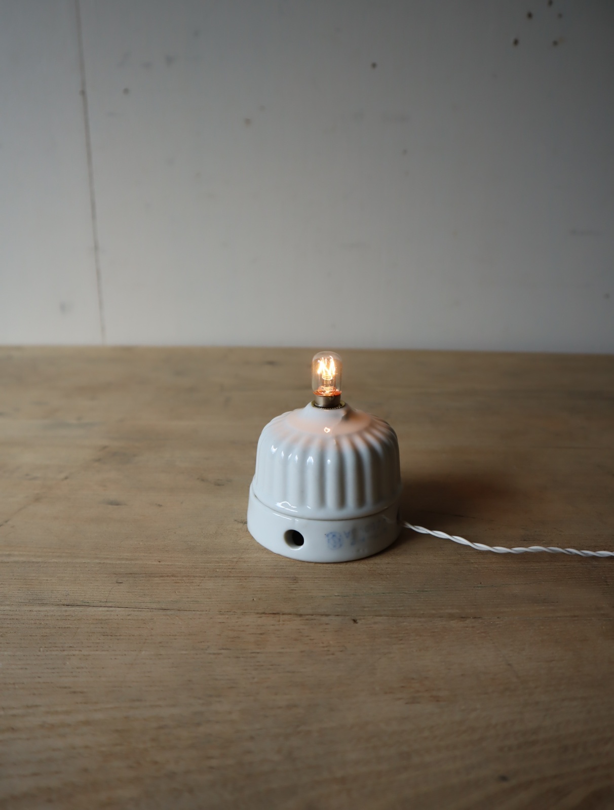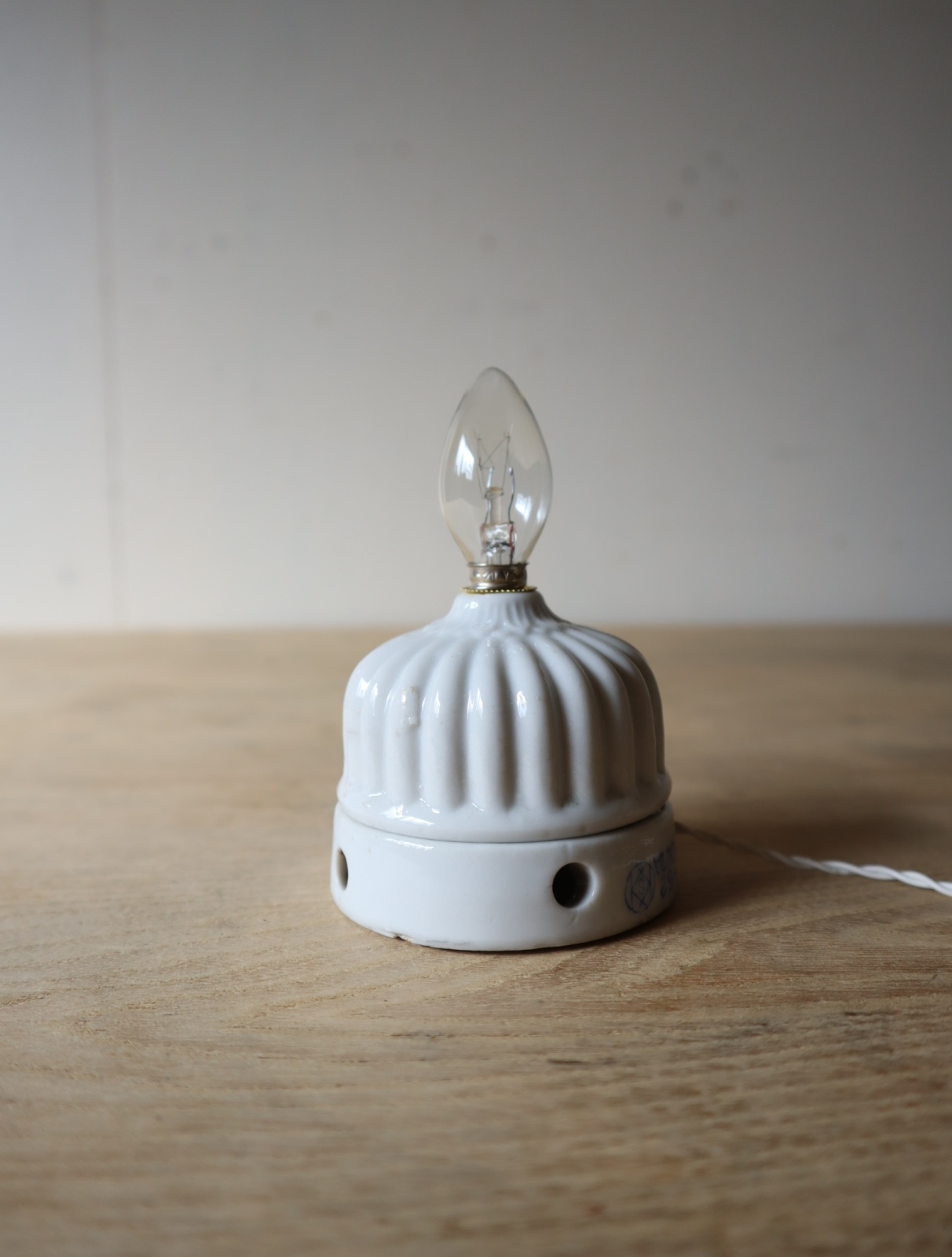 磁器製の菊型のローゼット(天井に取り付けて照明の配線通す器具)を使い、ソケットとコード、スイッチを取り付けてライトに仕立てました。