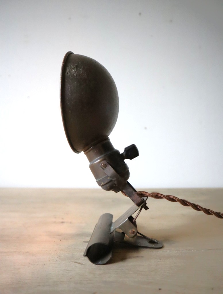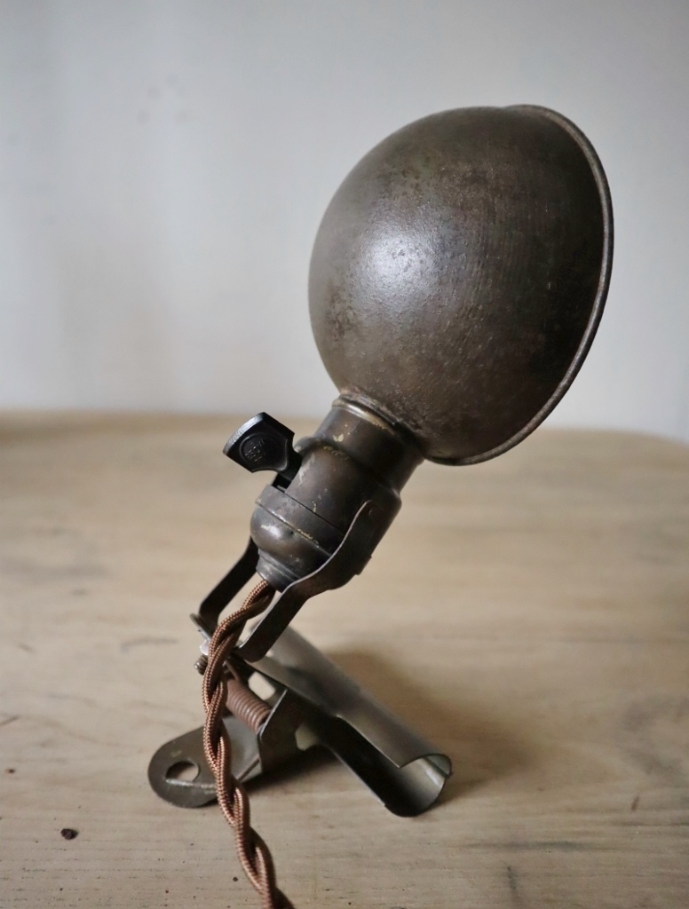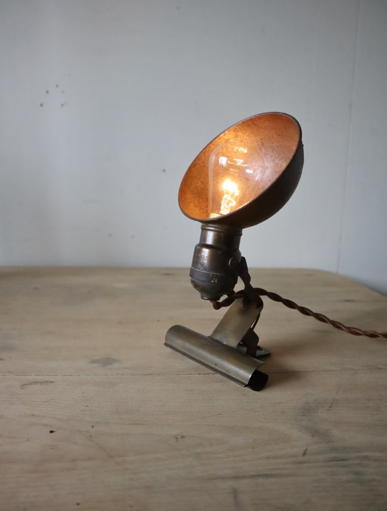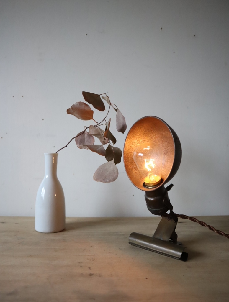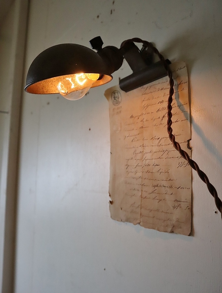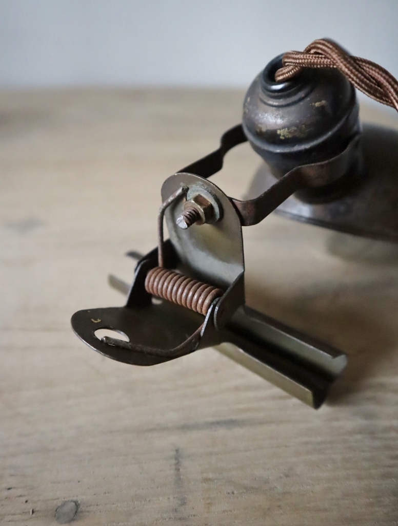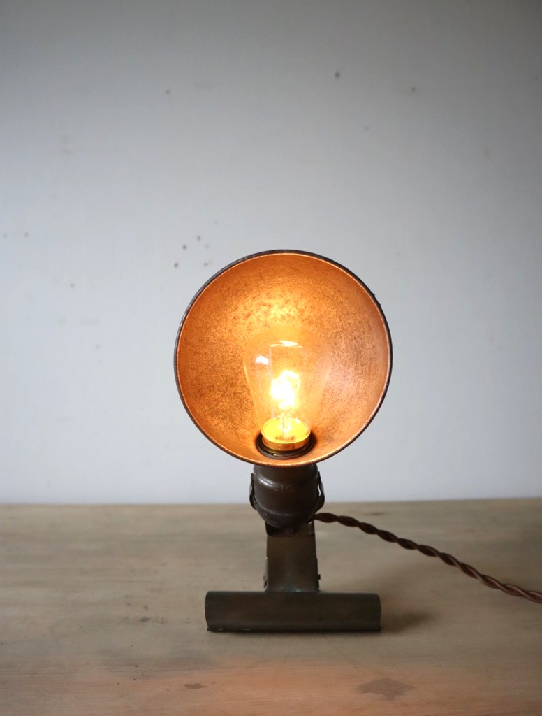 古い味のある小型のライトに、当方手持ちの真鍮のクリップ(コンドル印)を取り付けた3WAYライトになります。