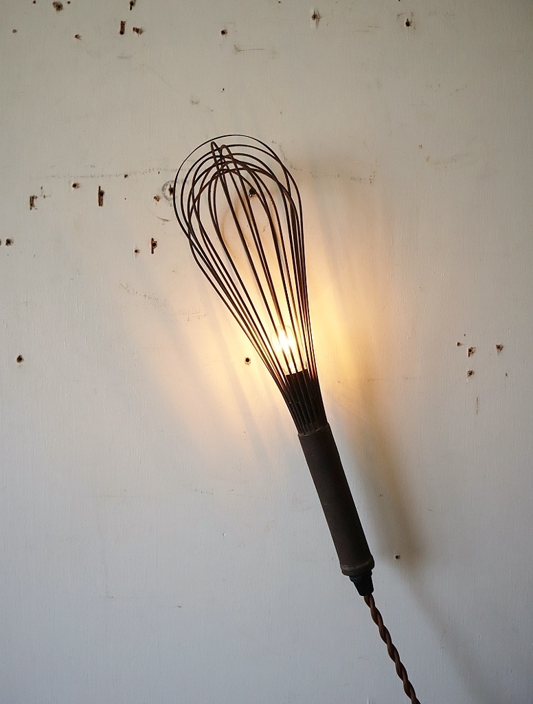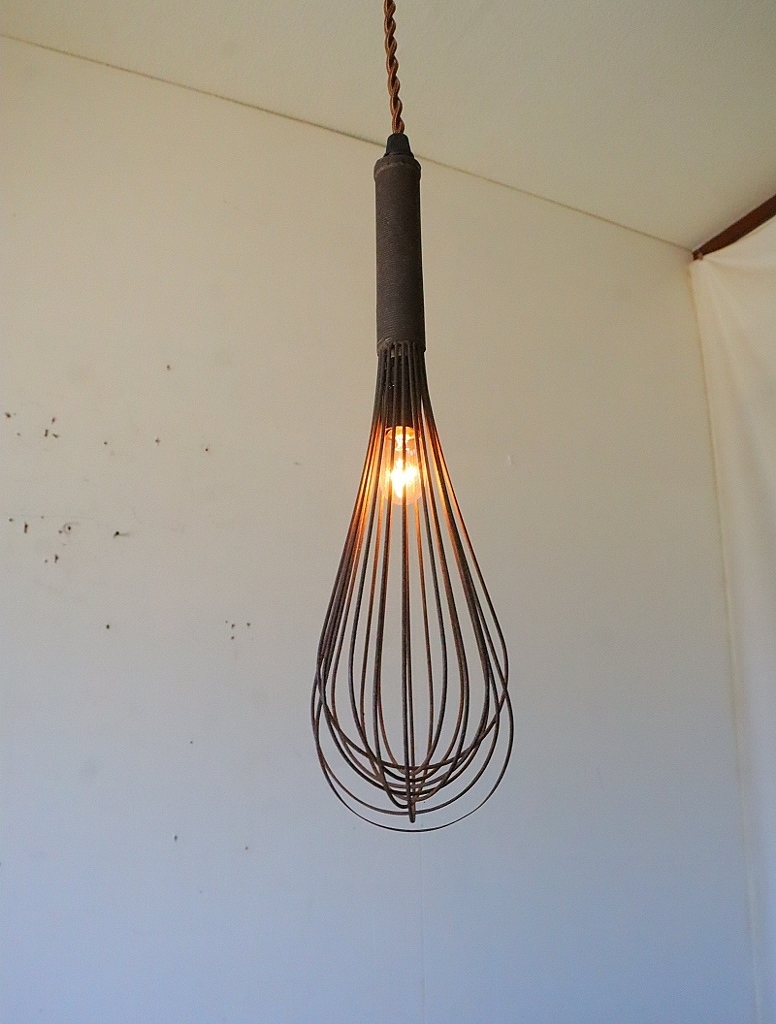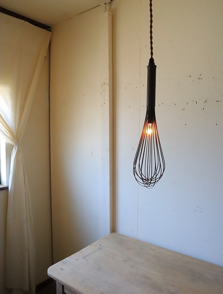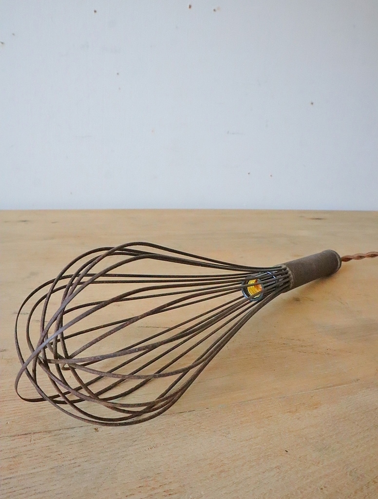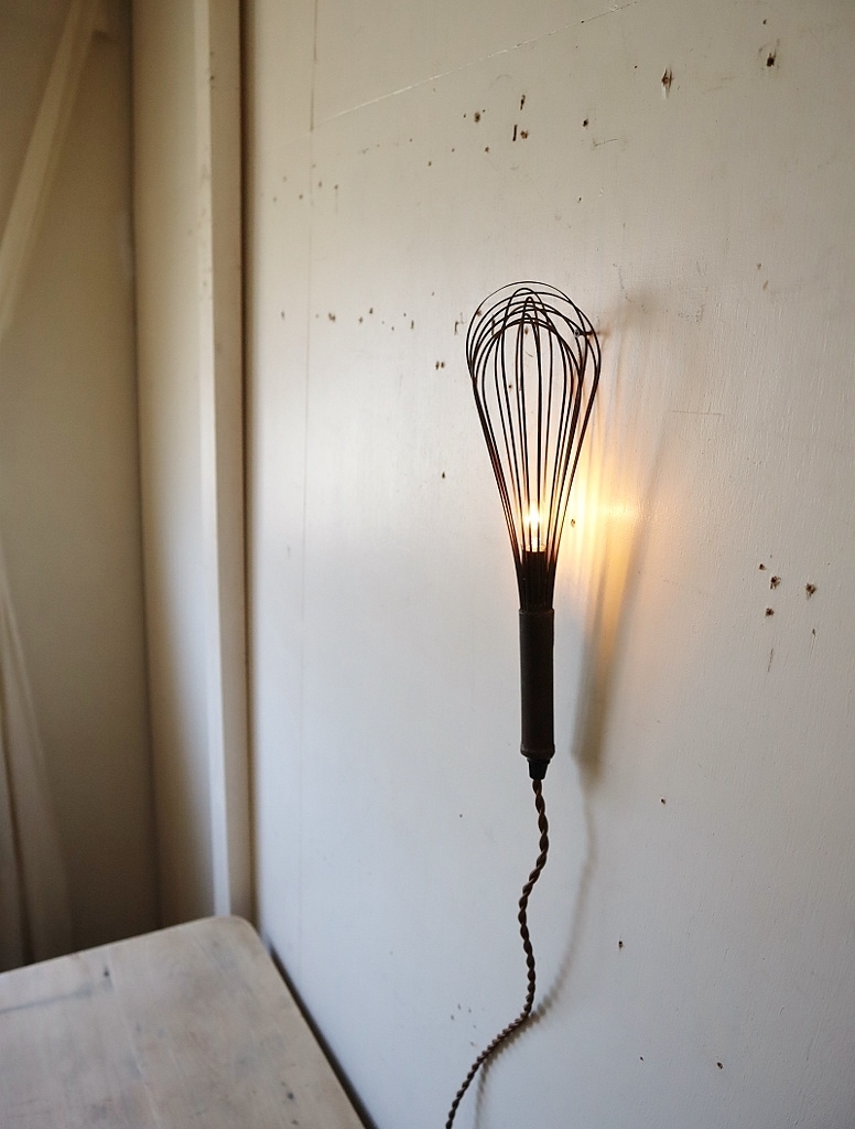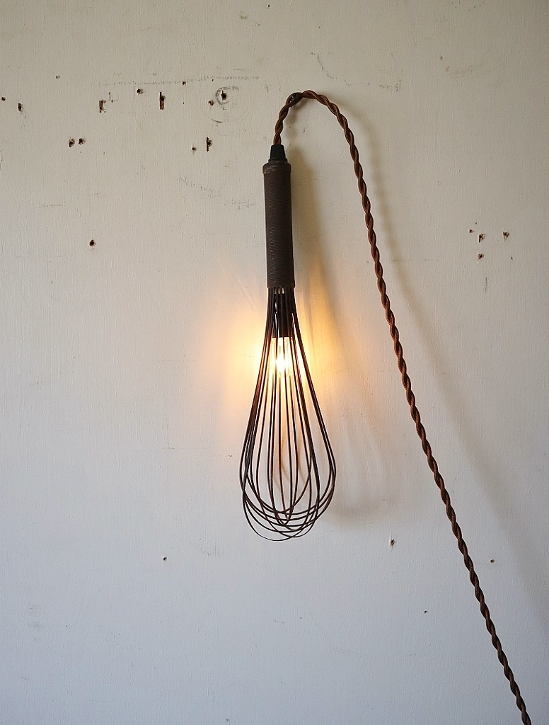 あまり見かけない味のある古い鉄製のホイッパーが手に入ったので、ソケットやコードを取り付けて吊り上げたり、壁に掛けたりと2通りの使い方が出来るライトに仕立てました。