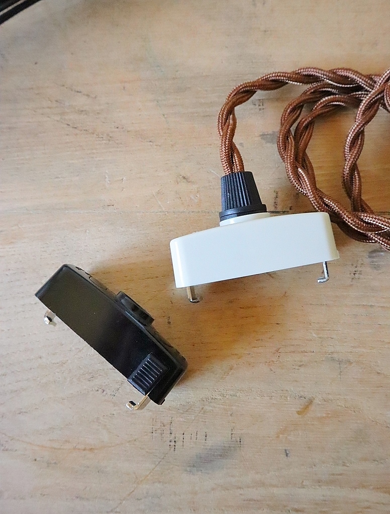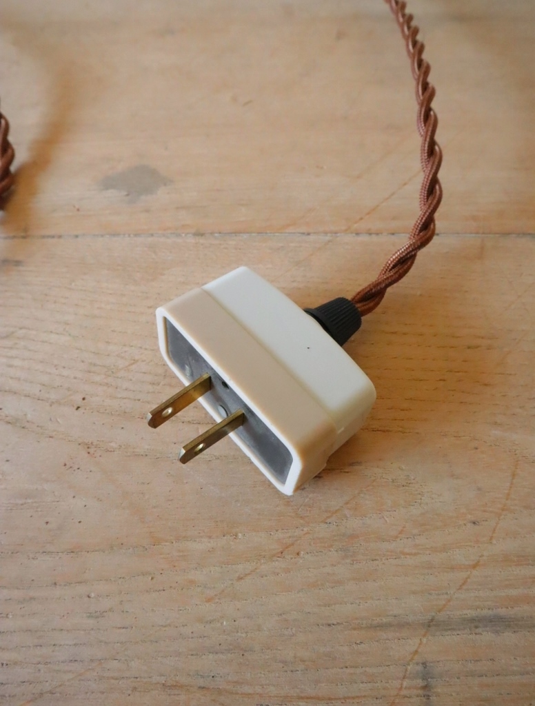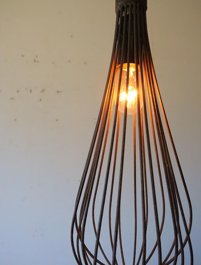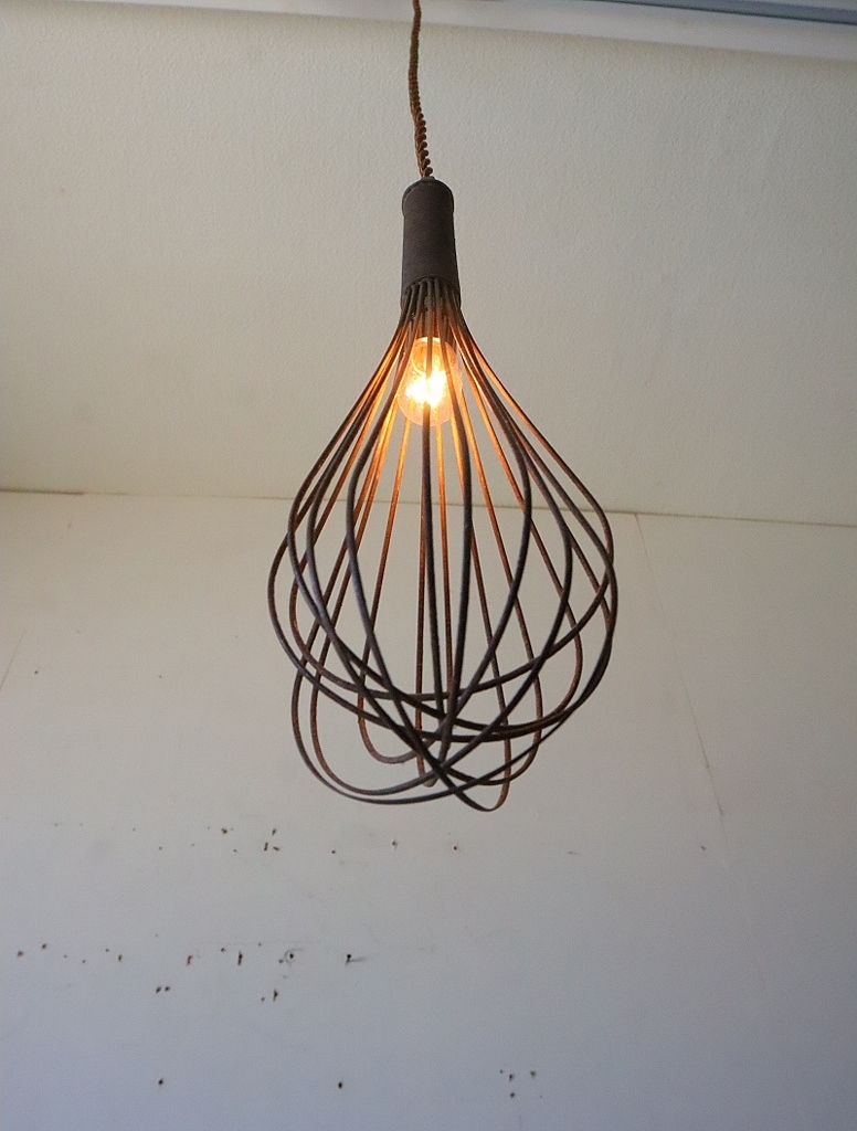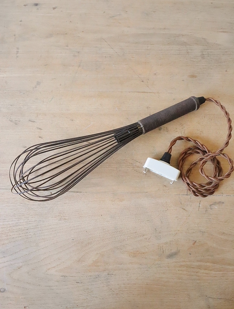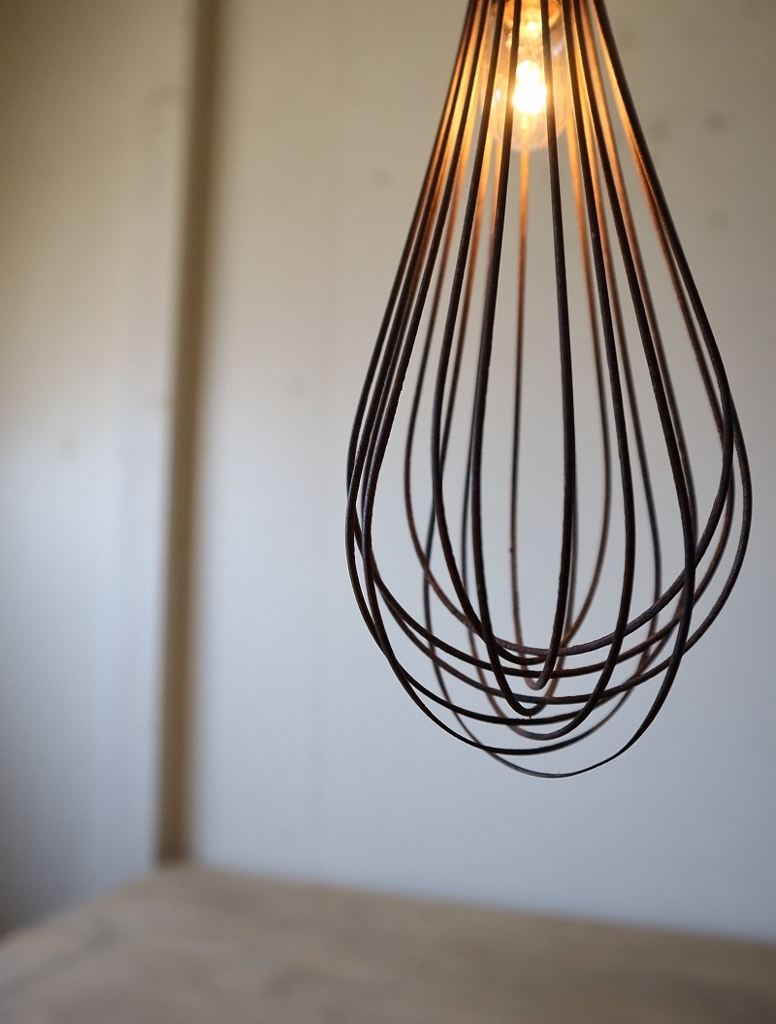 あまり見かけない味のある古い鉄製のホイッパーが手に入ったので、ソケットやコードを取り付けて吊り上げたり、壁に掛けたりと2通りの使い方が出来るライトに仕立てました。