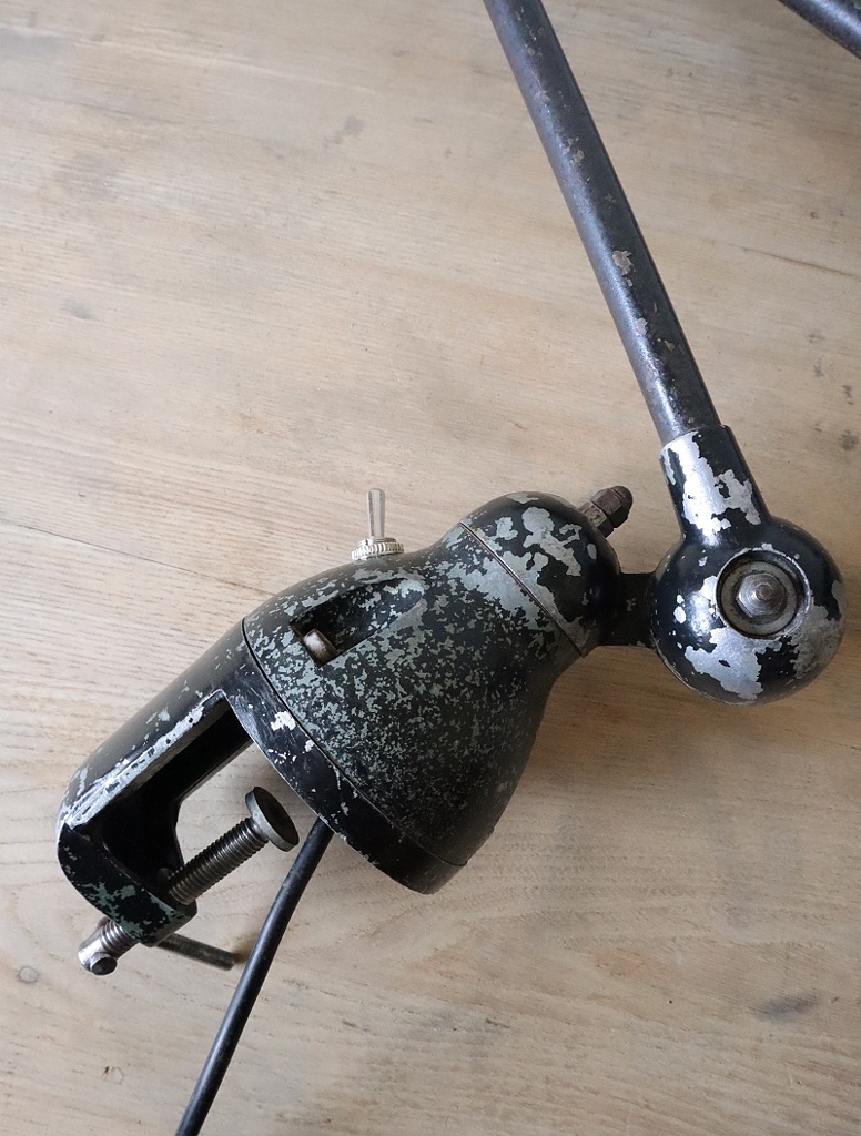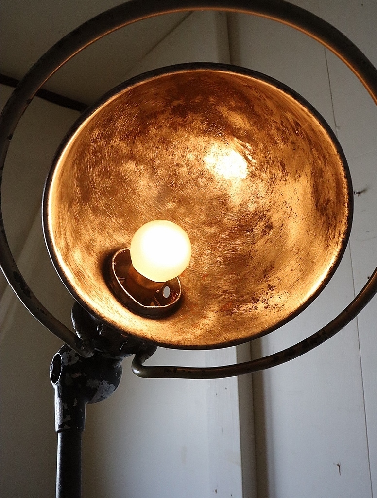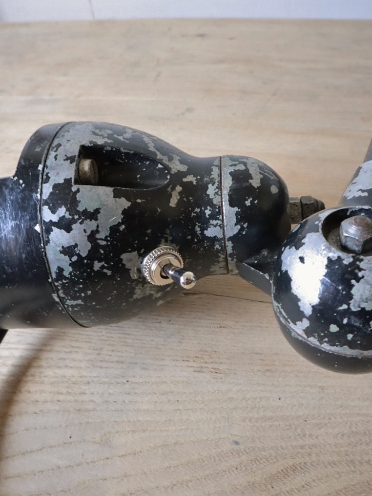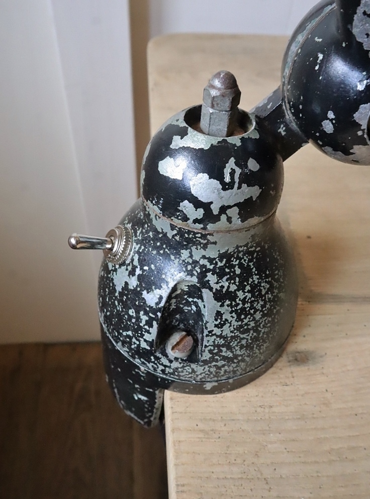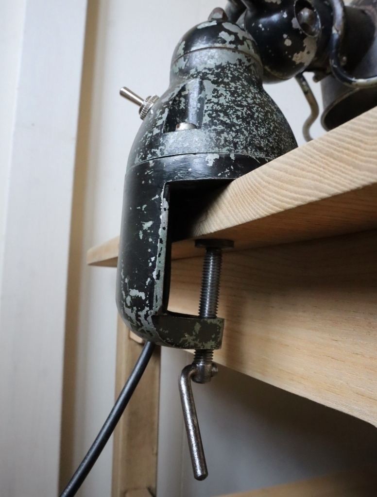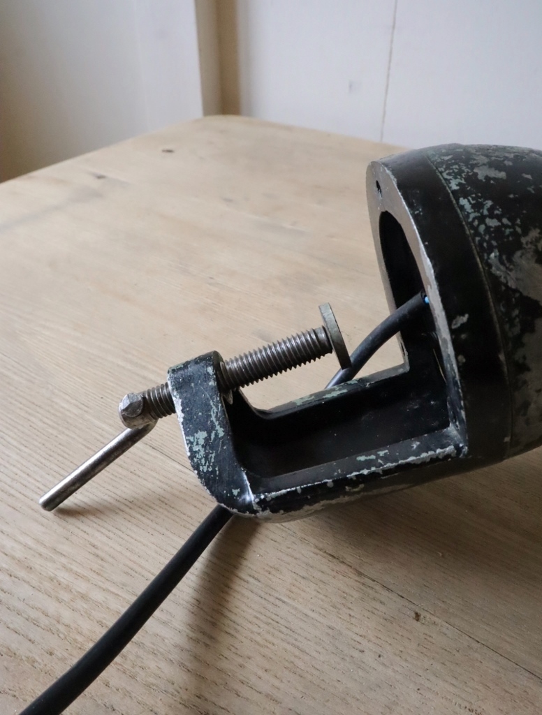 1950年代に造られたこちらのランプは、古い時代に黒い塗装が施された40cmのアーム(ボルトを通す穴から穴まで)が2本付いたモノになり、机やテーブルの端に固定して使える様にクランプ(万力)がついています。