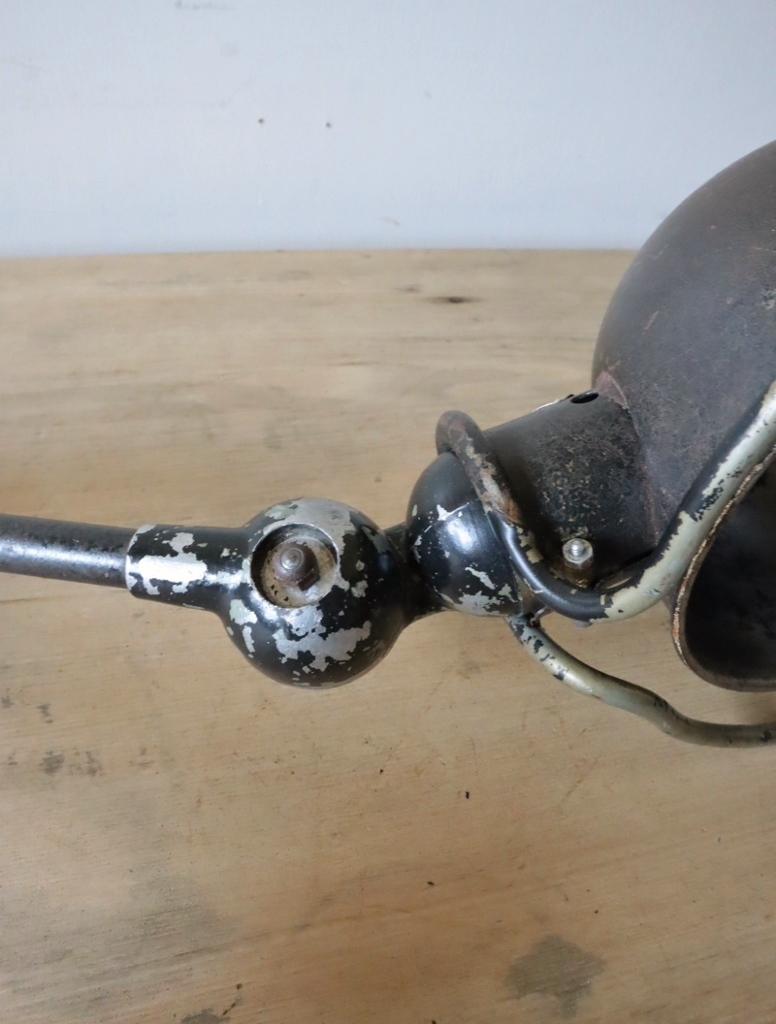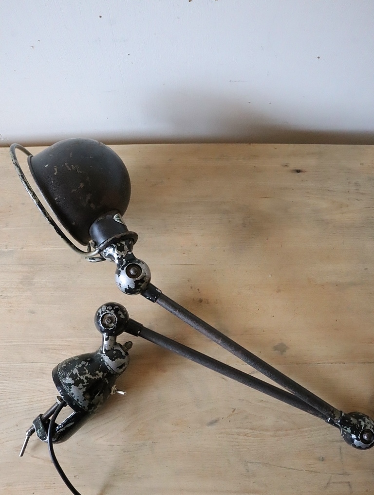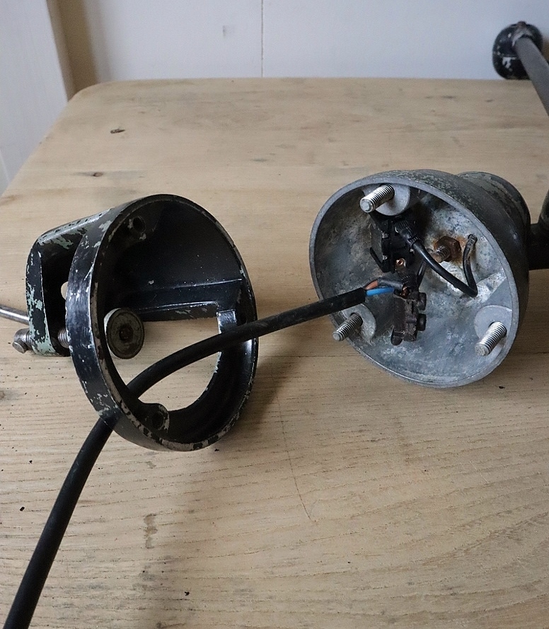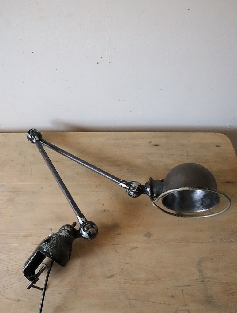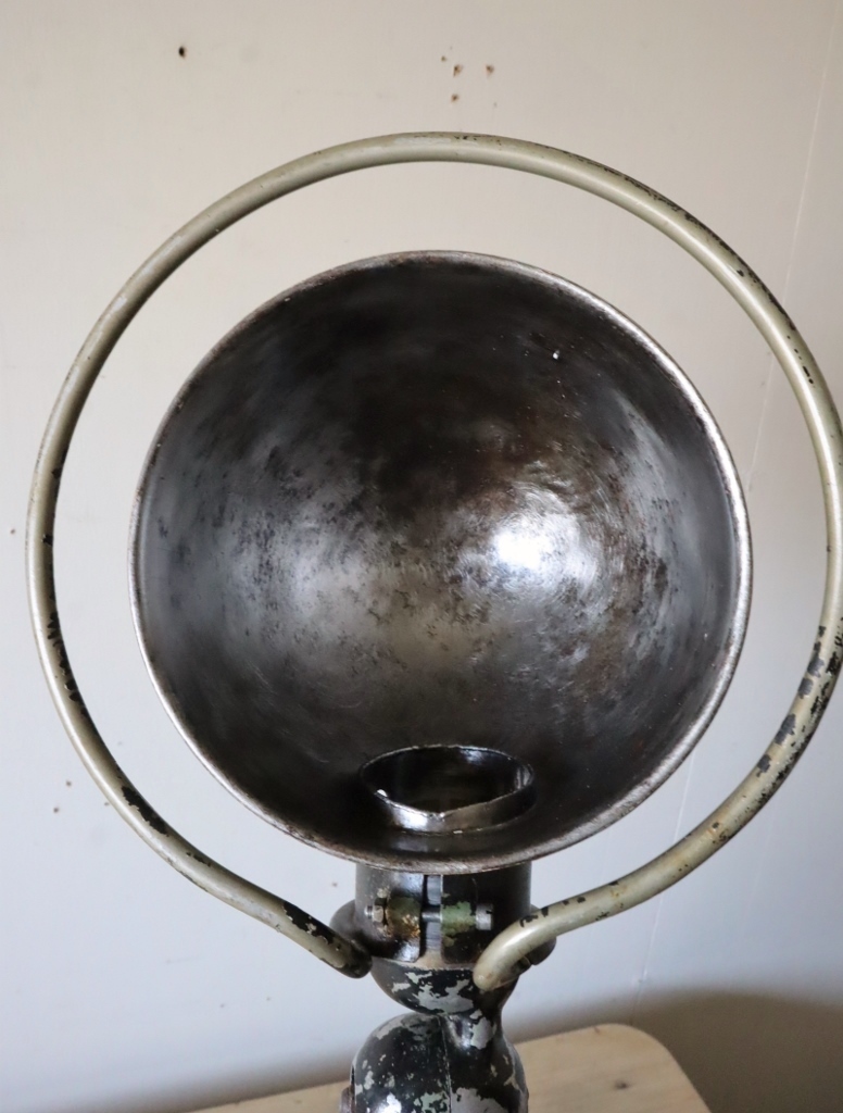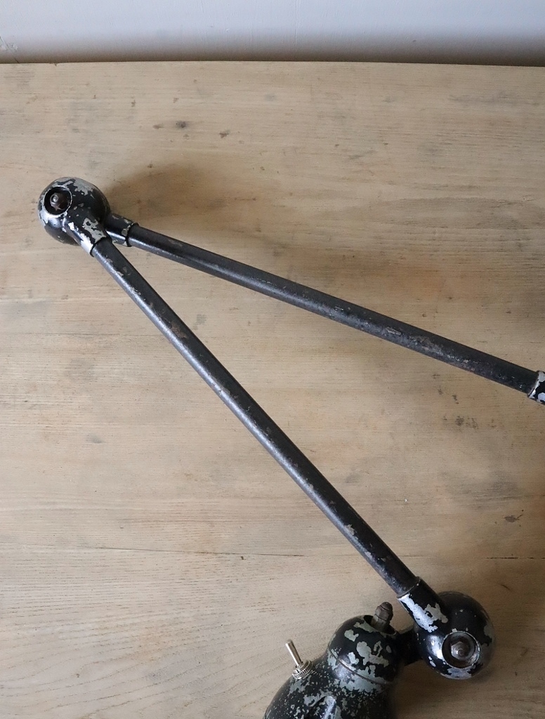 1950年代に造られたこちらのランプは、古い時代に黒い塗装が施された40cmのアーム(ボルトを通す穴から穴まで)が2本付いたモノになり、机やテーブルの端に固定して使える様にクランプ(万力)がついています。