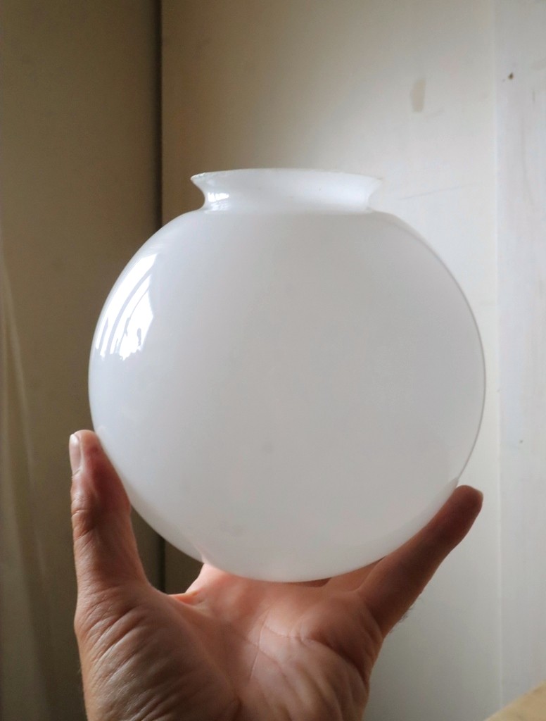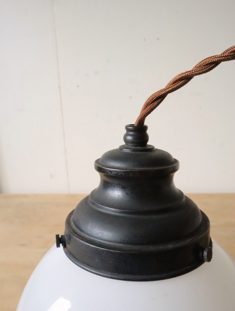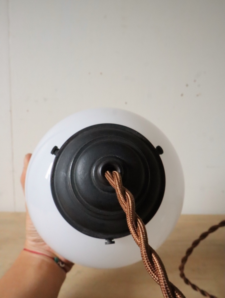 小ぶりなサイズの丸形の乳白ガラスのシェードが付いたペンダントライトになります。