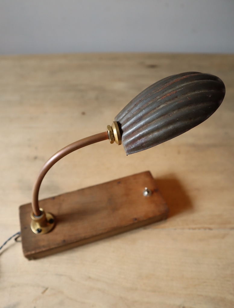 古いフランスのブリキ製のマドレーヌ型をシェードに見立て、活版印刷所で使われていた小型の文選箱と組み合わせて制作した古道具紫山オリジナルの照明になります。
