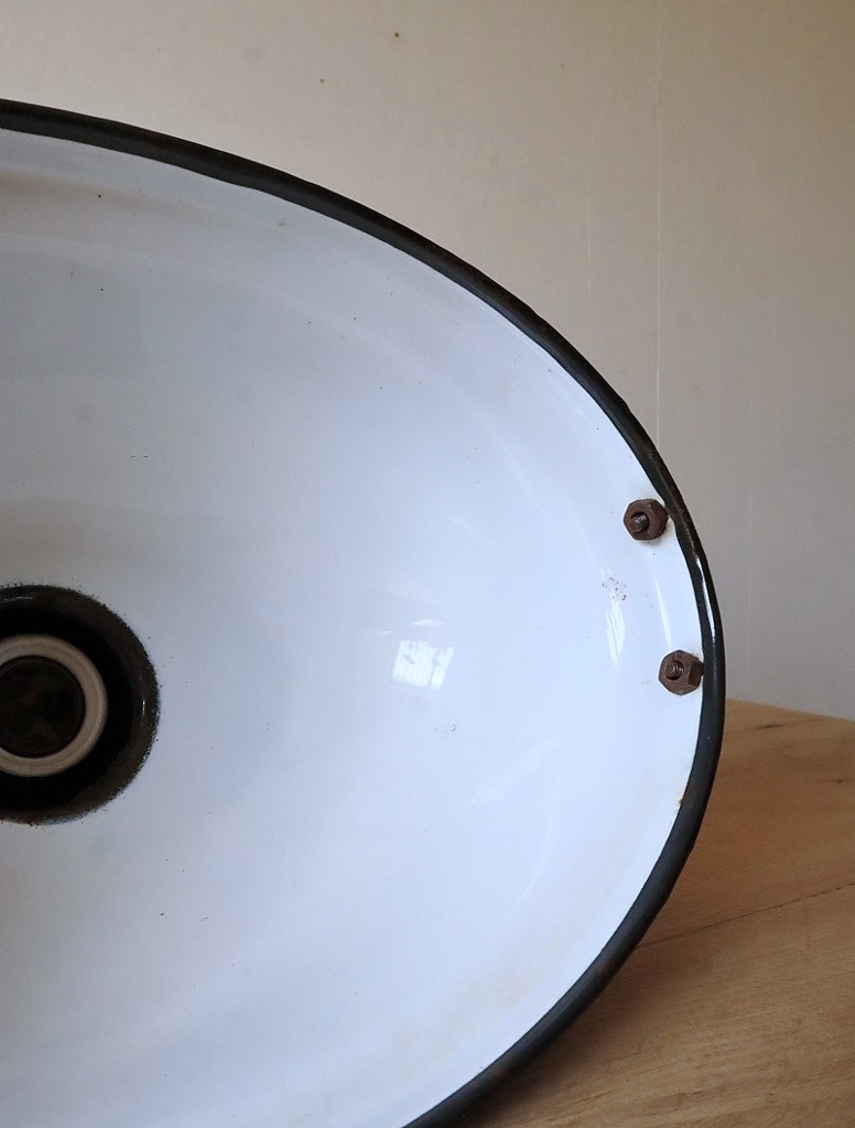 内側は白色の琺瑯、外側は黒色の琺瑯の上から黒色で再塗装されています。