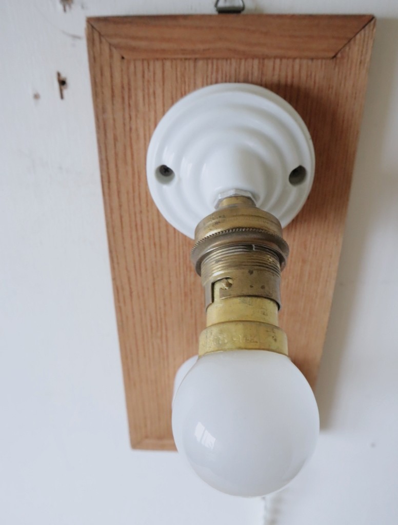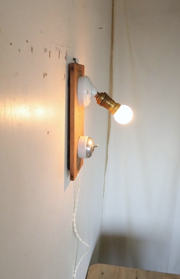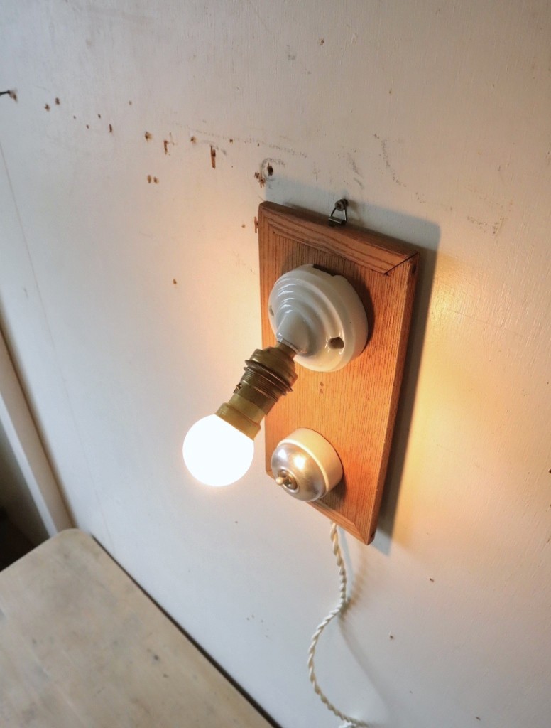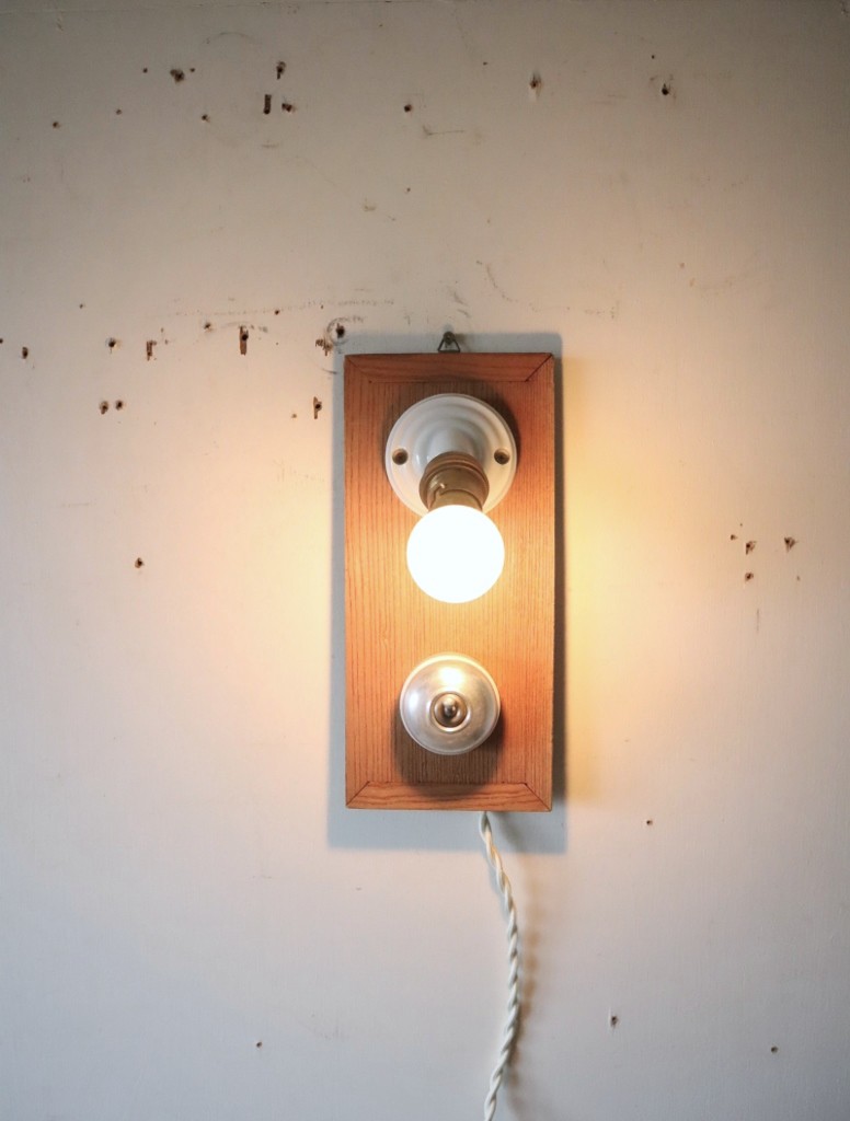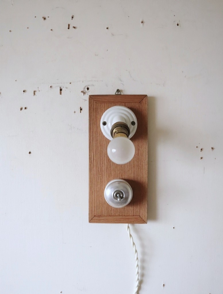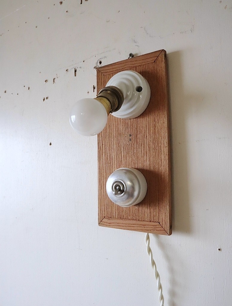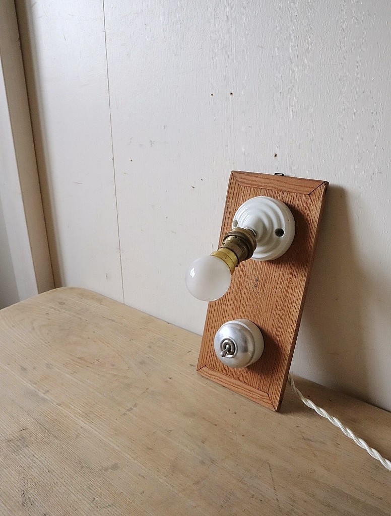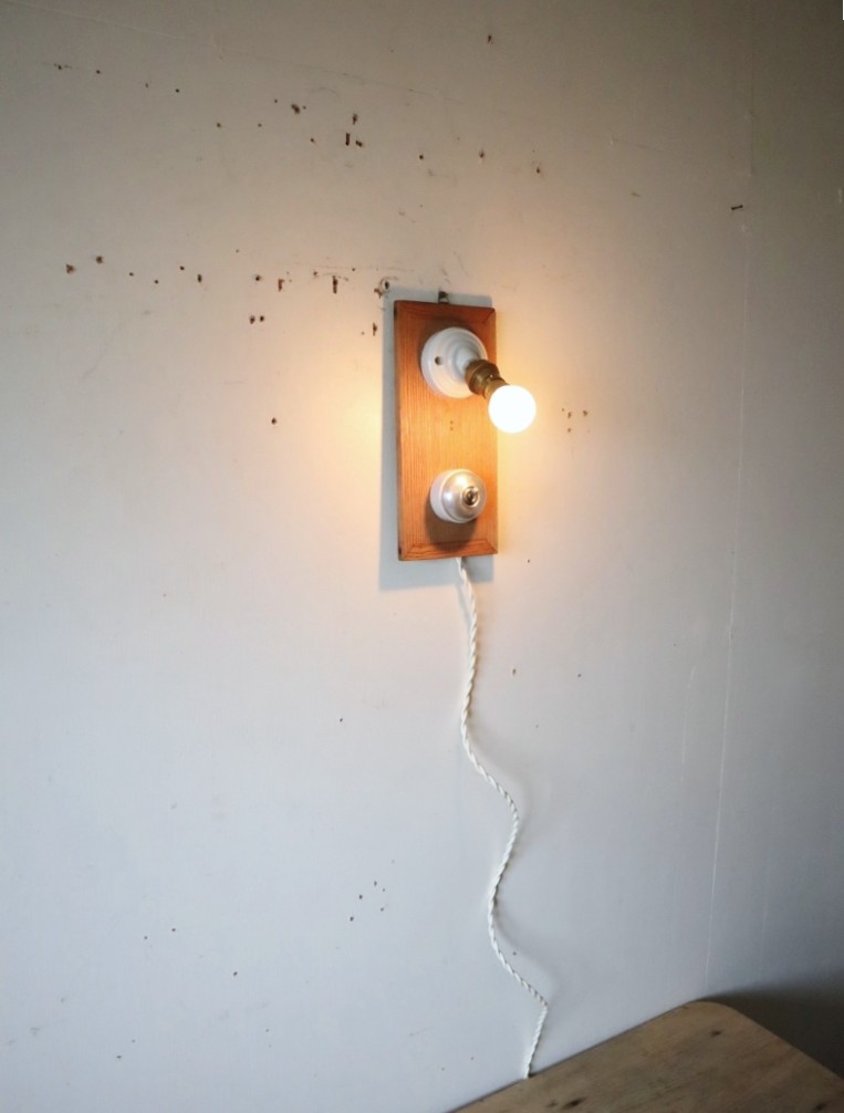 フランスの真鍮ソケットが斜めに付いた磁器製ブラケットライトとアルミ蓋のスイッチを古材に取り付けて制作した古道具紫山オリジナルの照明になります。