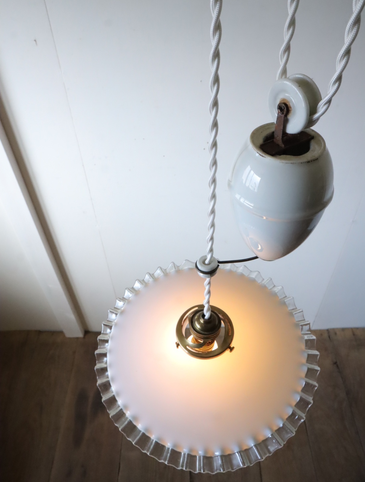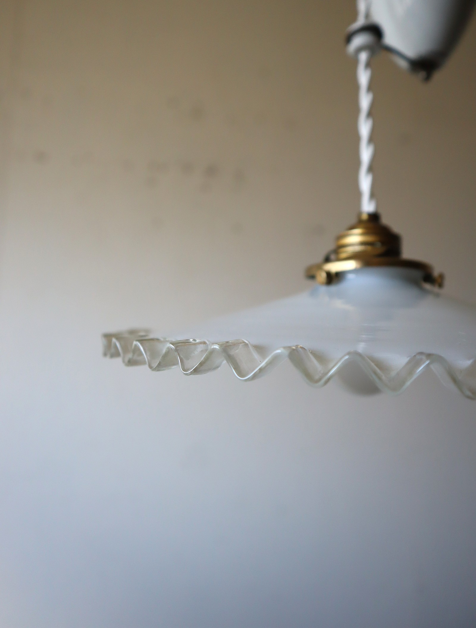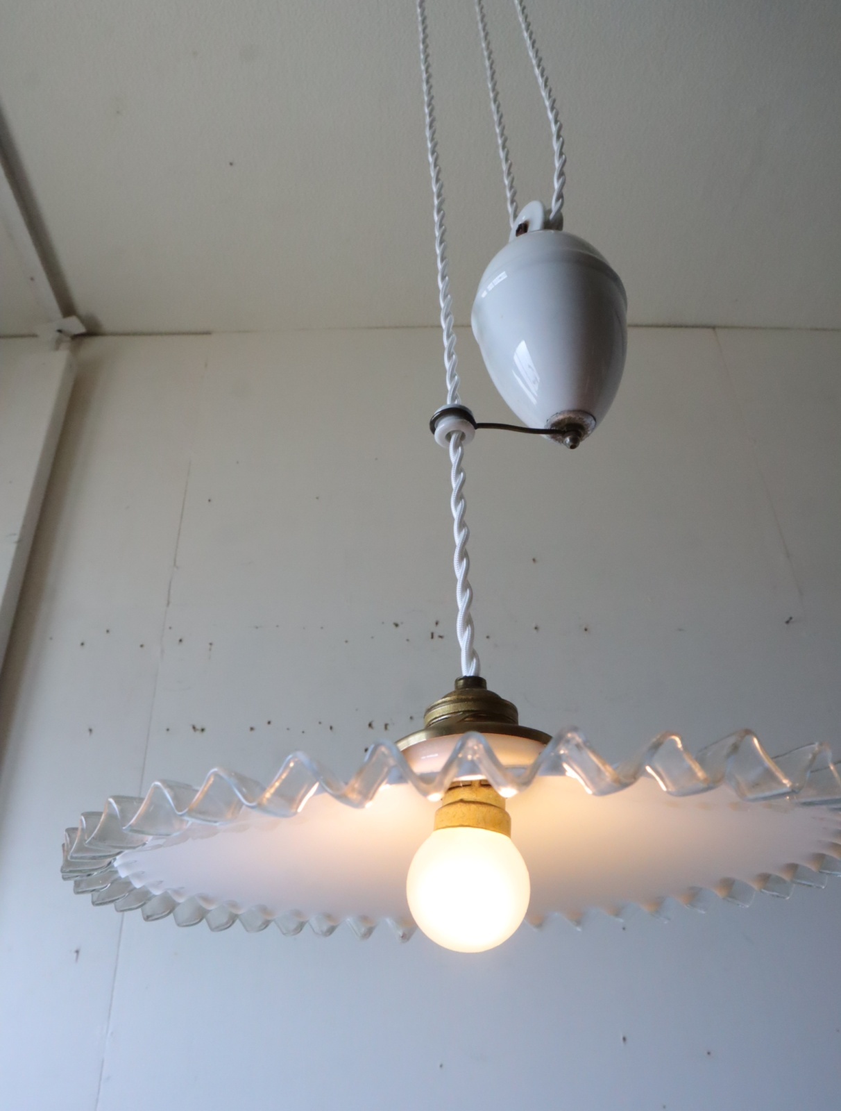 フランスの古いフリルシェードと磁器製の滑車を組み合わせたペンダントライトになります。