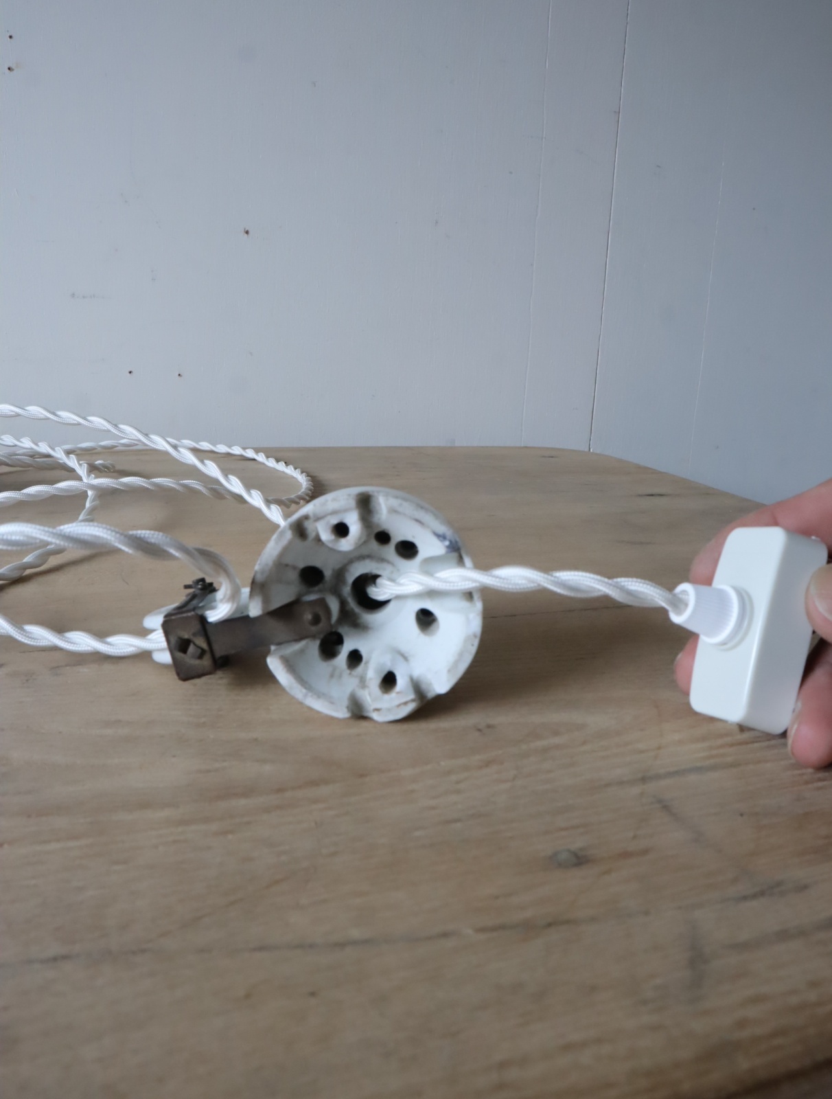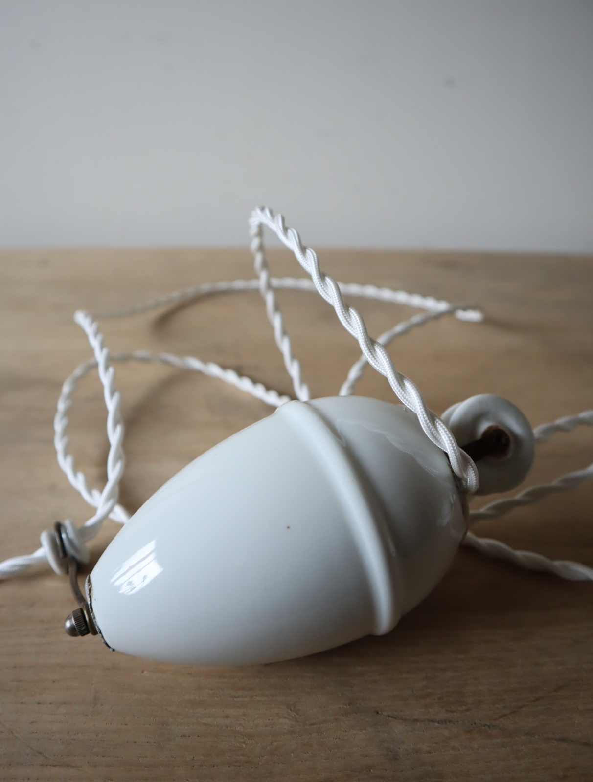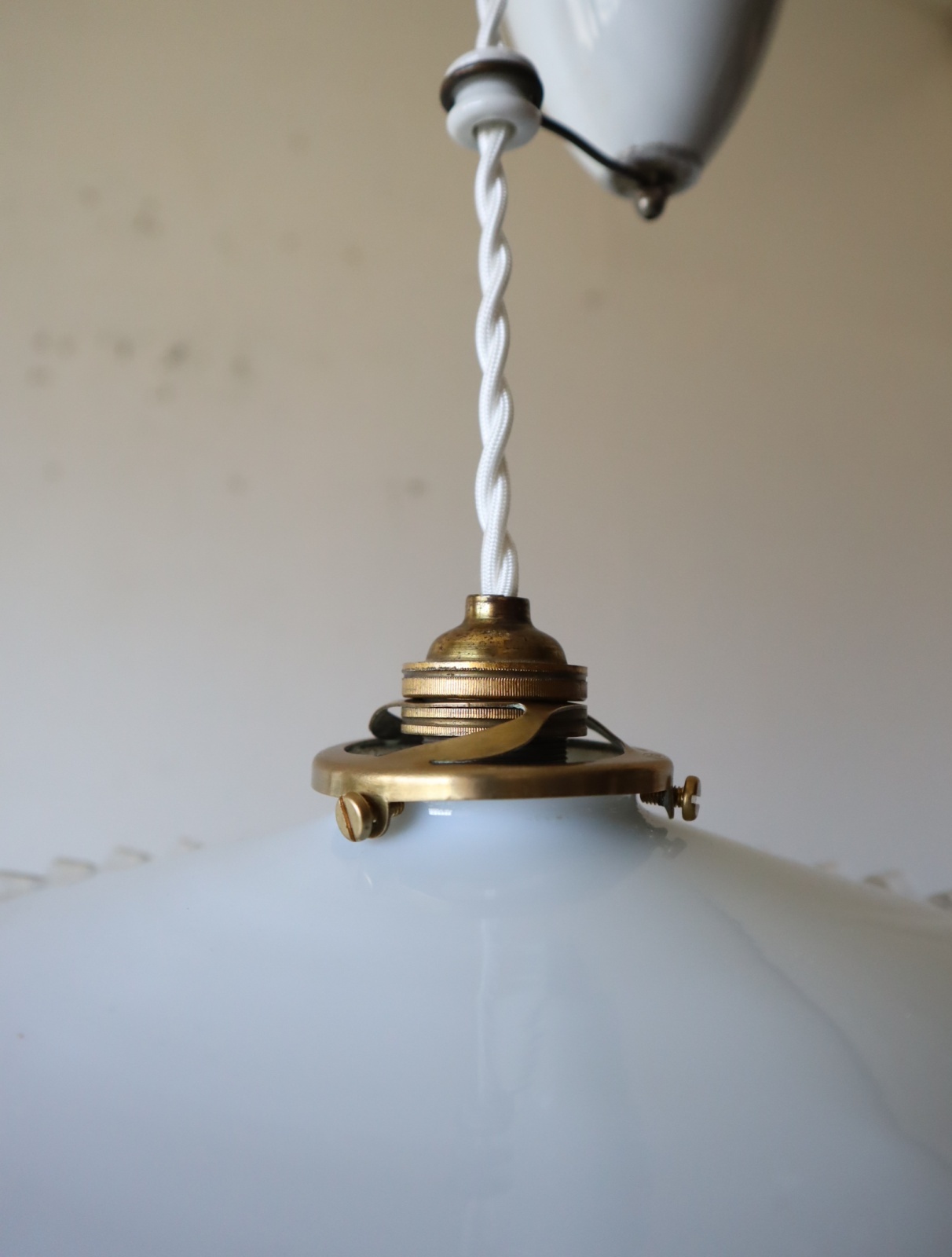 フランスの古いフリルシェードと磁器製の滑車を組み合わせたペンダントライトになります。