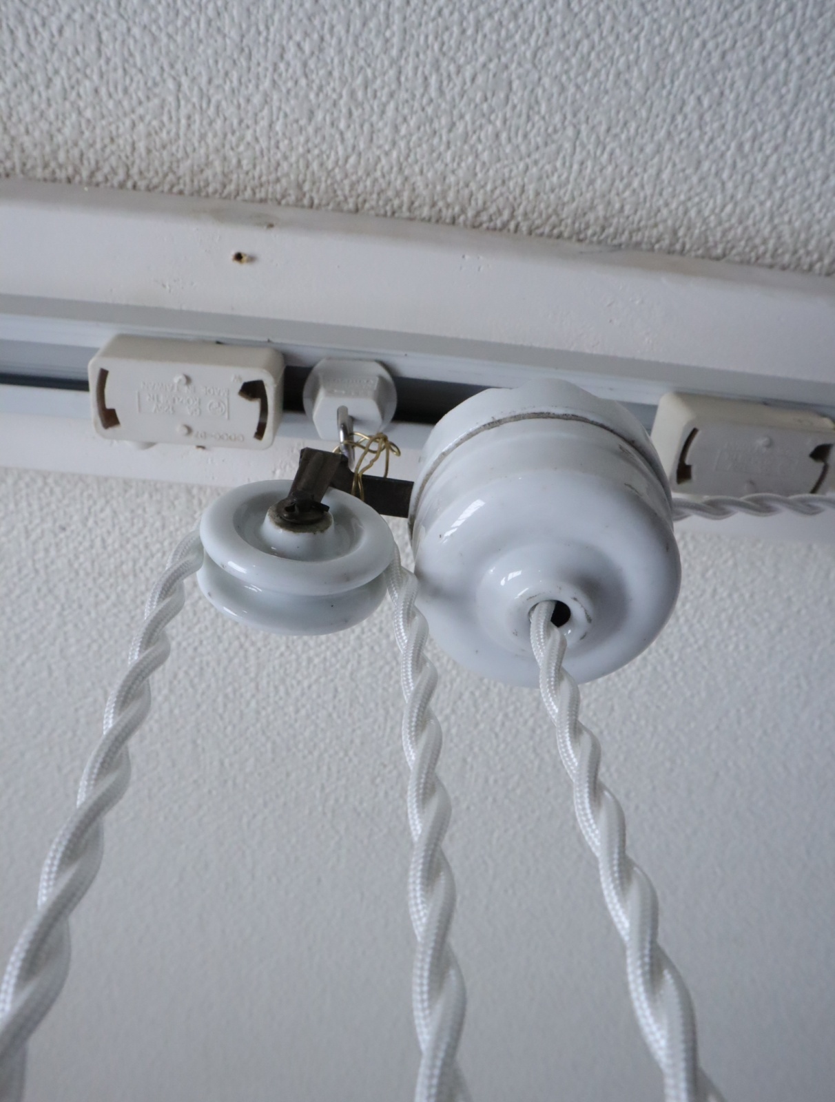ダクトレールで使用する際はダクトレール用のフックをローゼット一体型の滑車の金具に引っ掛けるなどしてお使いください。(最後の画像参照)