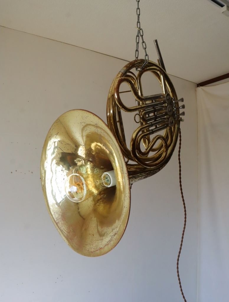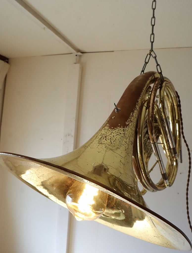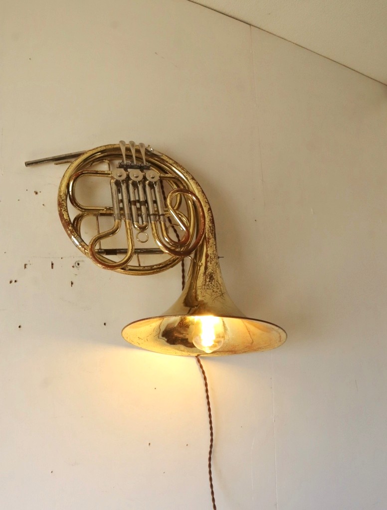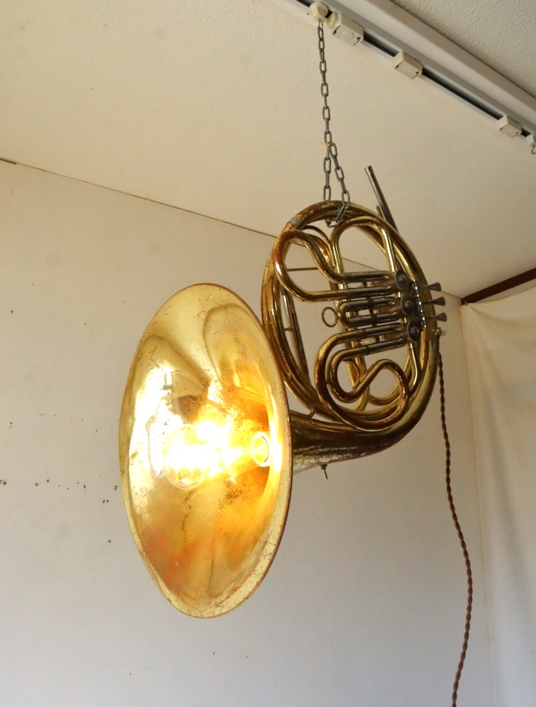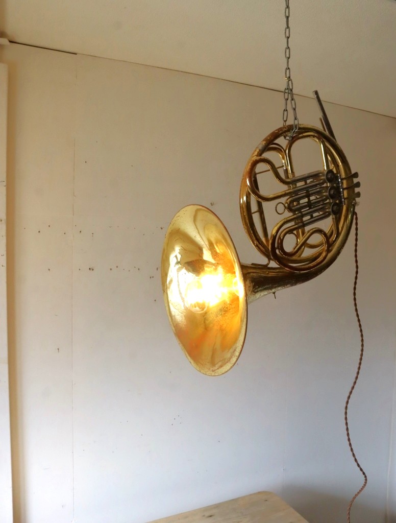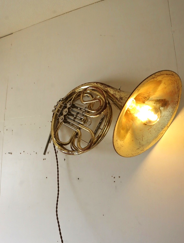 使われなくなった古いフレンチホルンを使い、ソケットやコードを配線し、吊り下げと壁掛けの2通りでお使い頂けるライトに仕立てました。