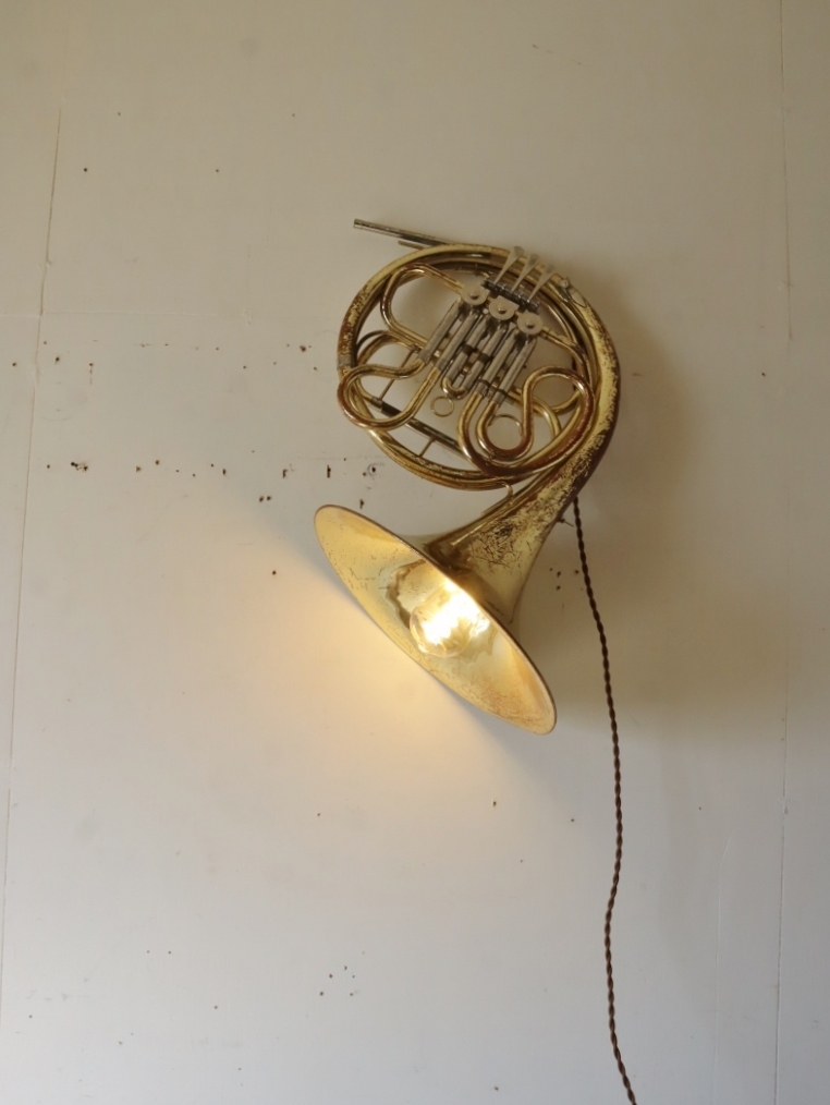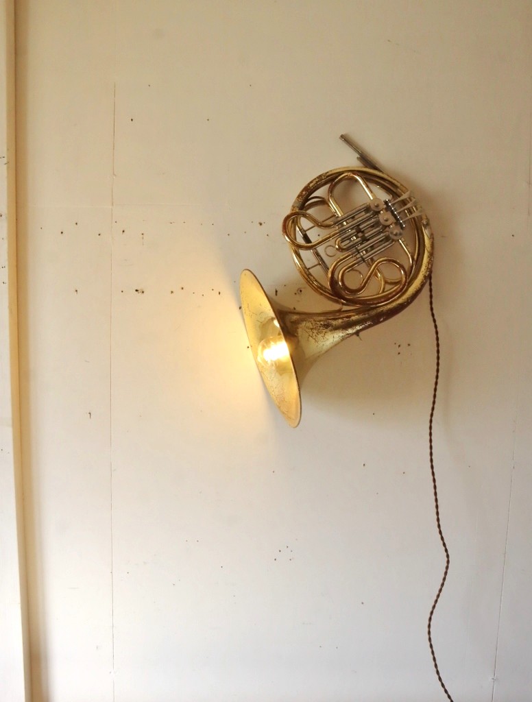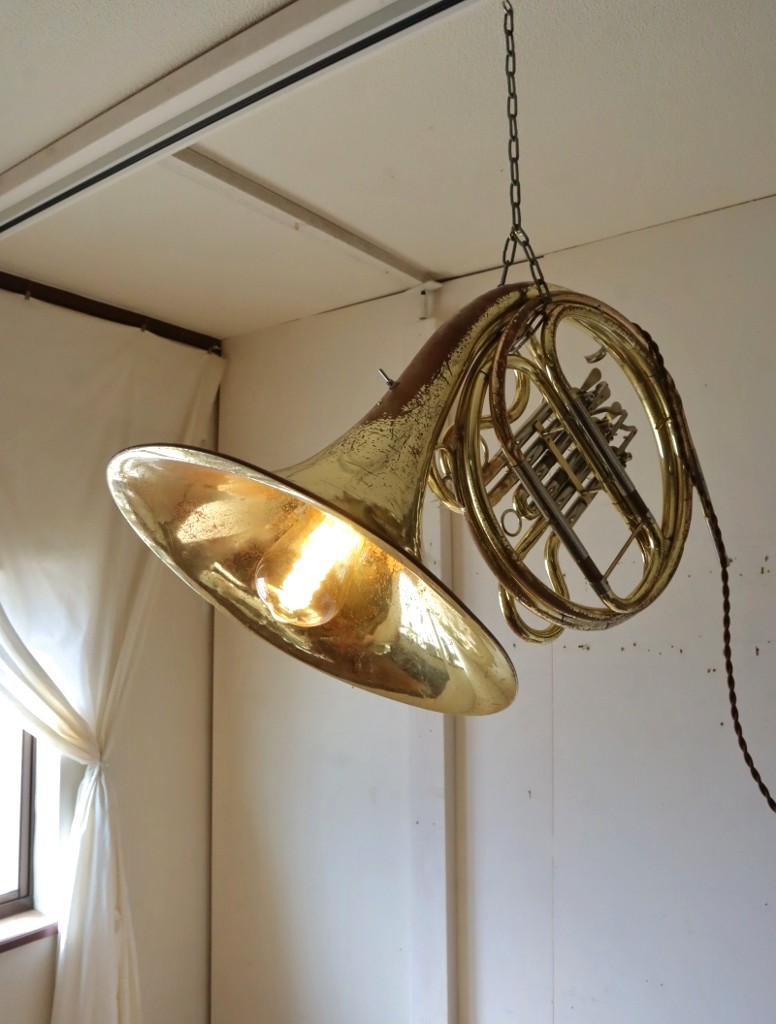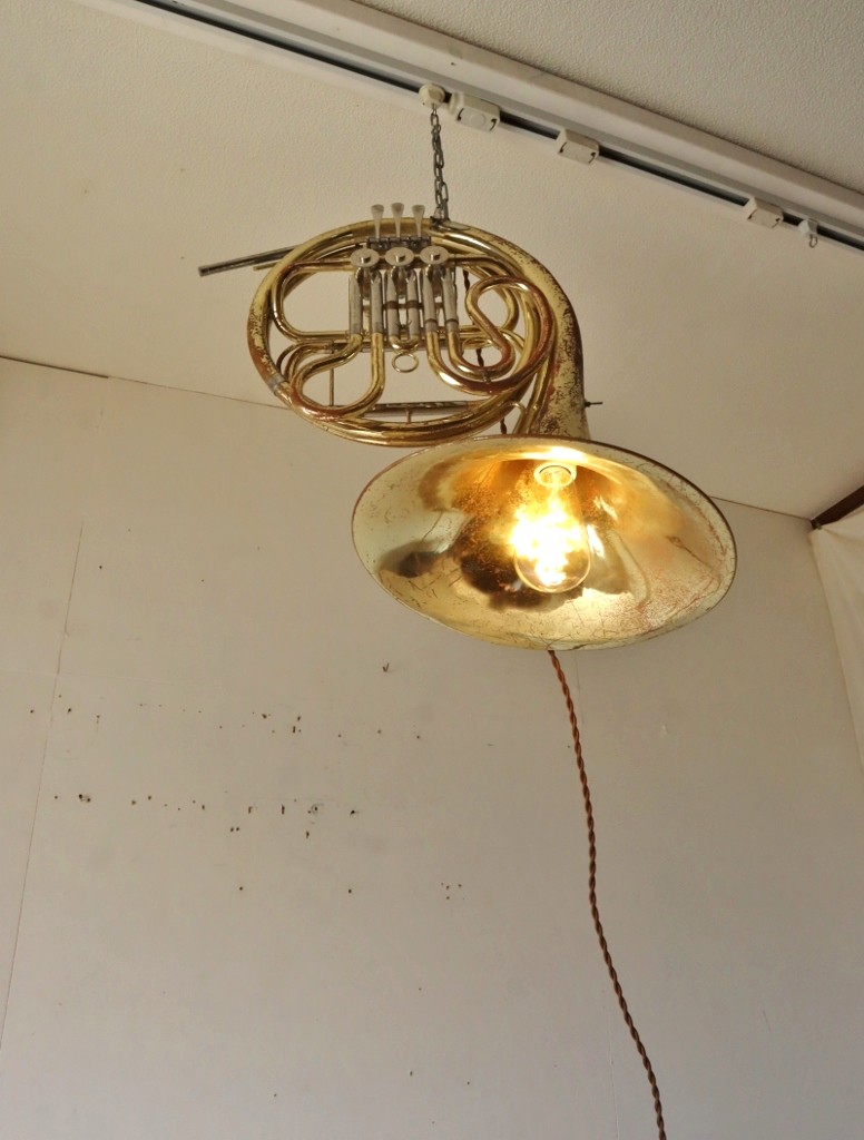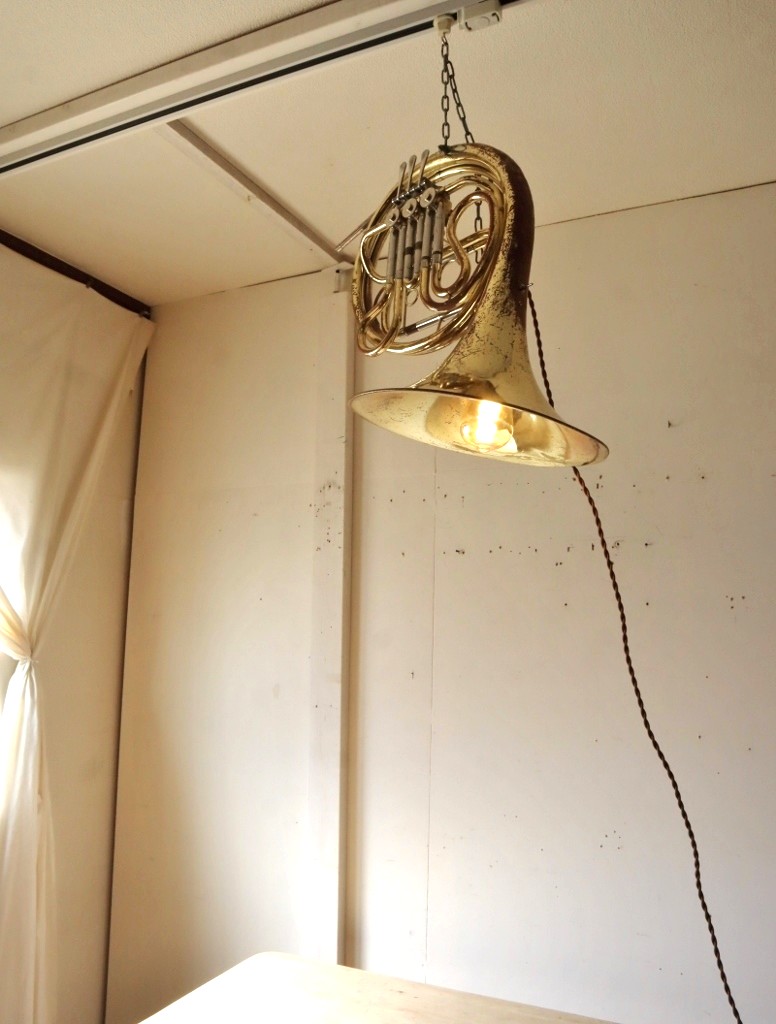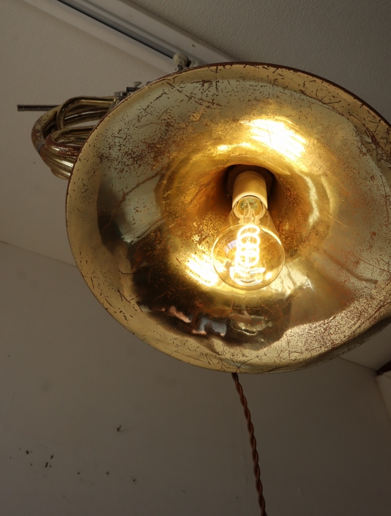 使われなくなった古いフレンチホルンを使い、ソケットやコードを配線し、吊り下げと壁掛けの2通りでお使い頂けるライトに仕立てました。