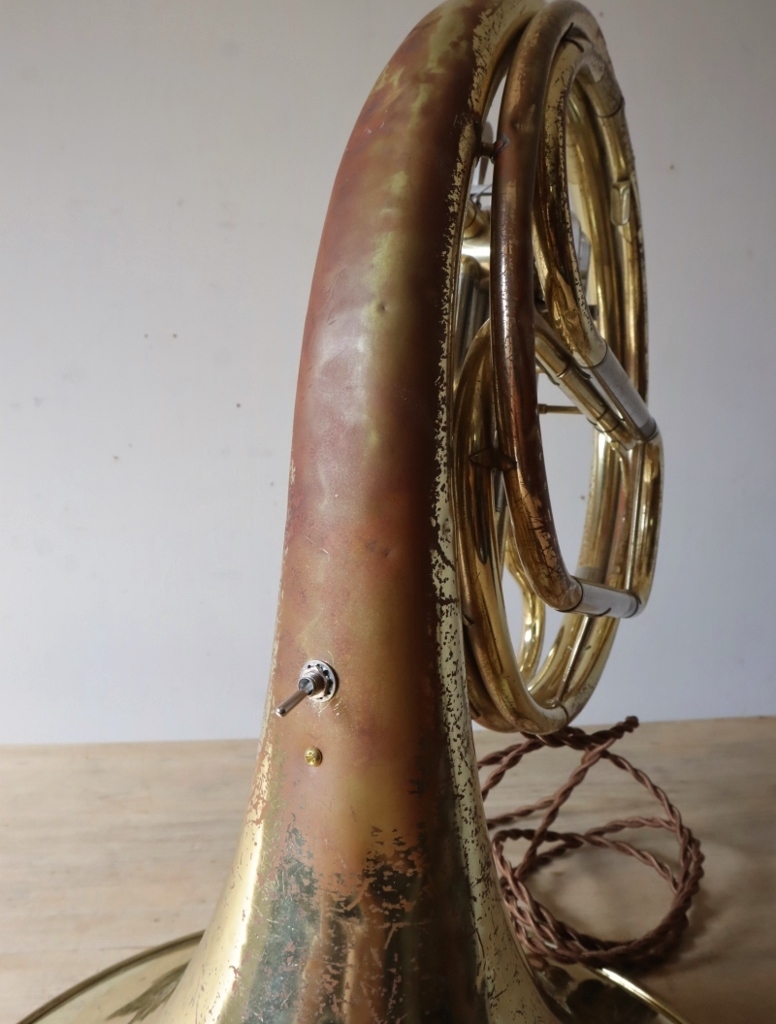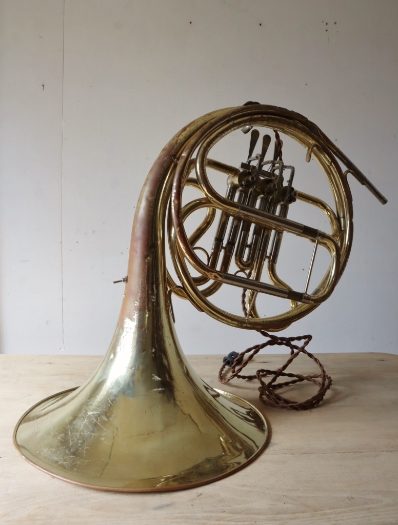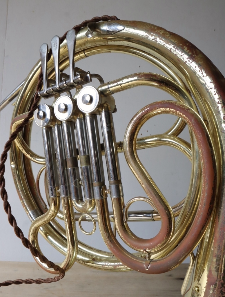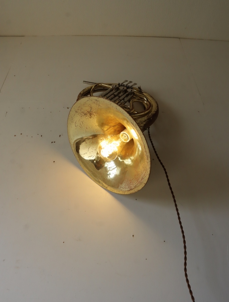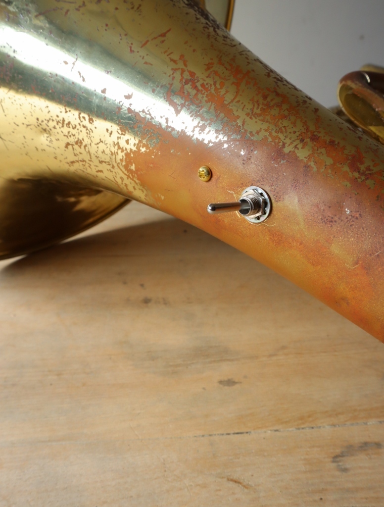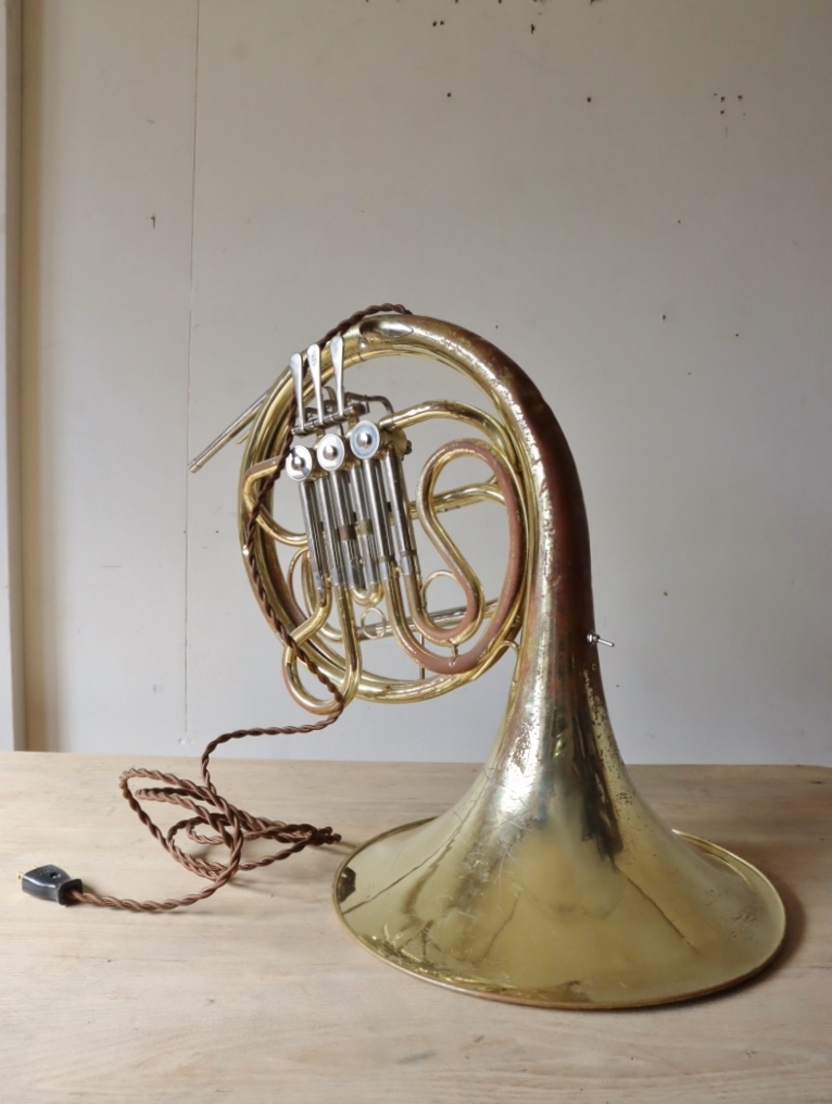 使われなくなった古いフレンチホルンを使い、ソケットやコードを配線し、吊り下げと壁掛けの2通りでお使い頂けるライトに仕立てました。