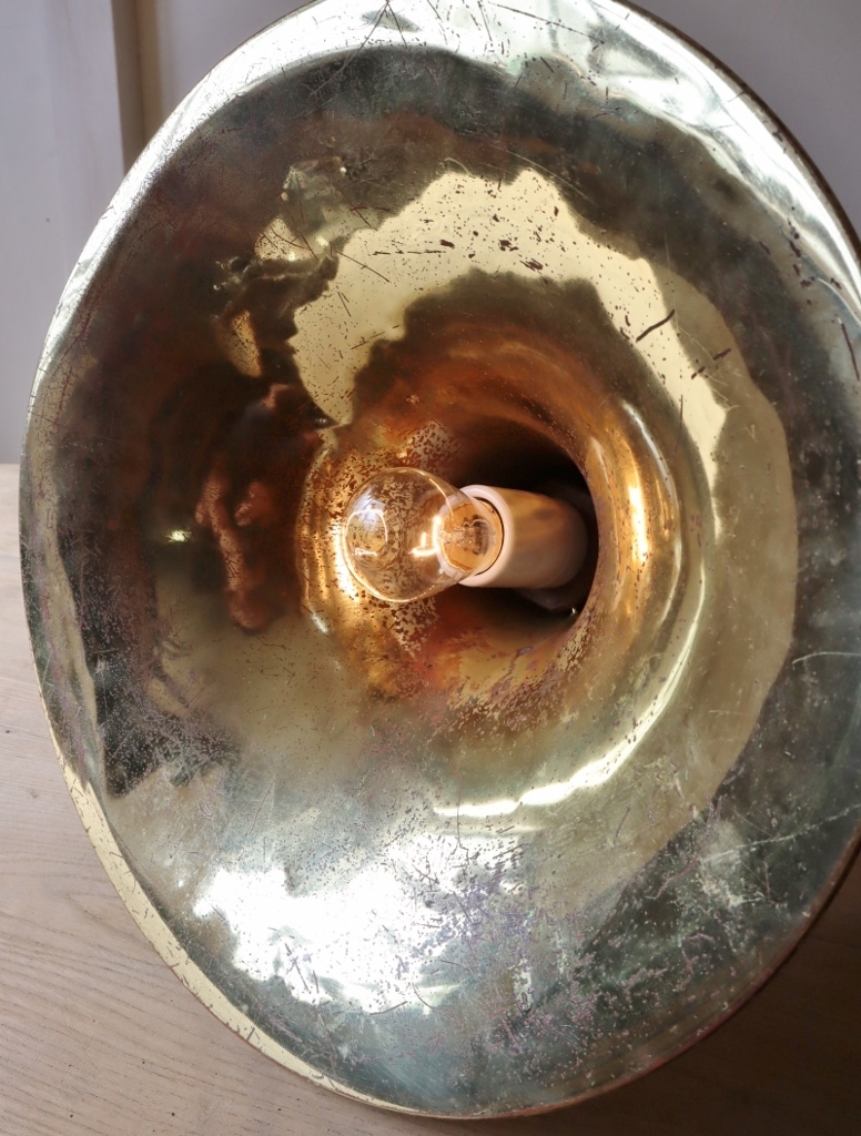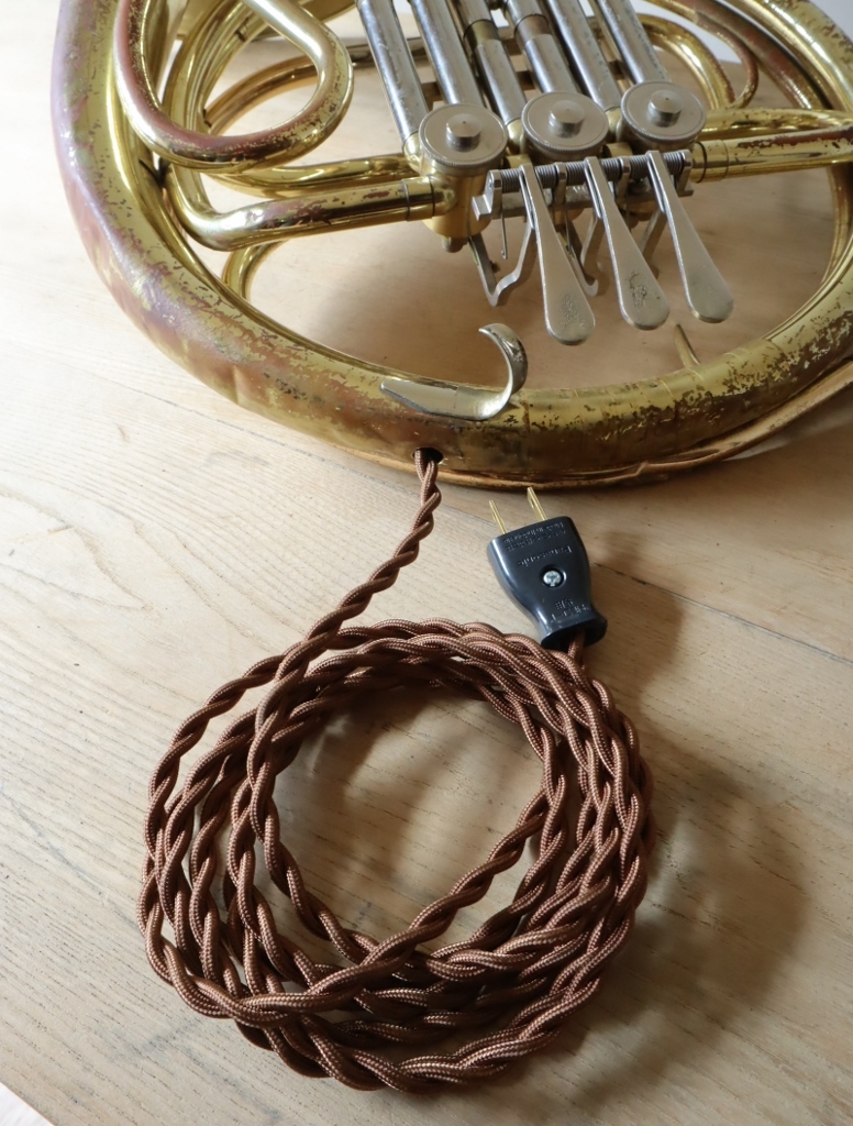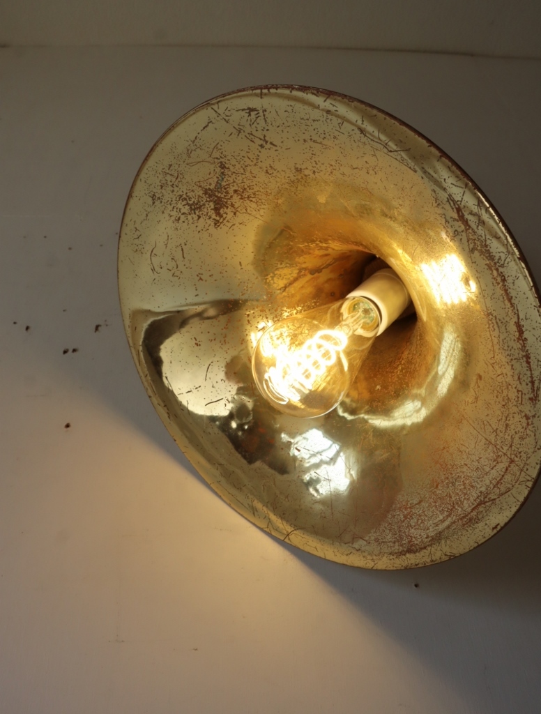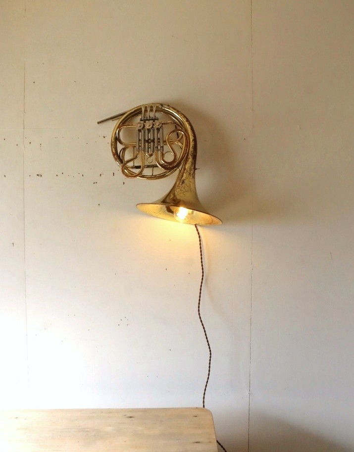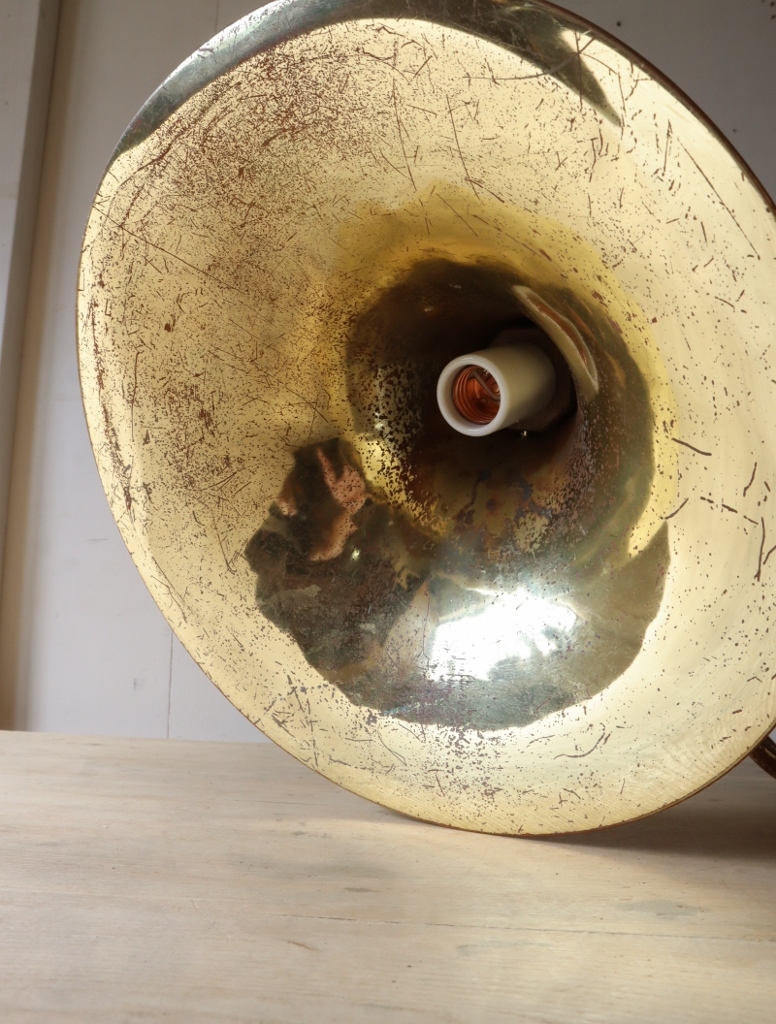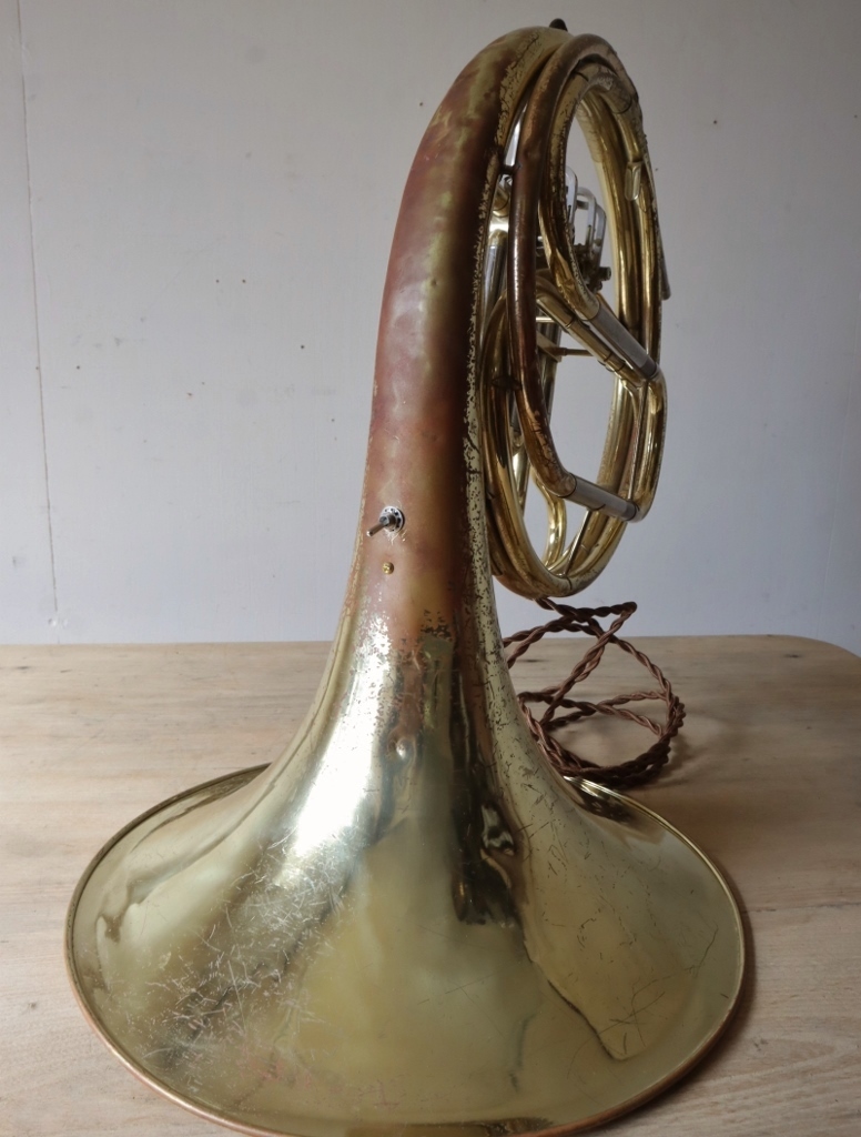 使われなくなった古いフレンチホルンを使い、ソケットやコードを配線し、吊り下げと壁掛けの2通りでお使い頂けるライトに仕立てました。