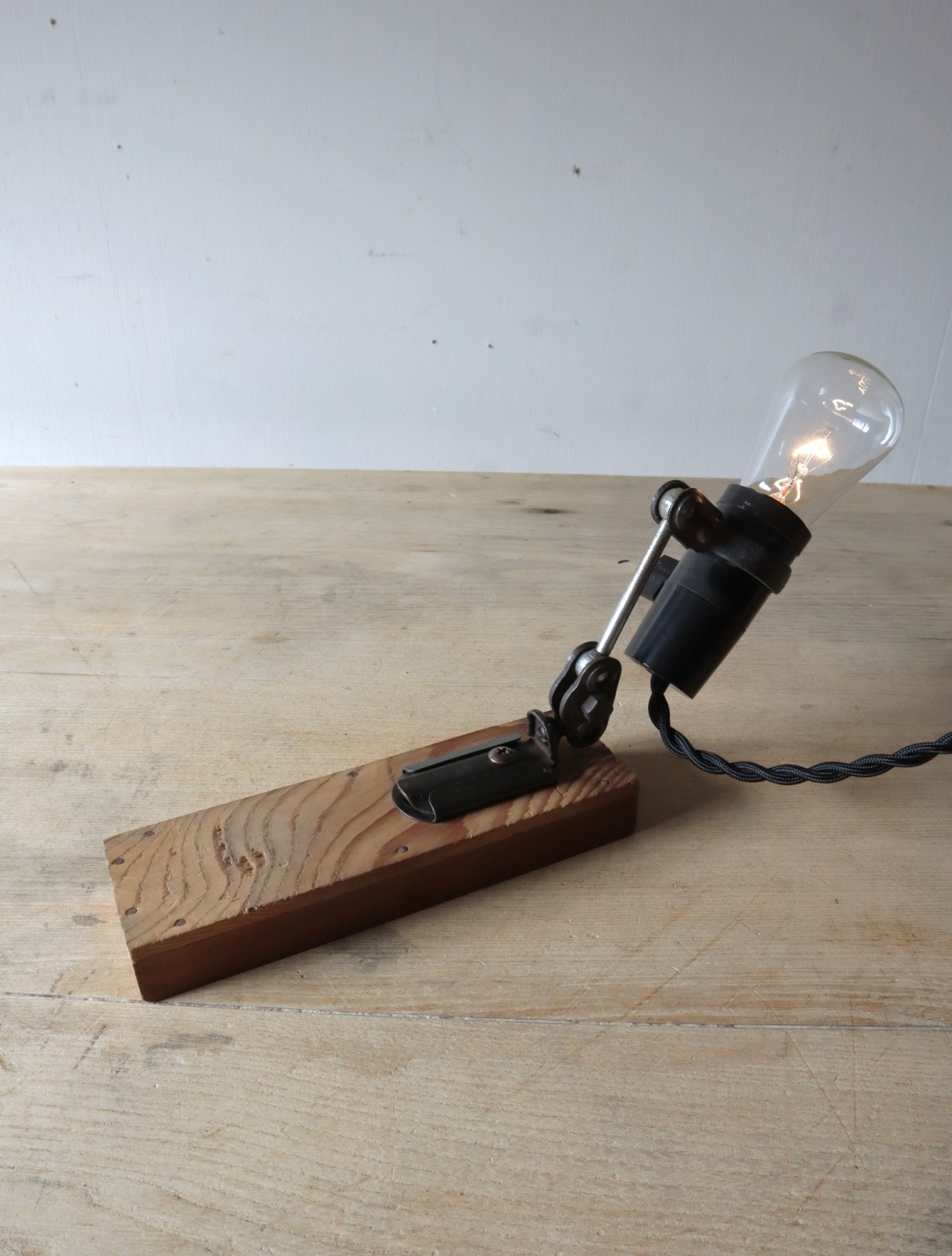 古いOKUSUN製のミシンランプと活版印刷所で使われていた木製の文選箱を取り付けて小型のスタンドライトに仕立てました。