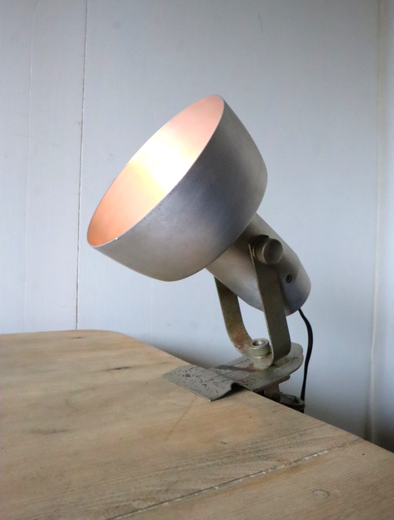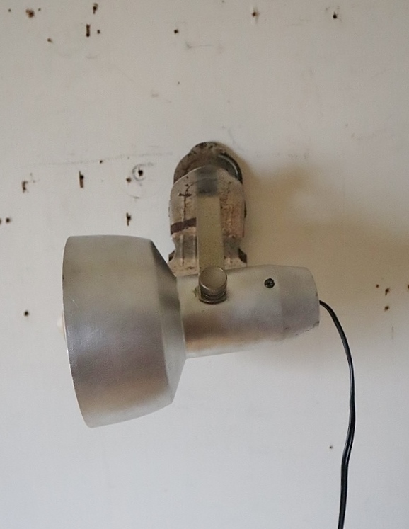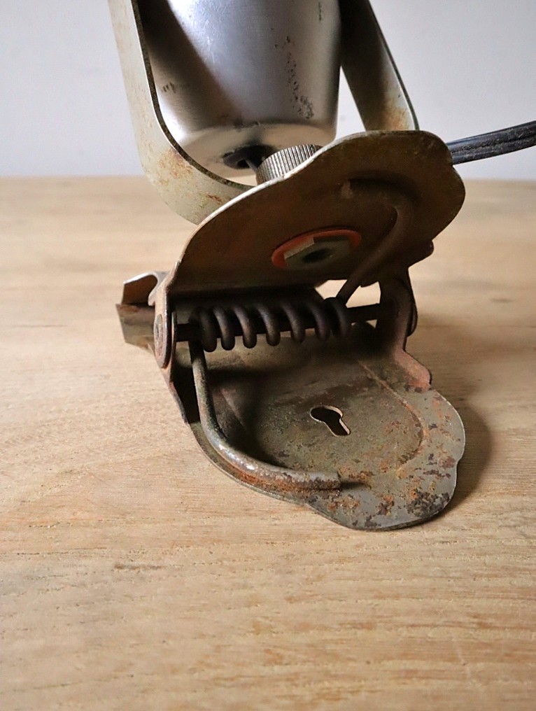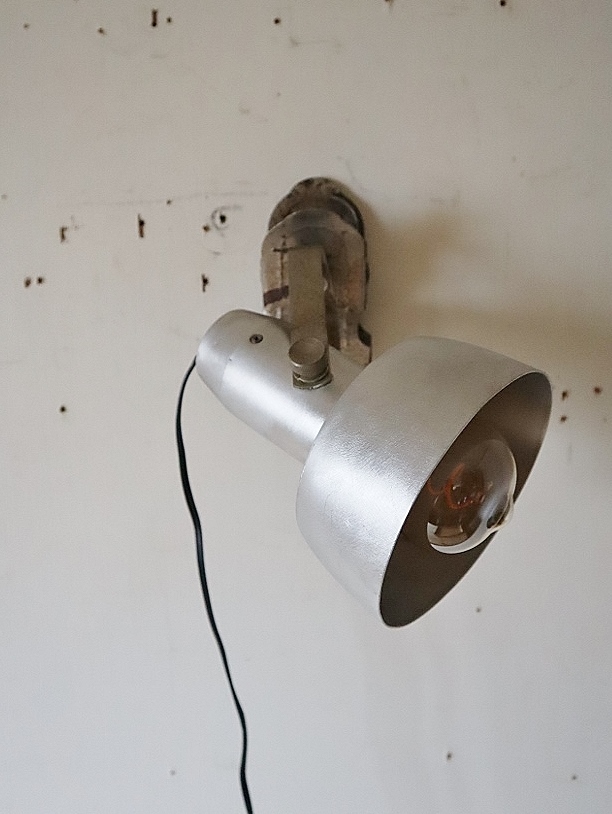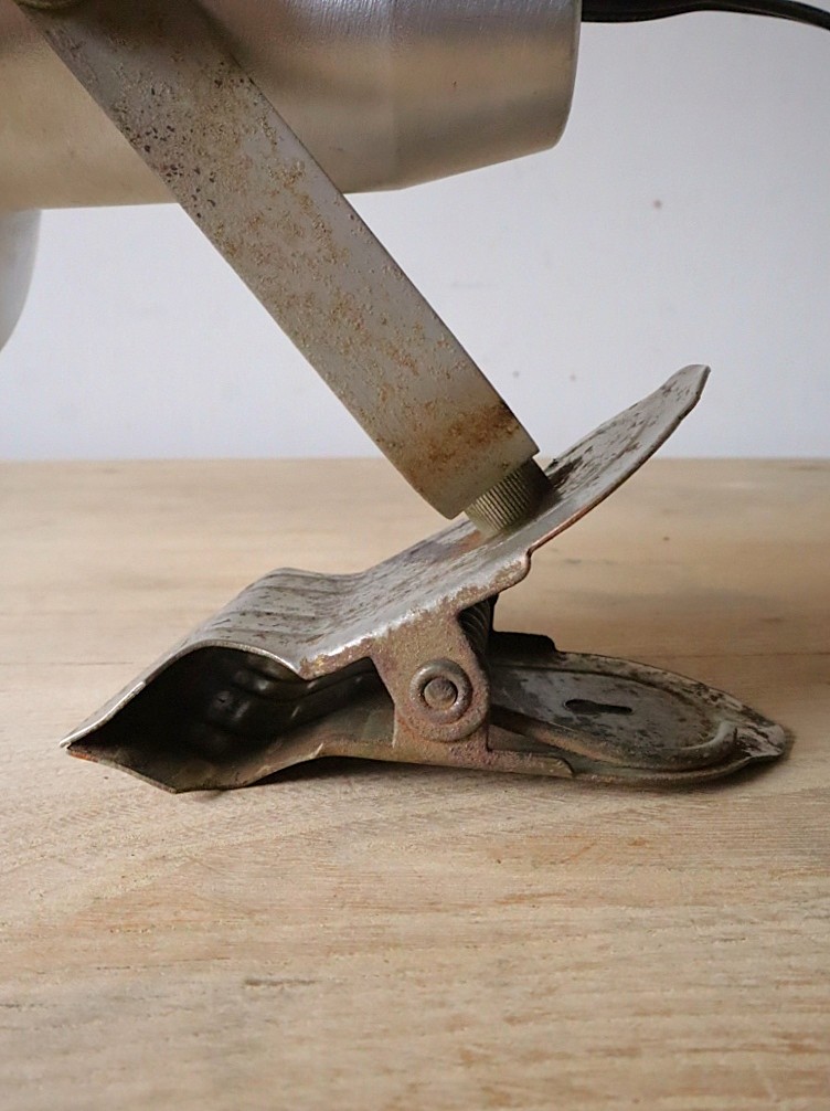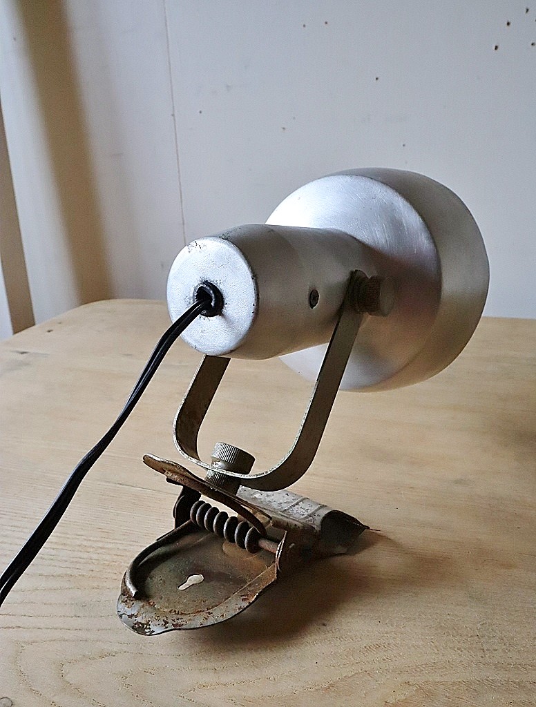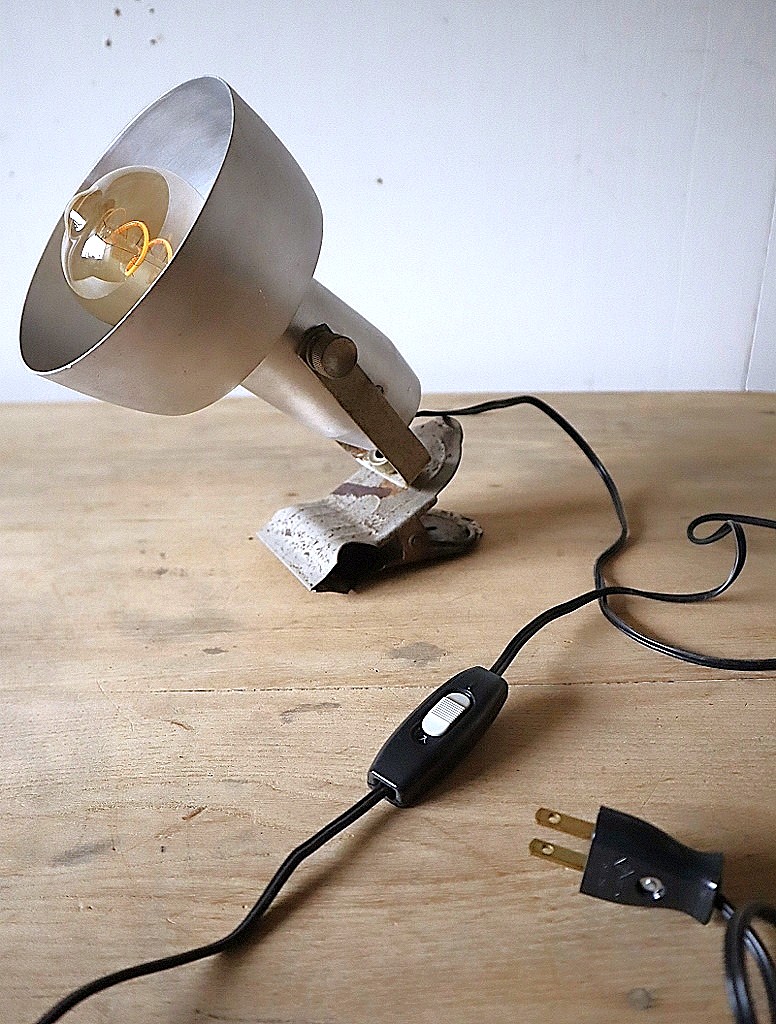 壁掛け、挟む、置くの3通りの使い方が出来るクリップ付きの古いスポットライトになります。