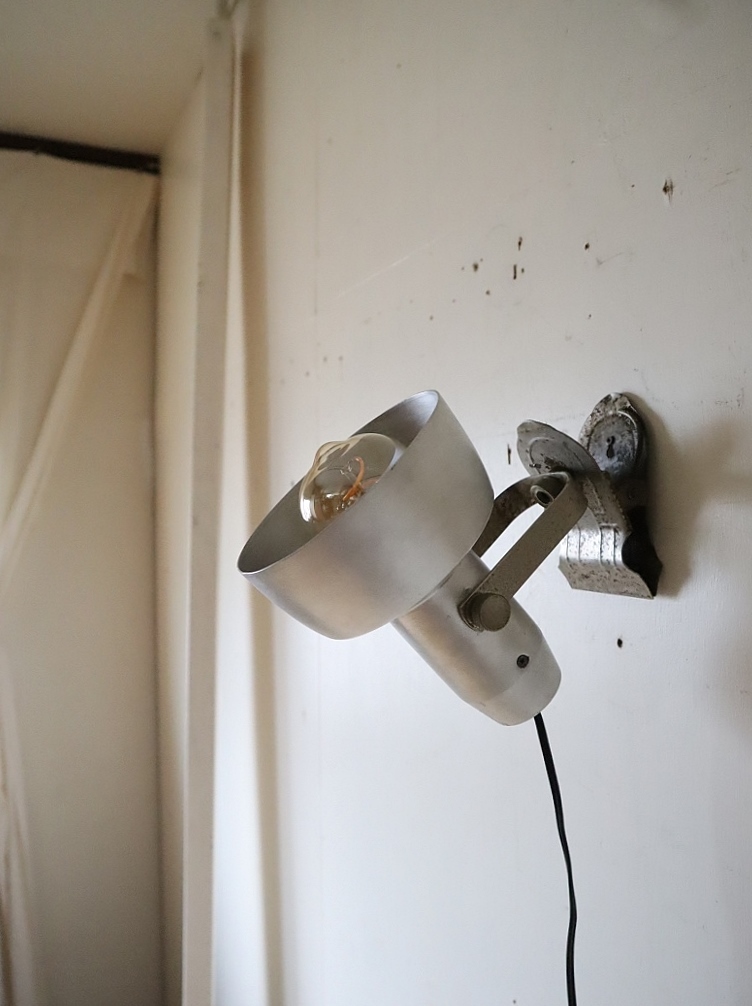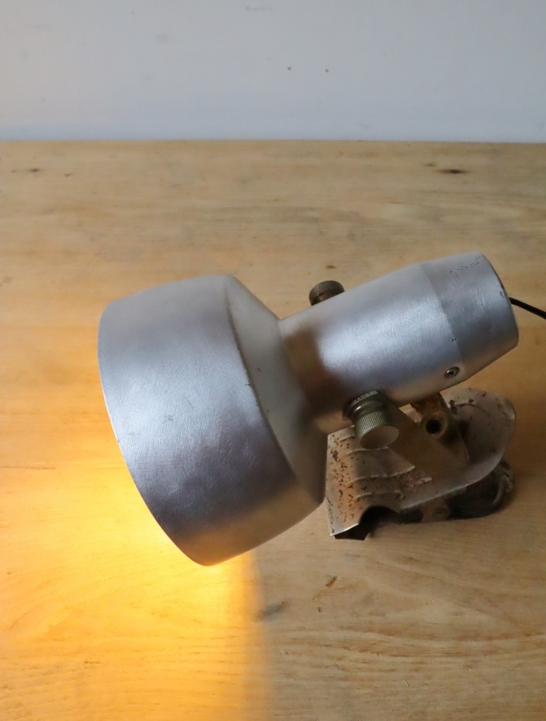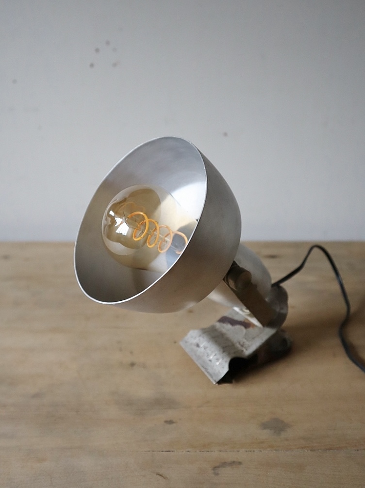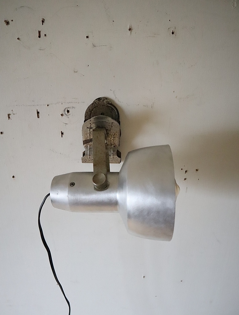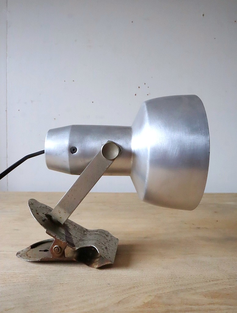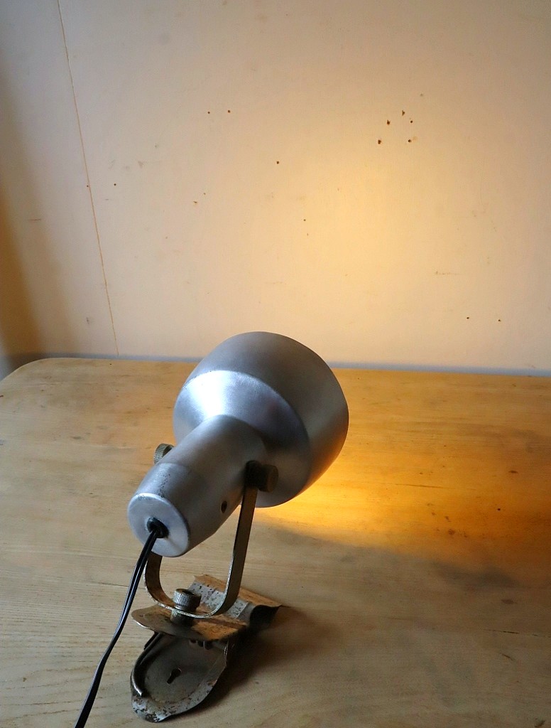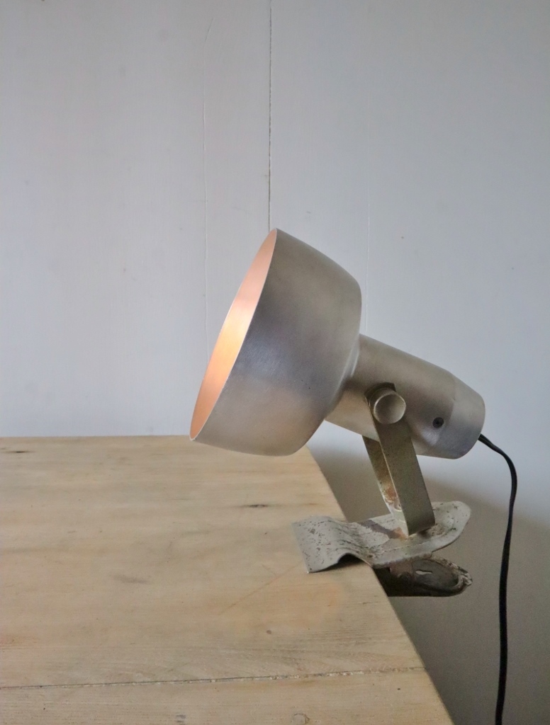 壁掛け、挟む、置くの3通りの使い方が出来るクリップ付きの古いスポットライトになります。
