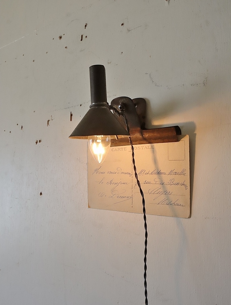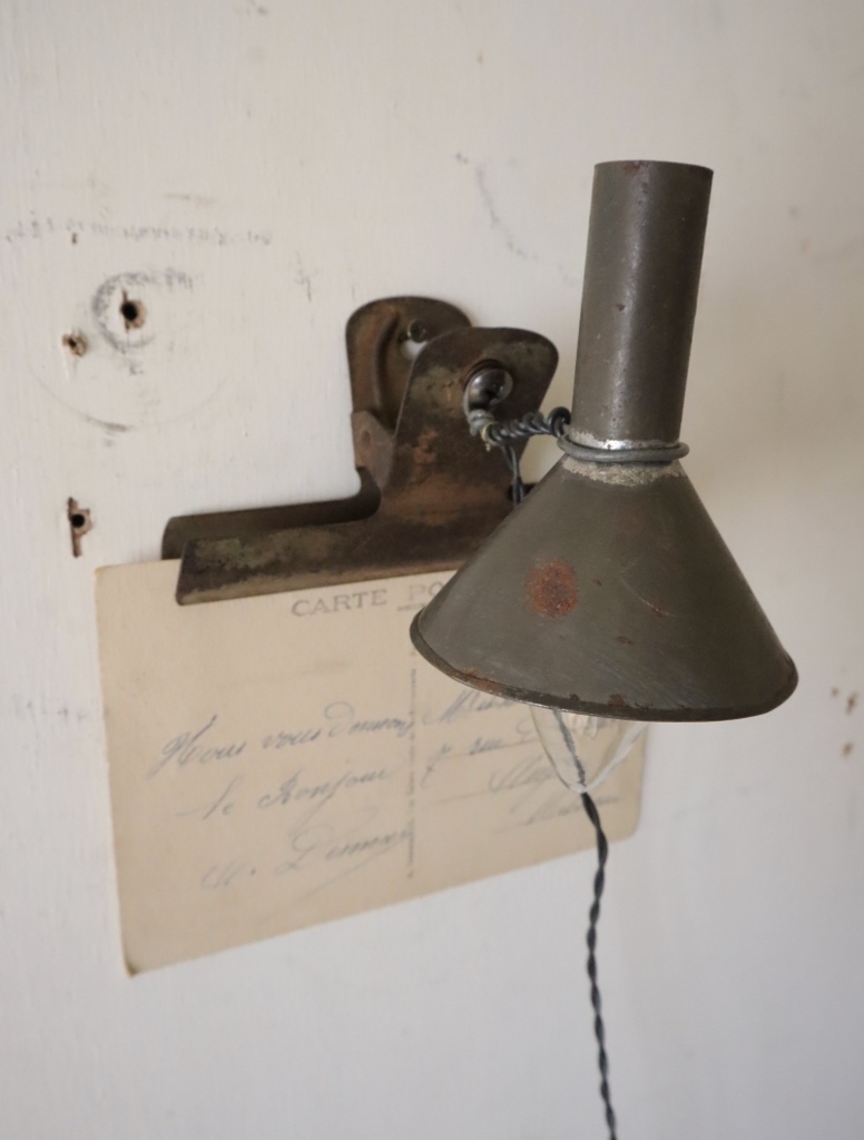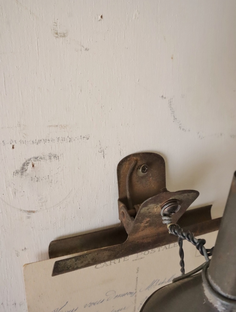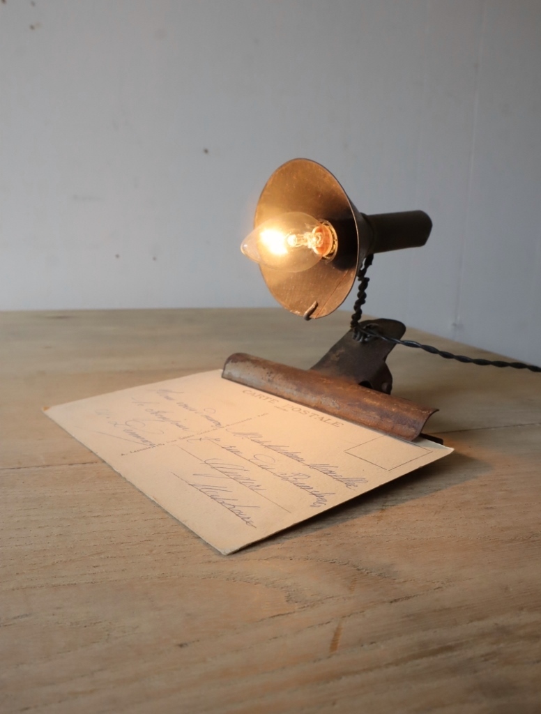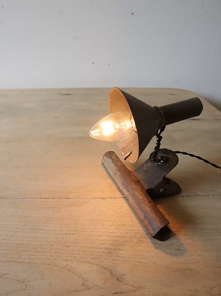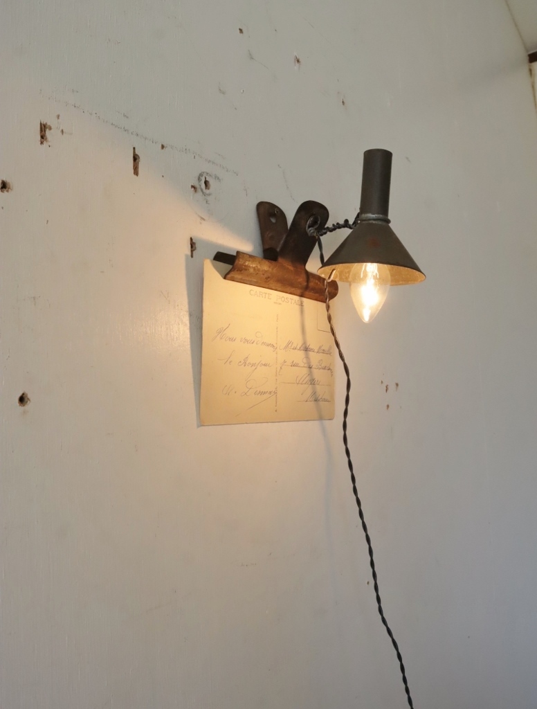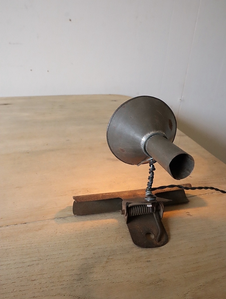 古い照明器具で飾り棚を照らしたり、ポストカードを挟んで照らせる様な小型のライトがなかなか見つからないので無いので、古いブリキの漏斗とクリップを使い小型ライトを制作してみました。
