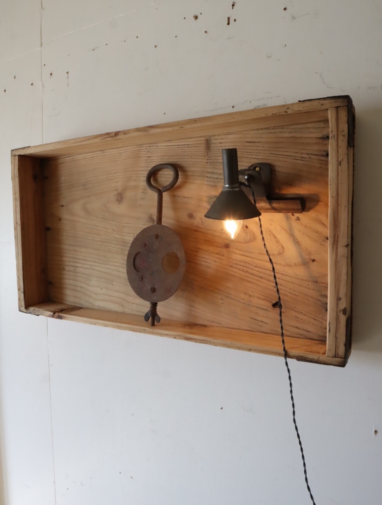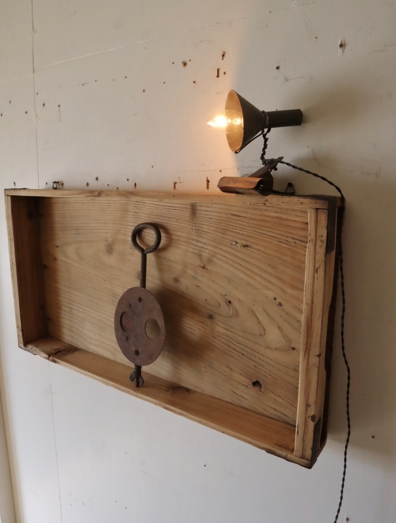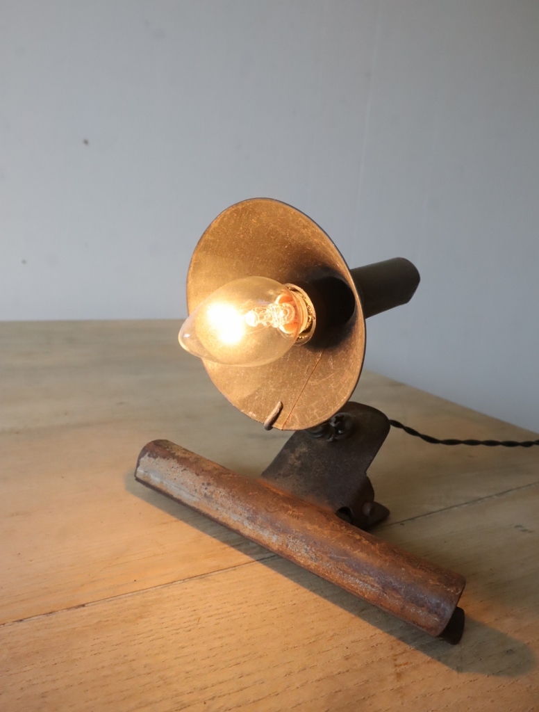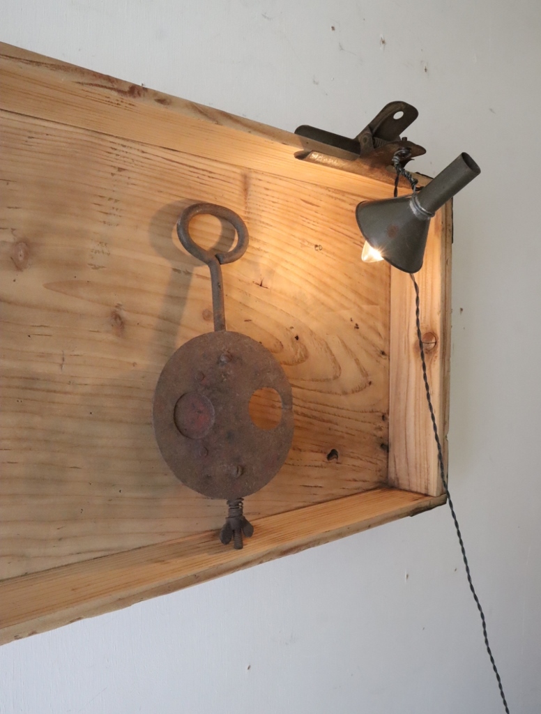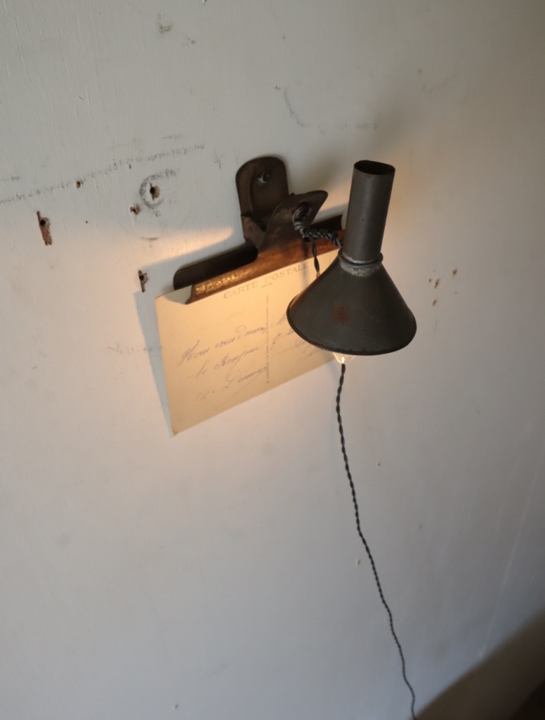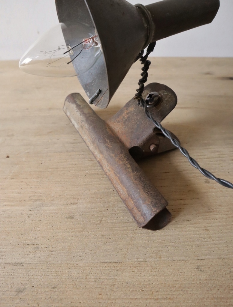 古い照明器具で飾り棚を照らしたり、ポストカードを挟んで照らせる様な小型のライトがなかなか見つからないので無いので、古いブリキの漏斗とクリップを使い小型ライトを制作してみました。
