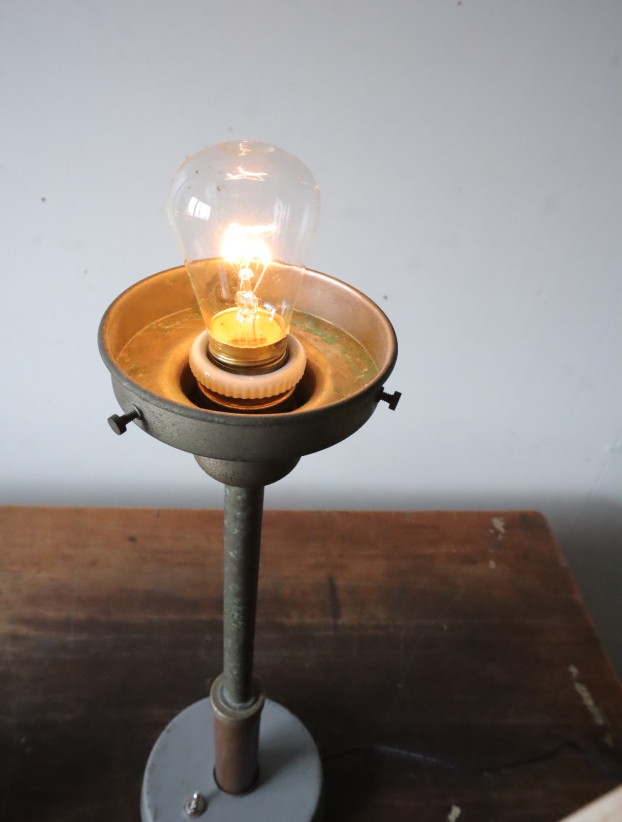 グレーの台座はスチール製、茶色の部分は木製、支柱やホルダー部分は真鍮の上からに鍍金加工が施されており、ソケット上部の白い部分には磁器製のパーツが取り付けられています。