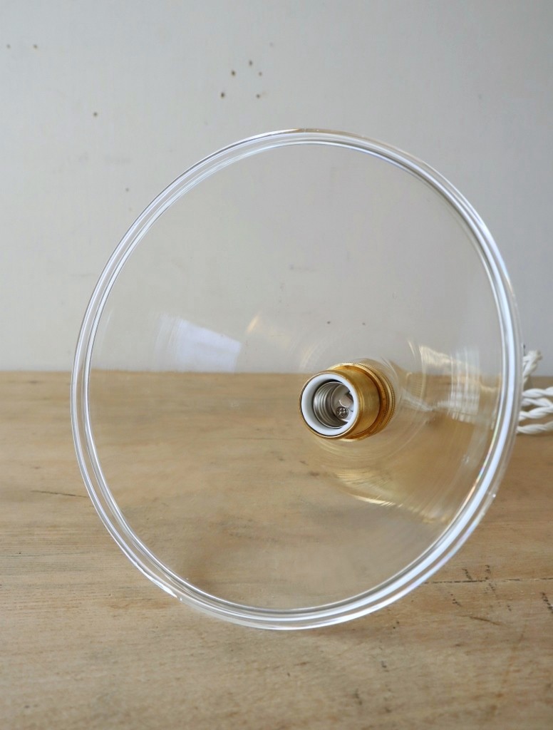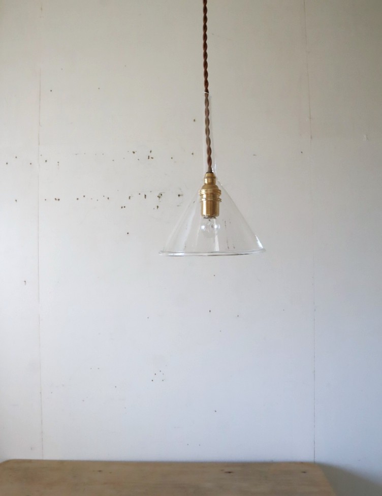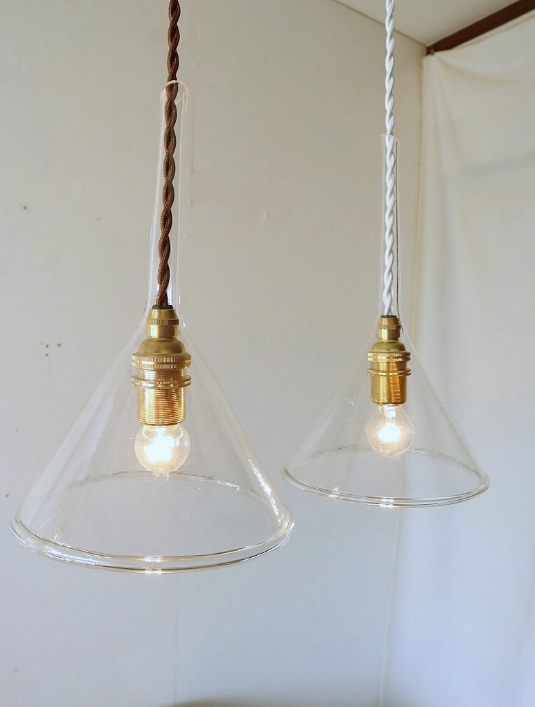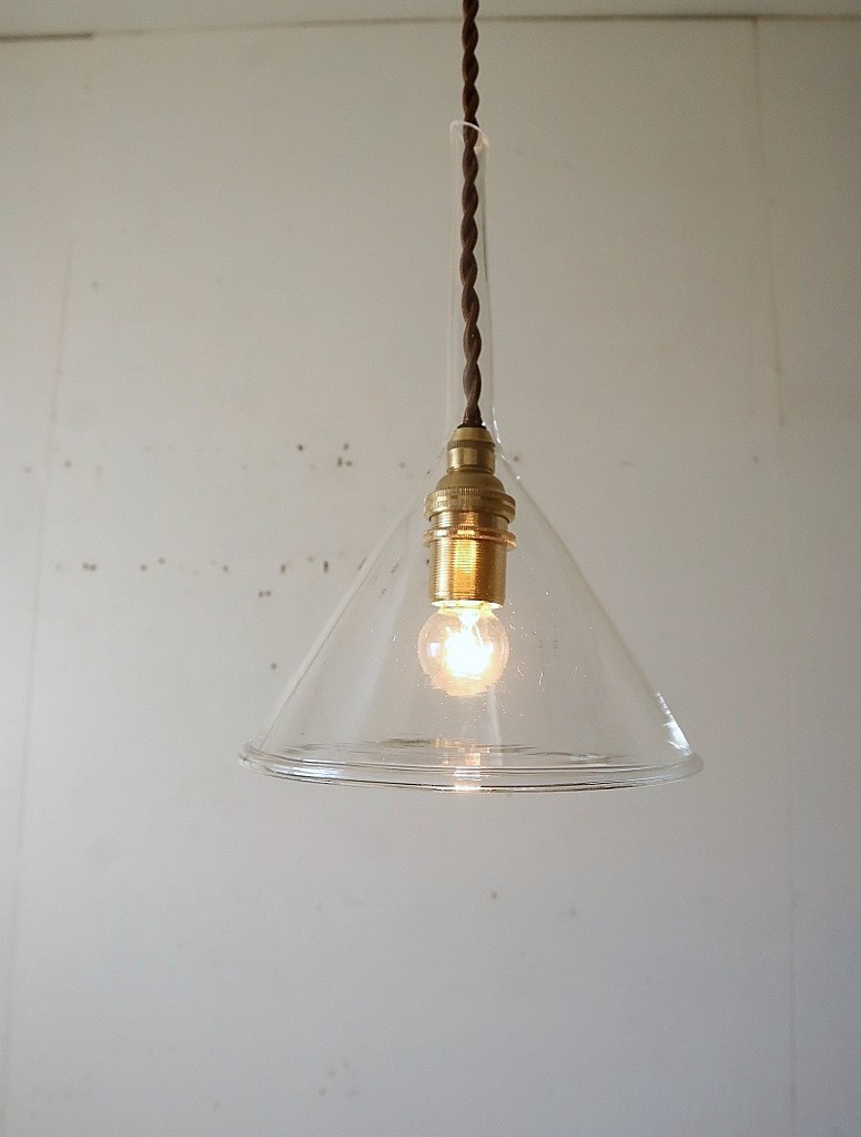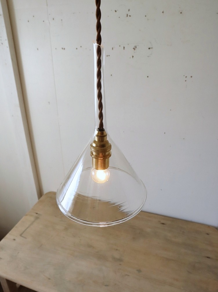 古い実験用の大きなサイズのガラス漏斗を使いペンダントライトに仕立てました。