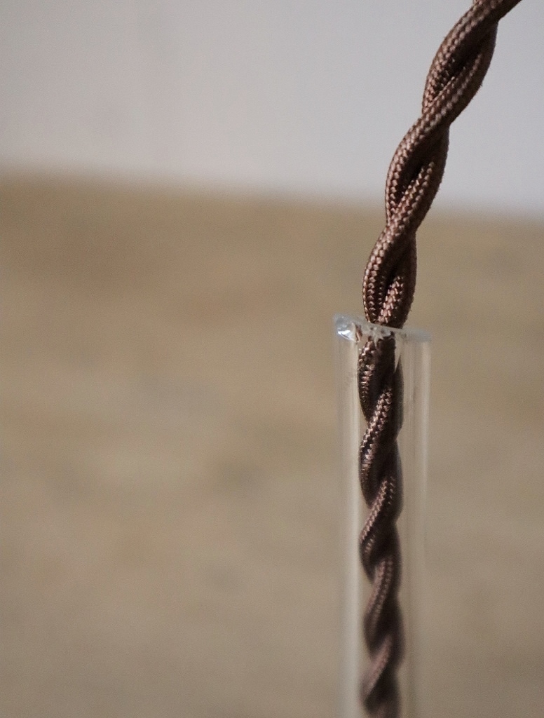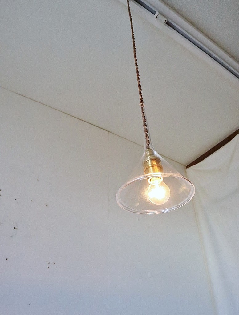 古い実験用の中サイズのガラス漏斗を使いペンダントライトに仕立てました。