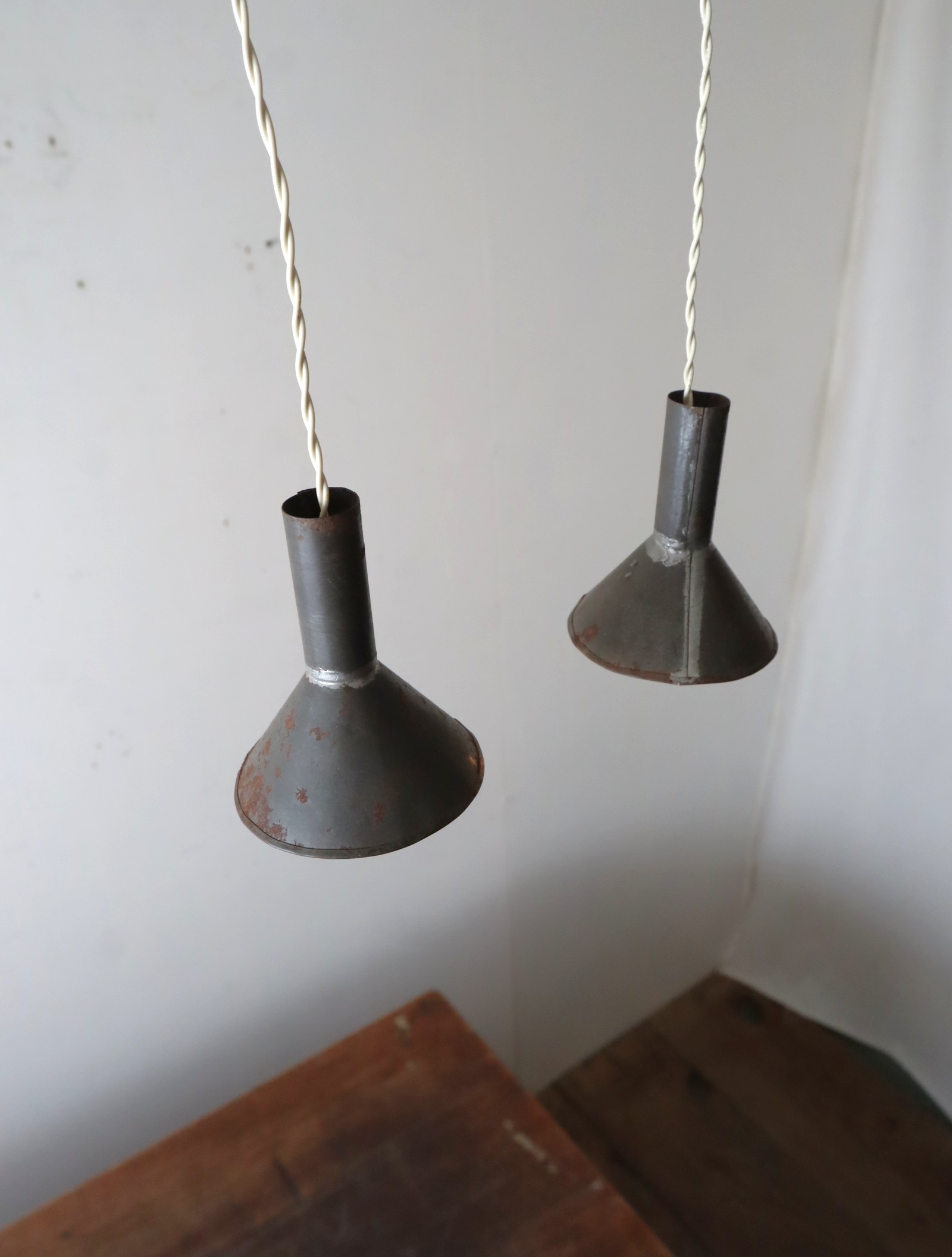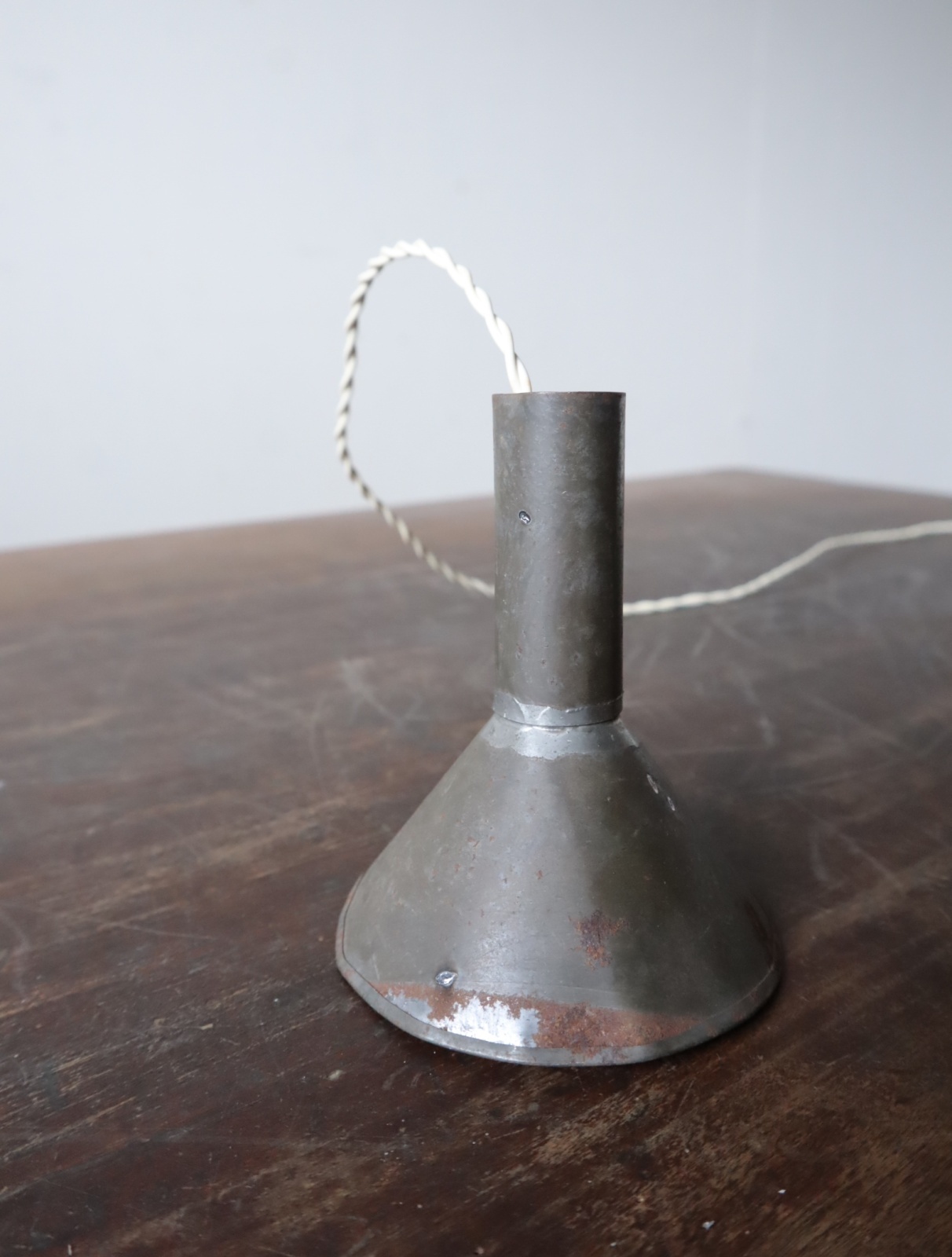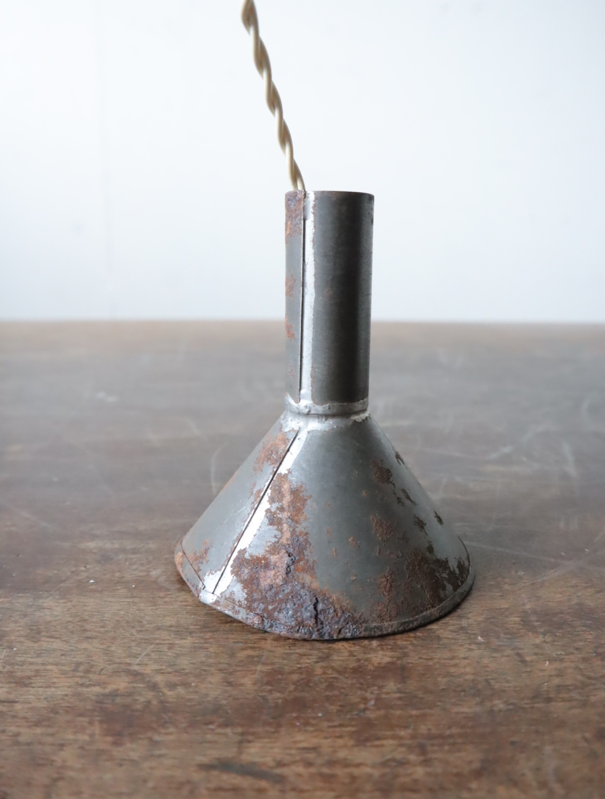 手のひらに乗る大きさのブリキ製の漏斗を使いペンダントライトに仕立てました。