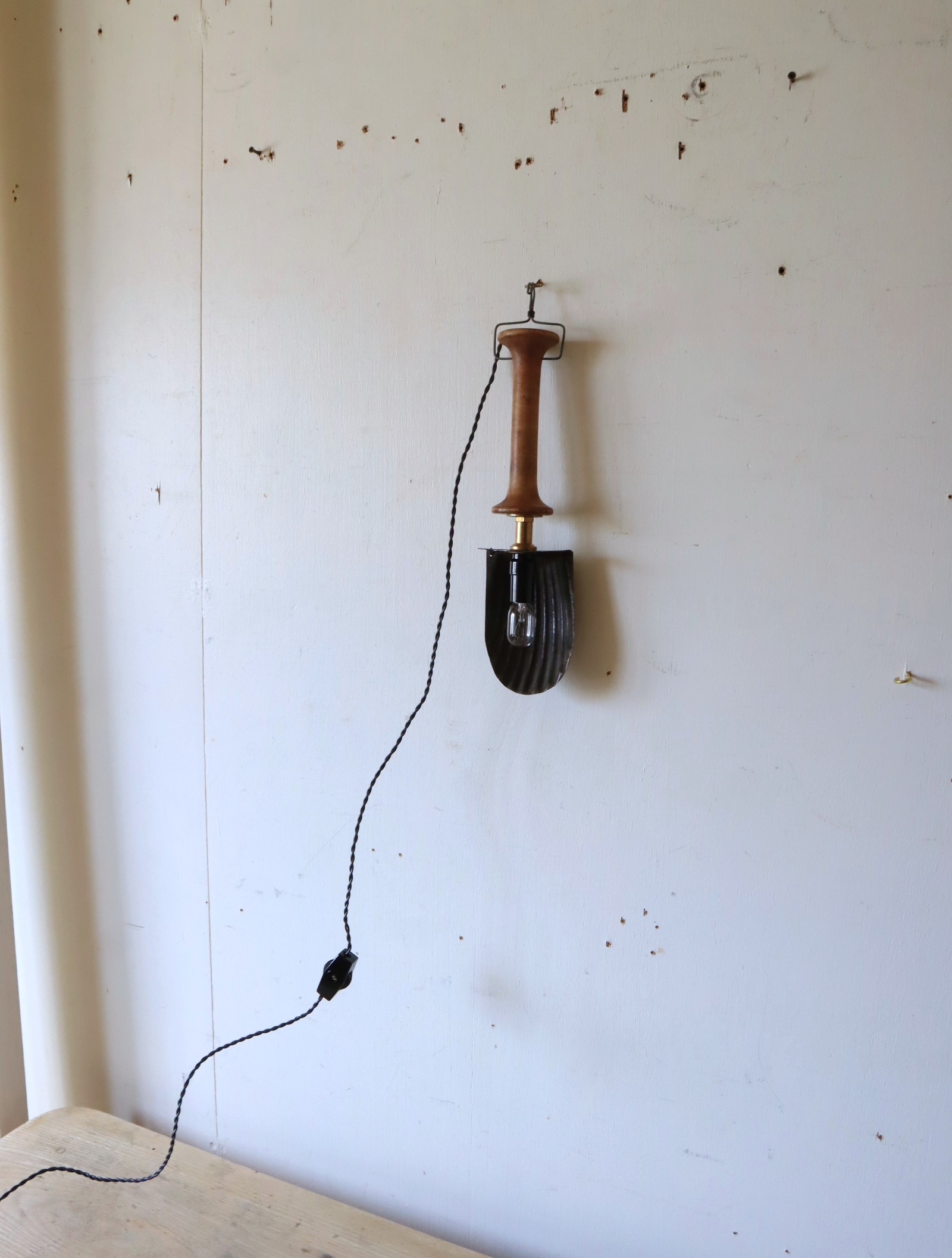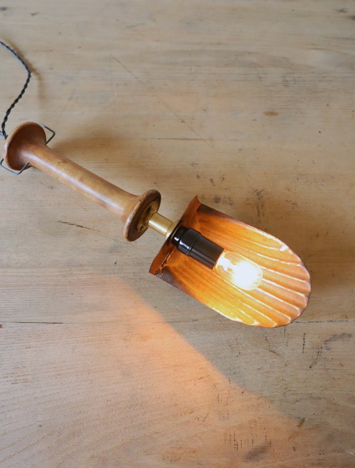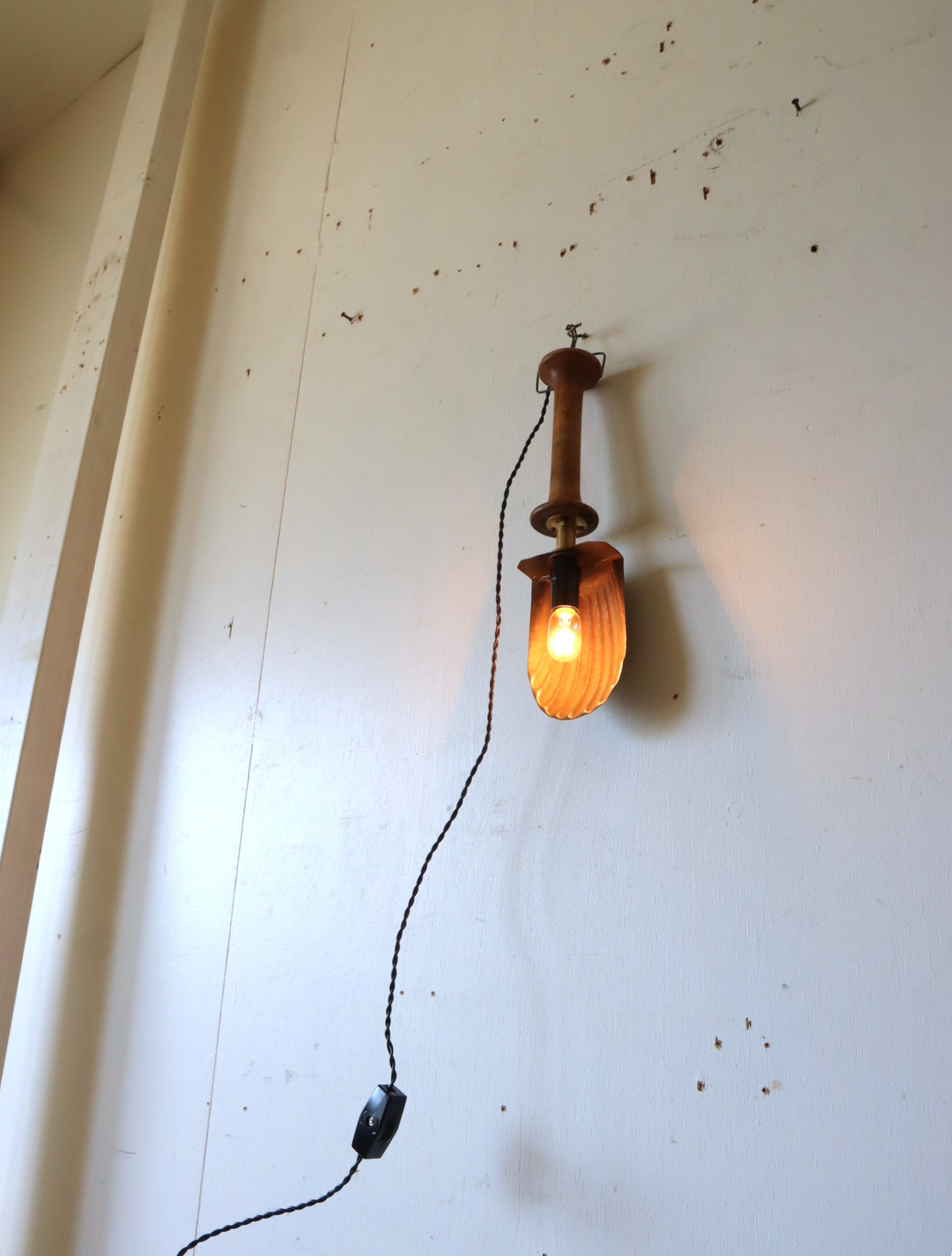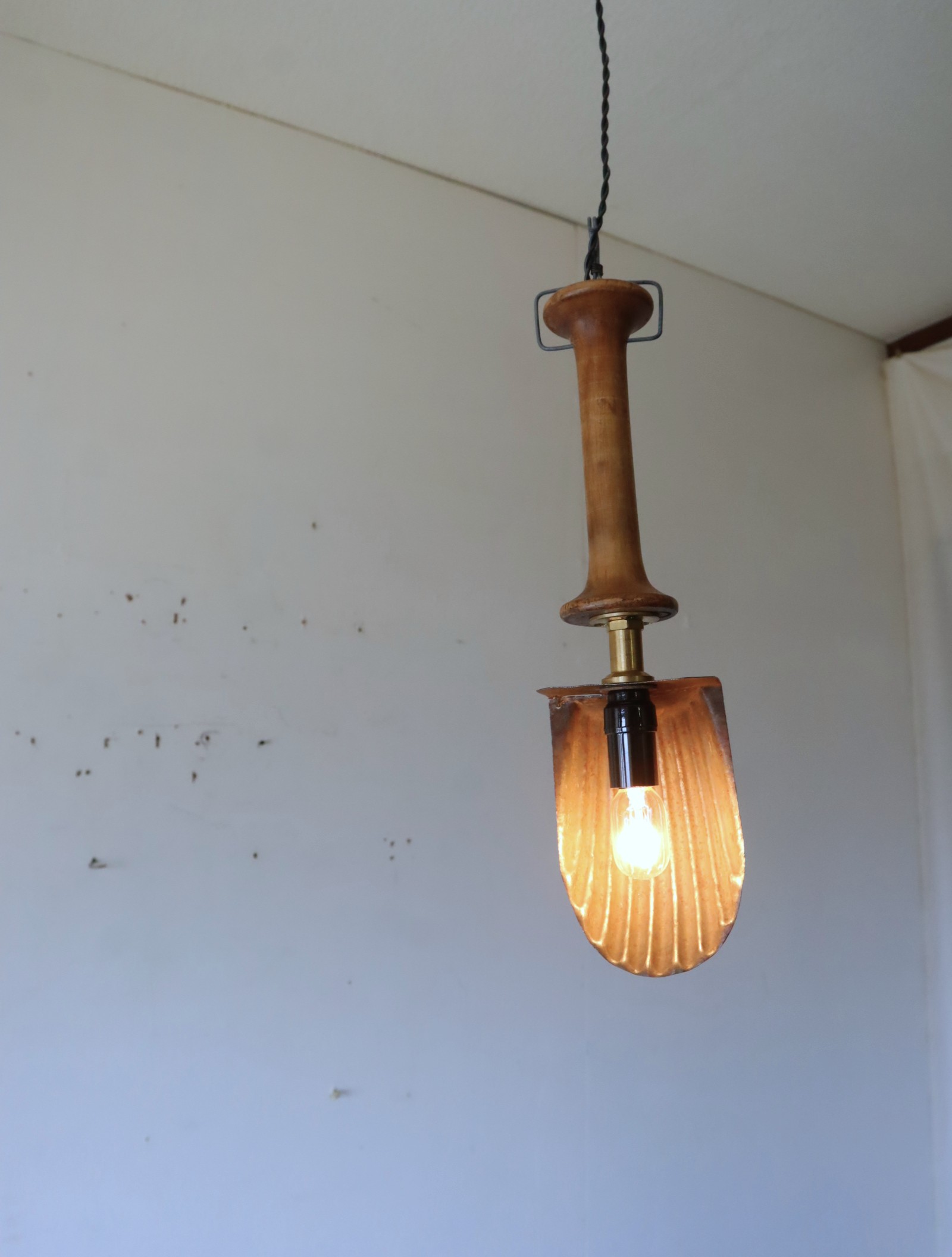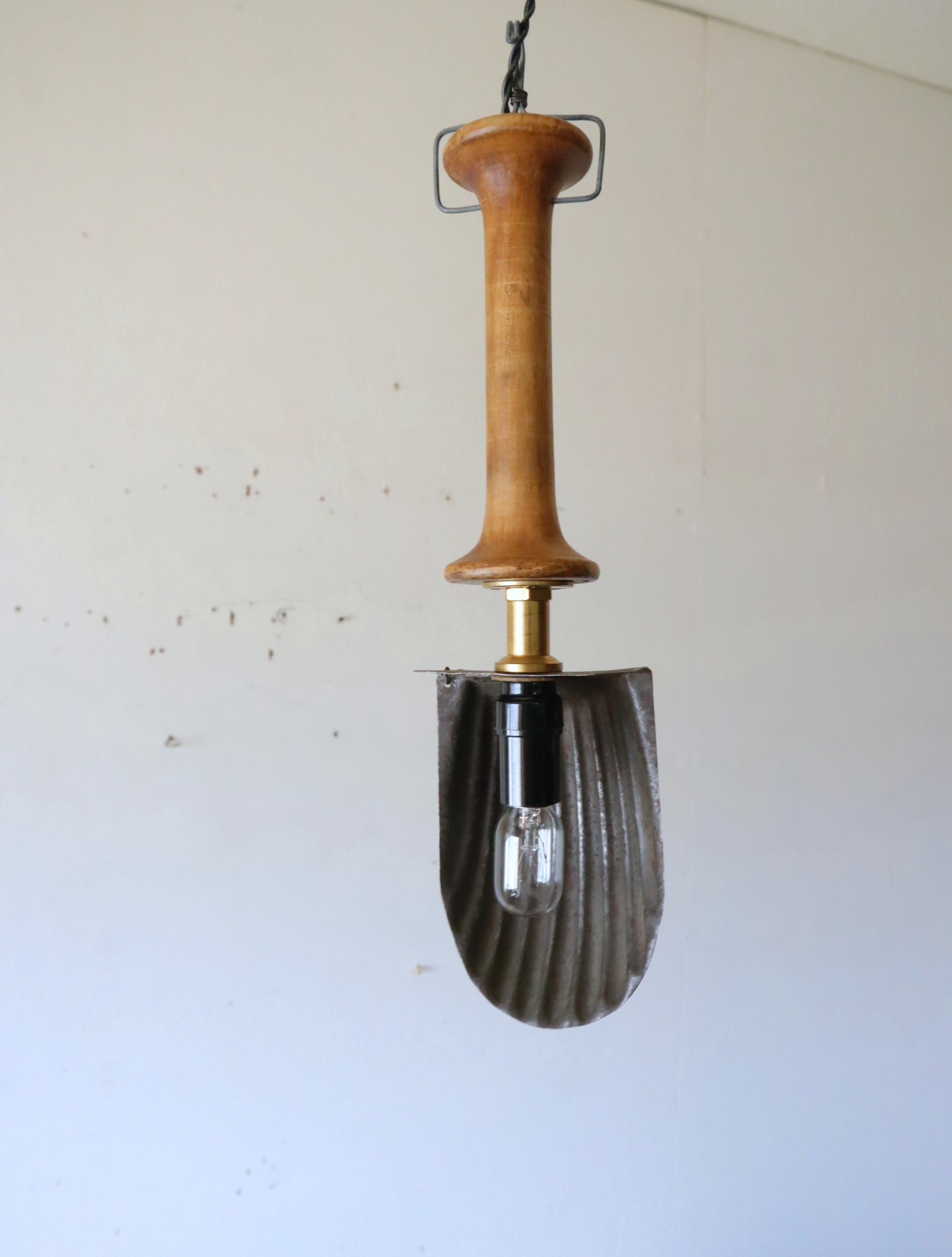 フランスの古いブリキ製の大きなサイズのマドレーヌ型と木製の糸巻きを組み合わせて2wayで使えるライトに仕立てました。