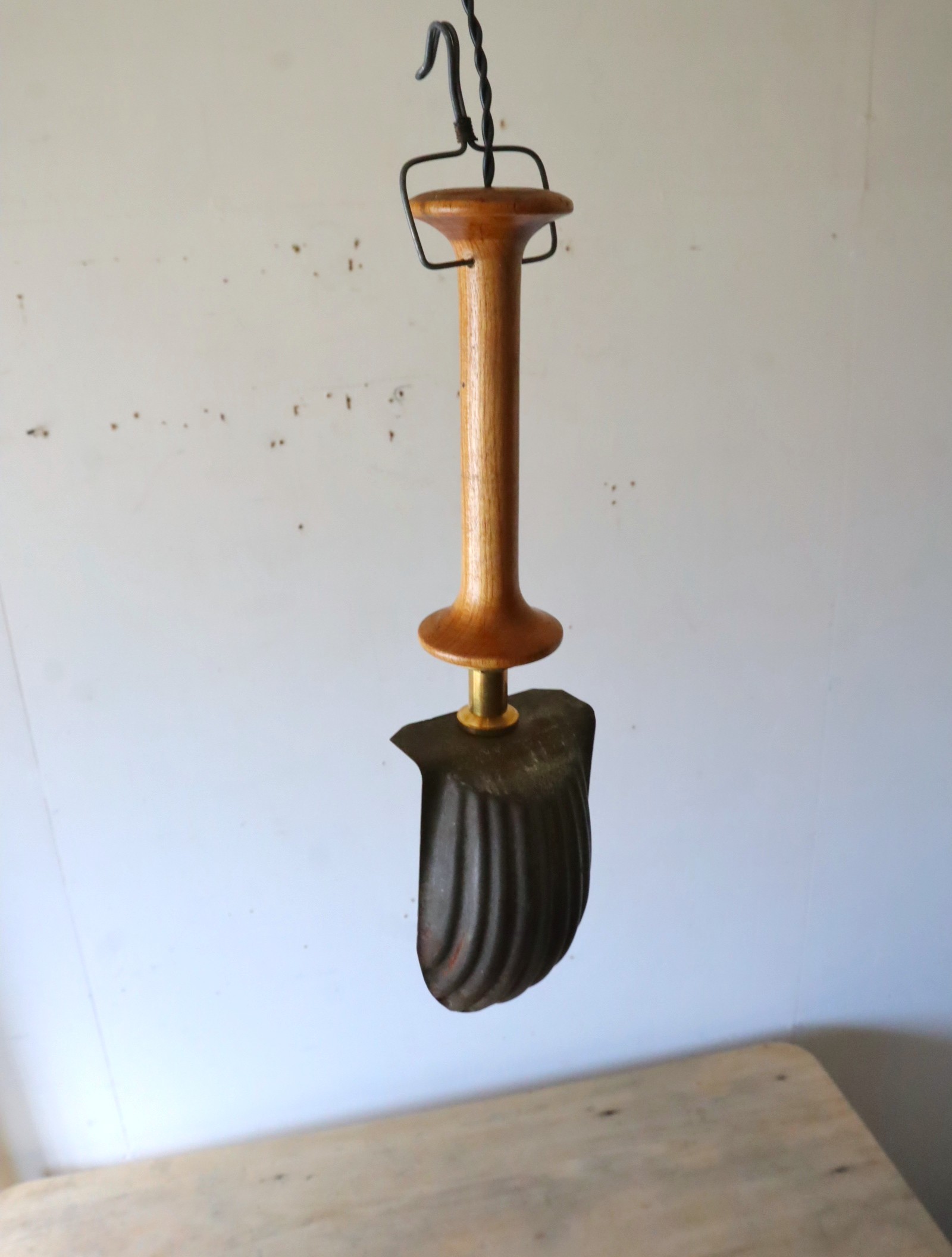 フランスの古いブリキ製の大きなサイズのマドレーヌ型と木製の糸巻きを組み合わせて2wayで使えるライトに仕立てました。