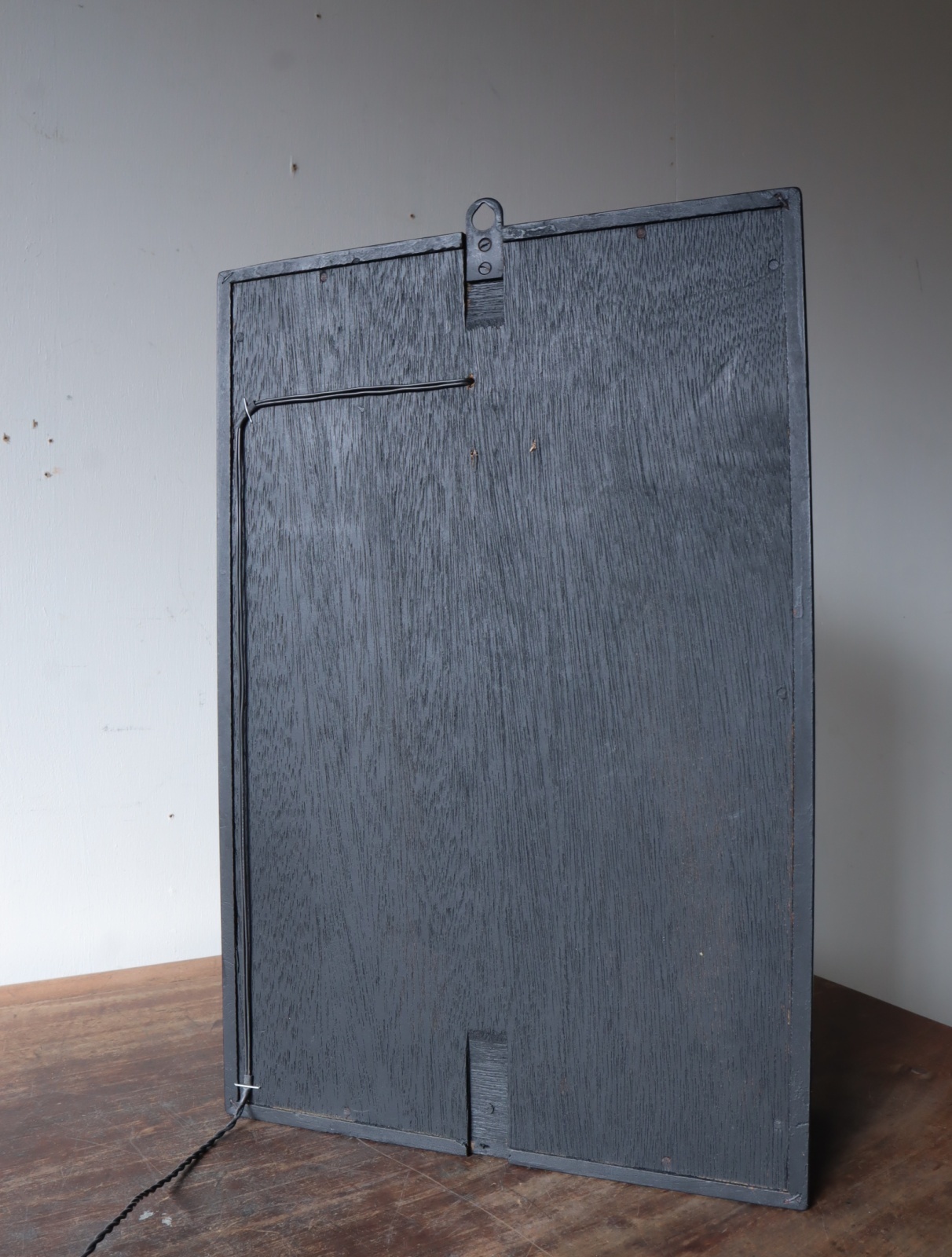 古い柱時計の木箱といろいろな古い部品を使って照明付きの壁掛け飾り棚に仕立てました。