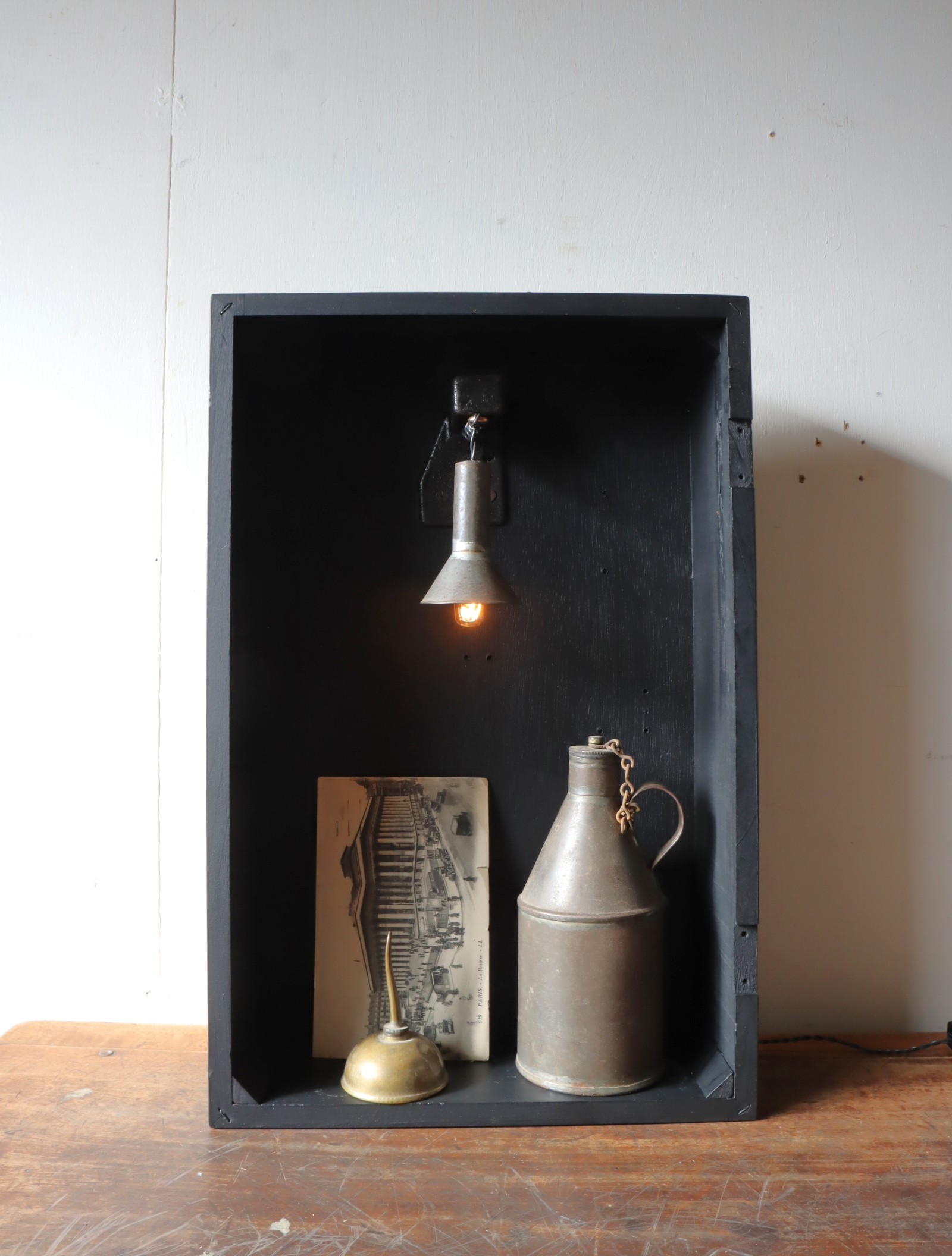 木箱は黒色に塗装し、柱時計の部品の先からシェードに見立てたブリキの漏斗が垂れ下がるようにしています。