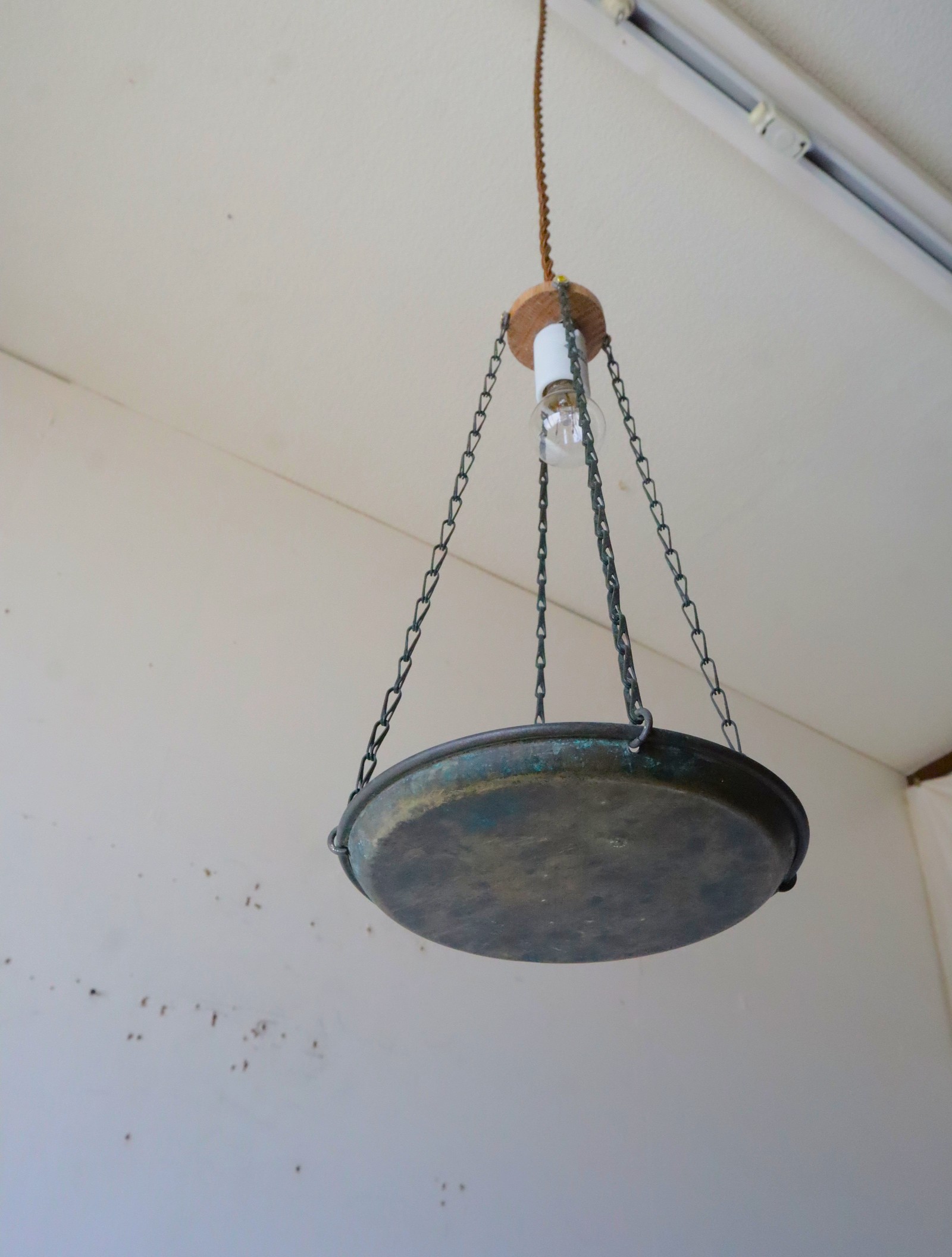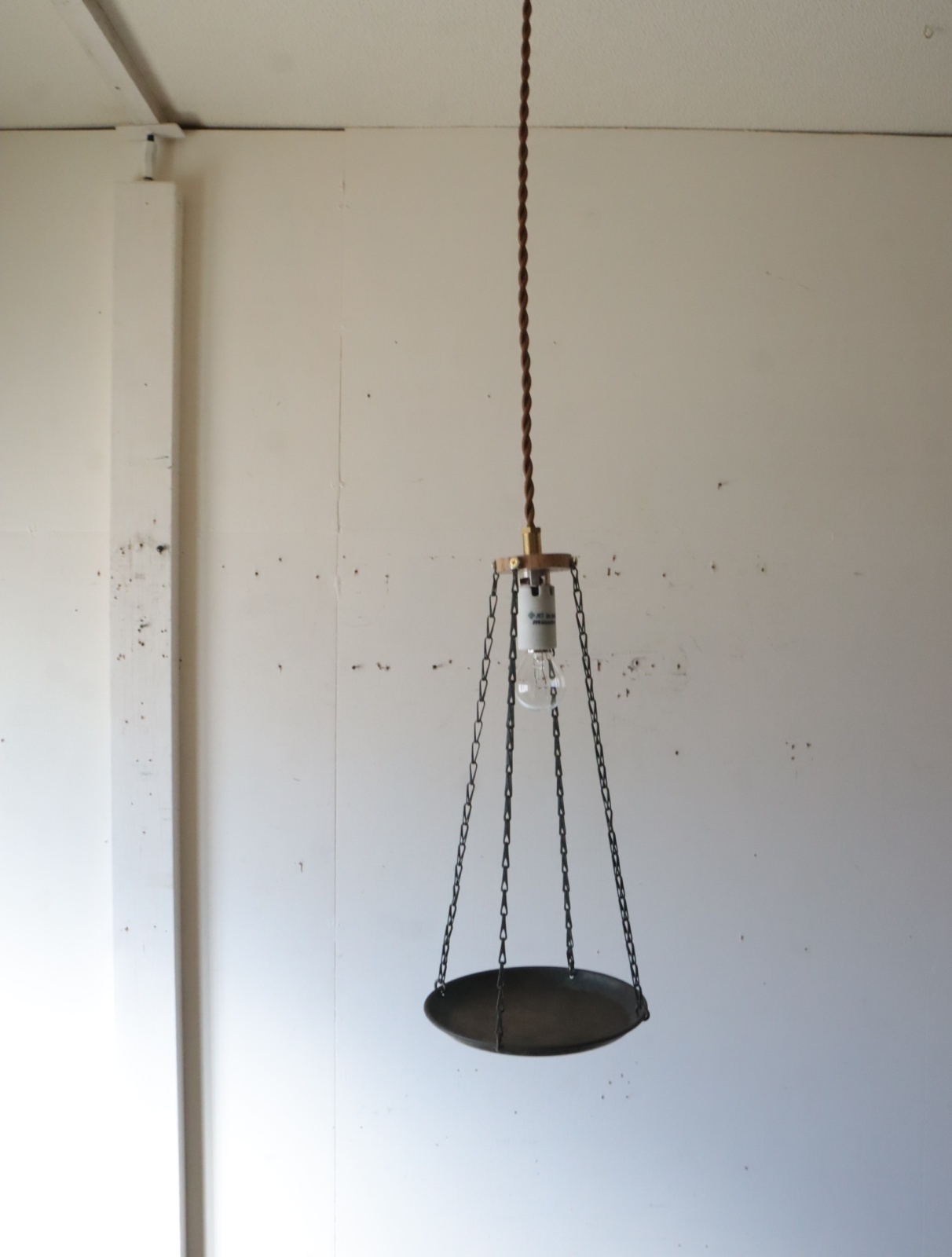 古い竿秤の皿を使いペンダントライトに仕立てました。