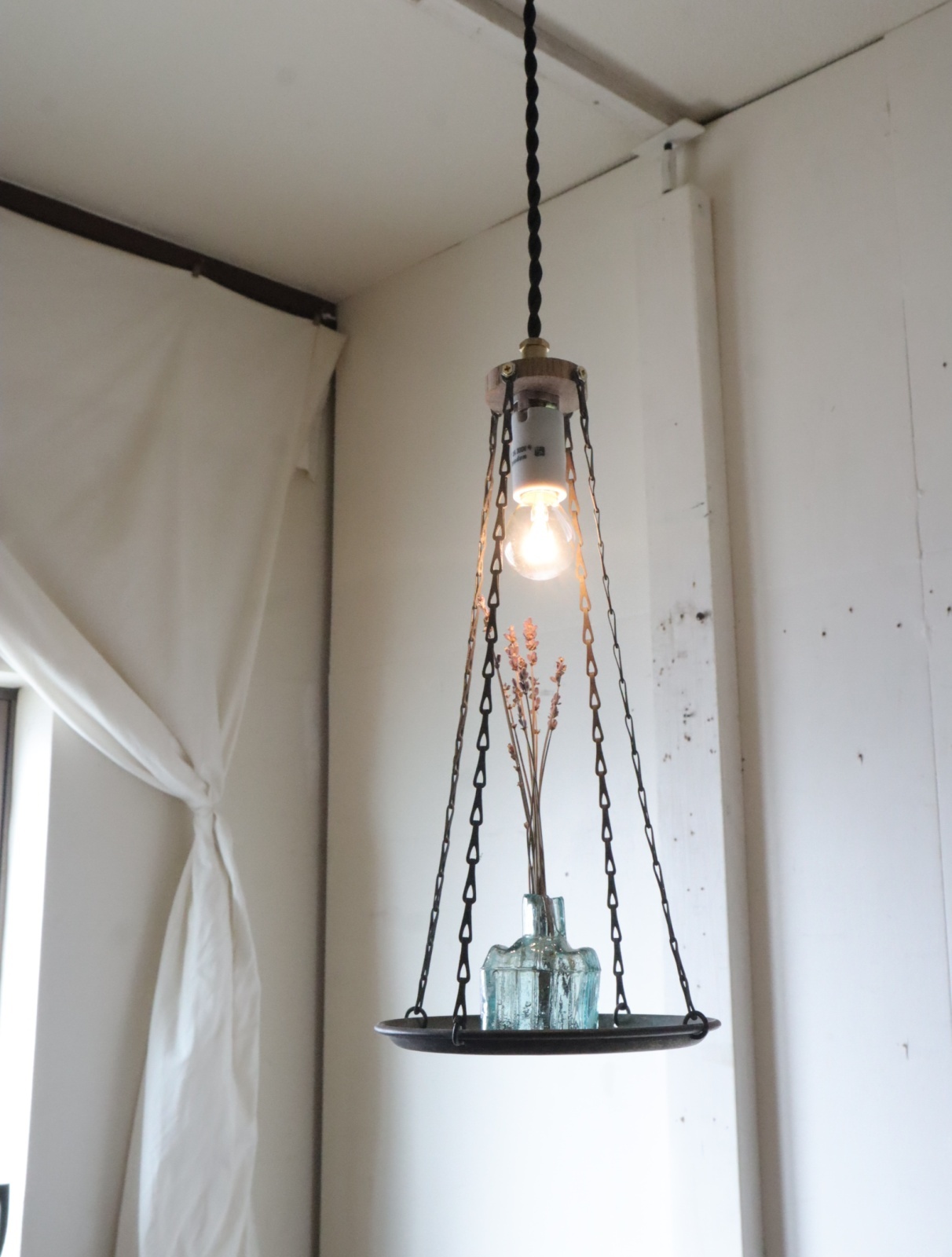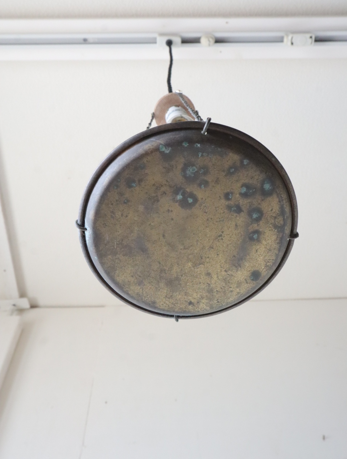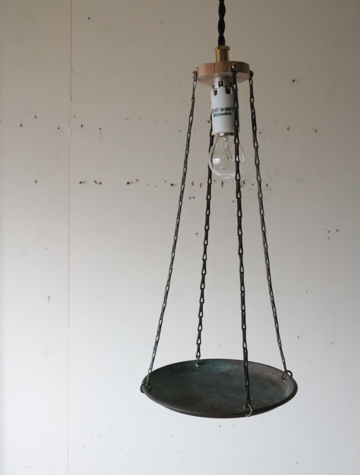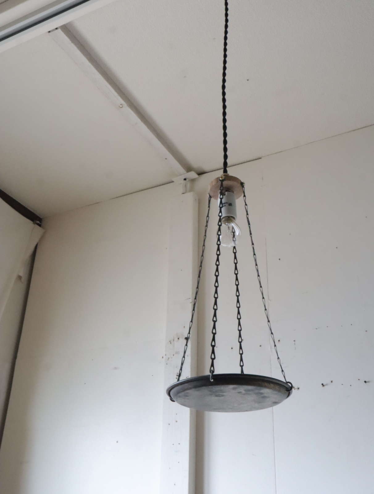 古い竿秤の皿を使いペンダントライトに仕立てました。