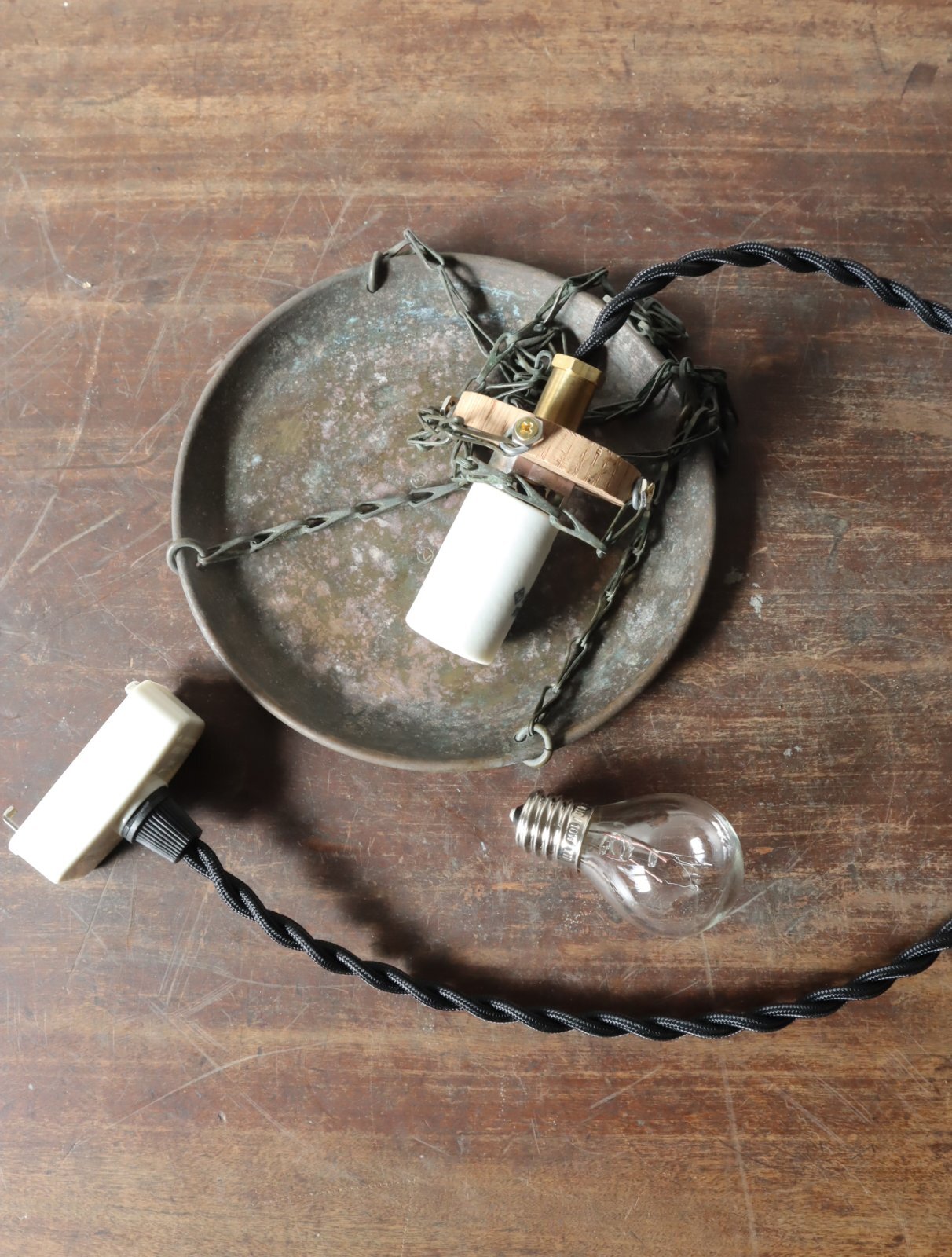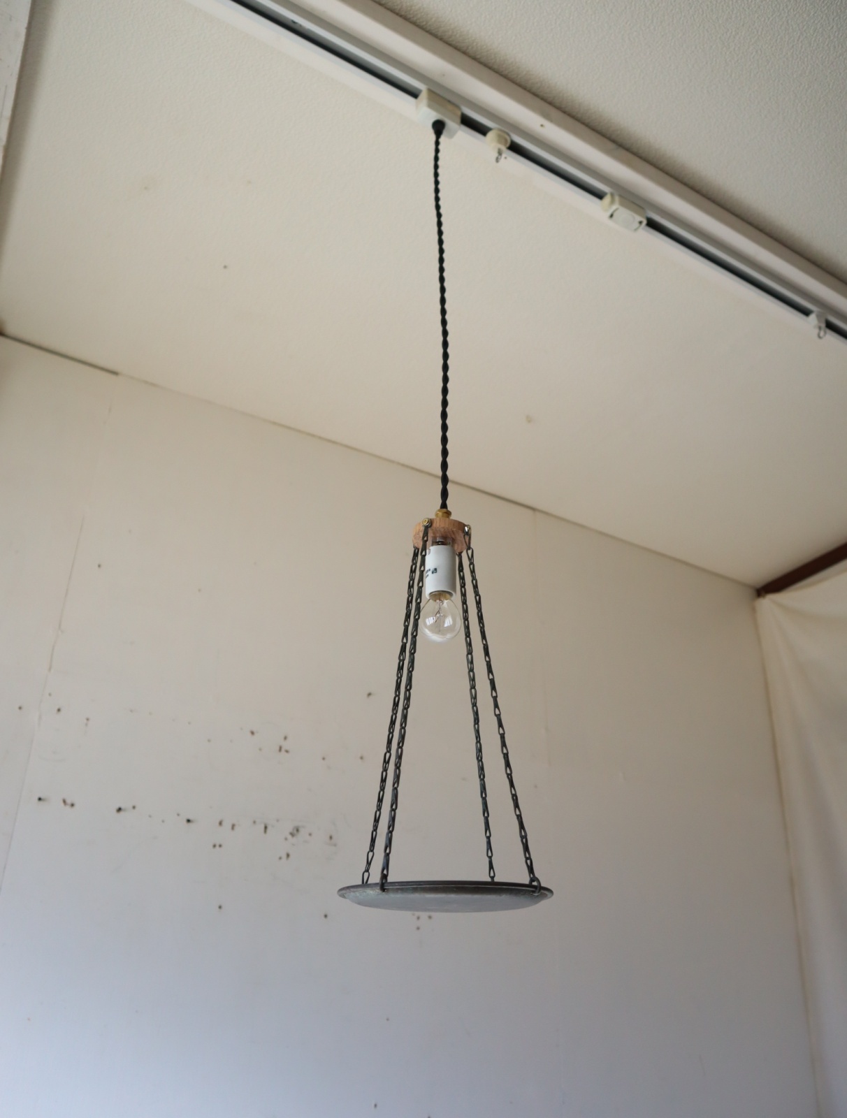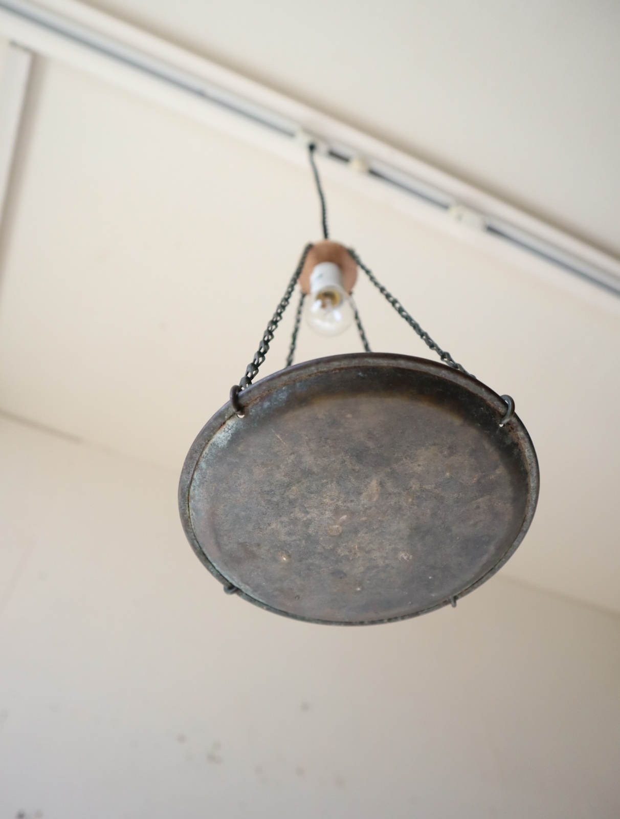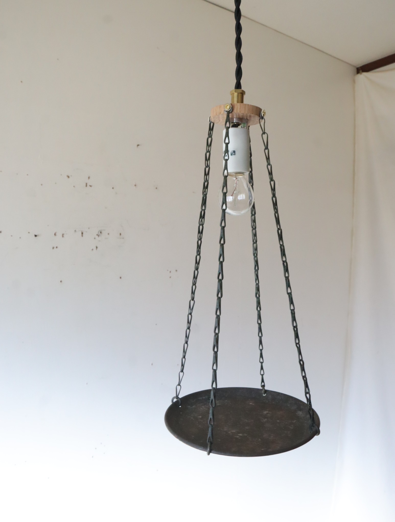 古い竿秤の皿を使いペンダントライトに仕立てました。