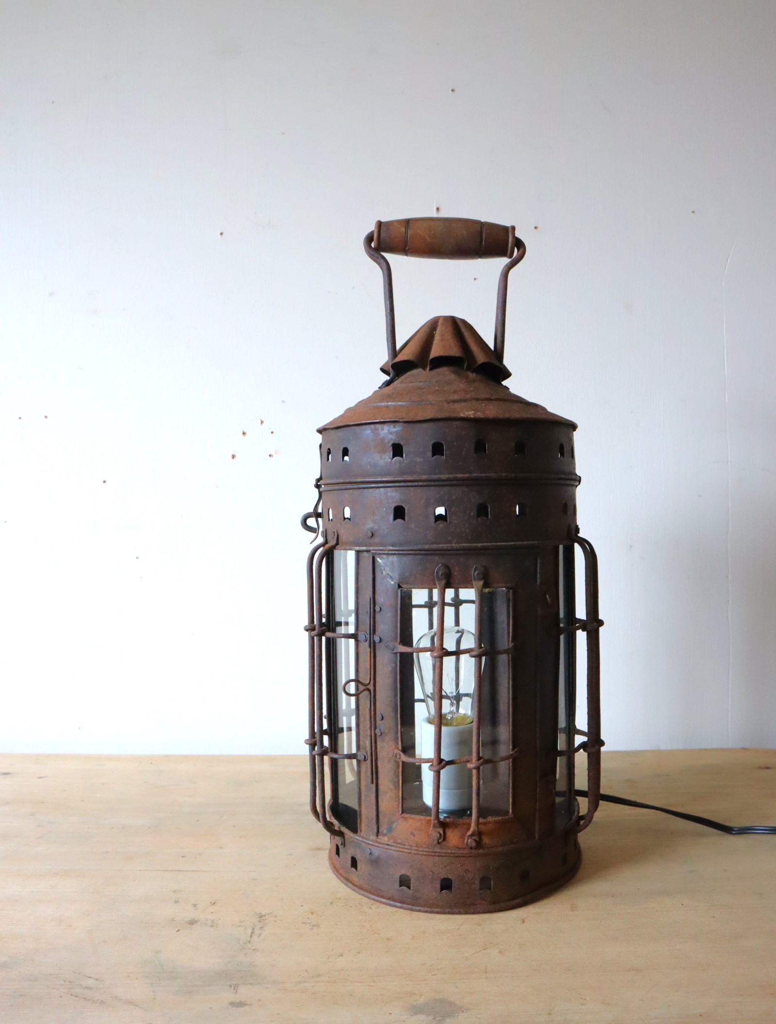 古いブリキ製のカンテラにソケットとコードを配線して電気仕様で使えるライトに仕立てました。