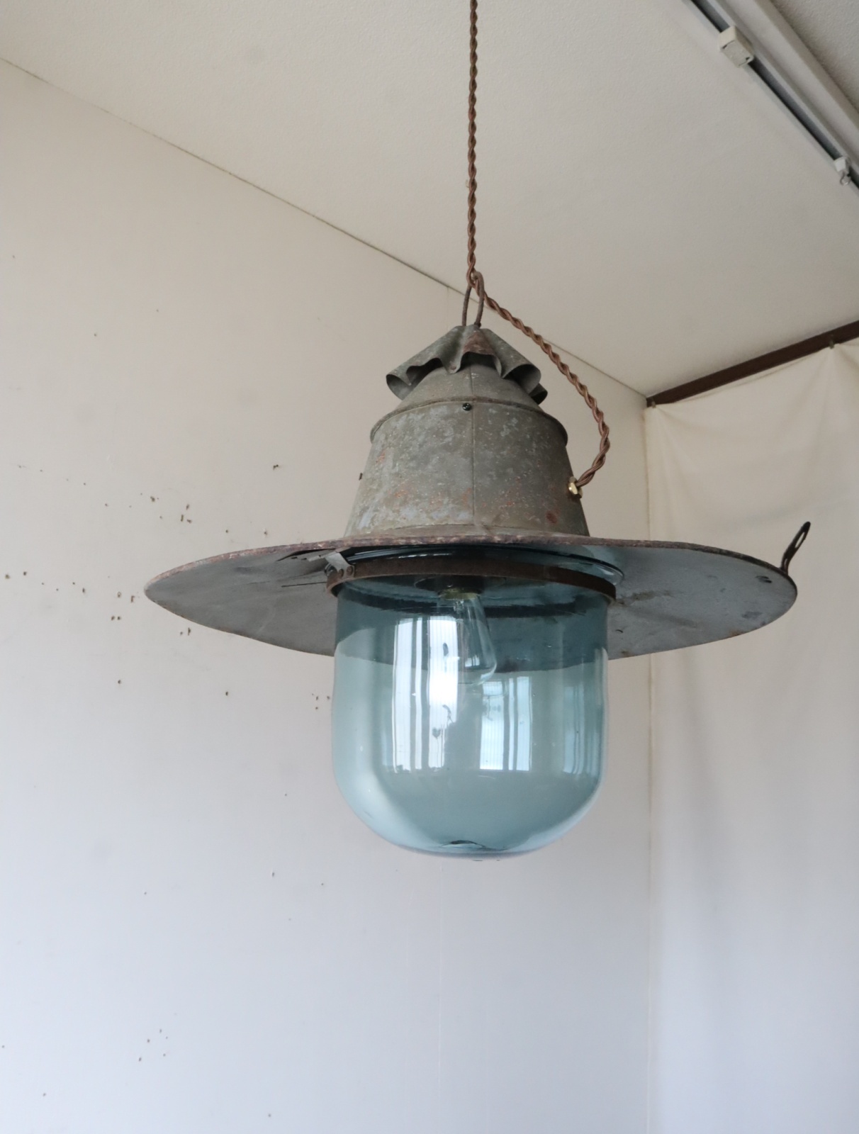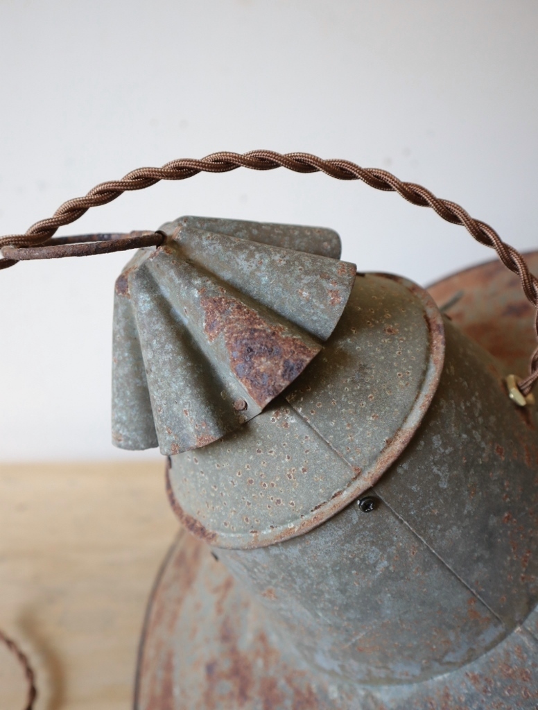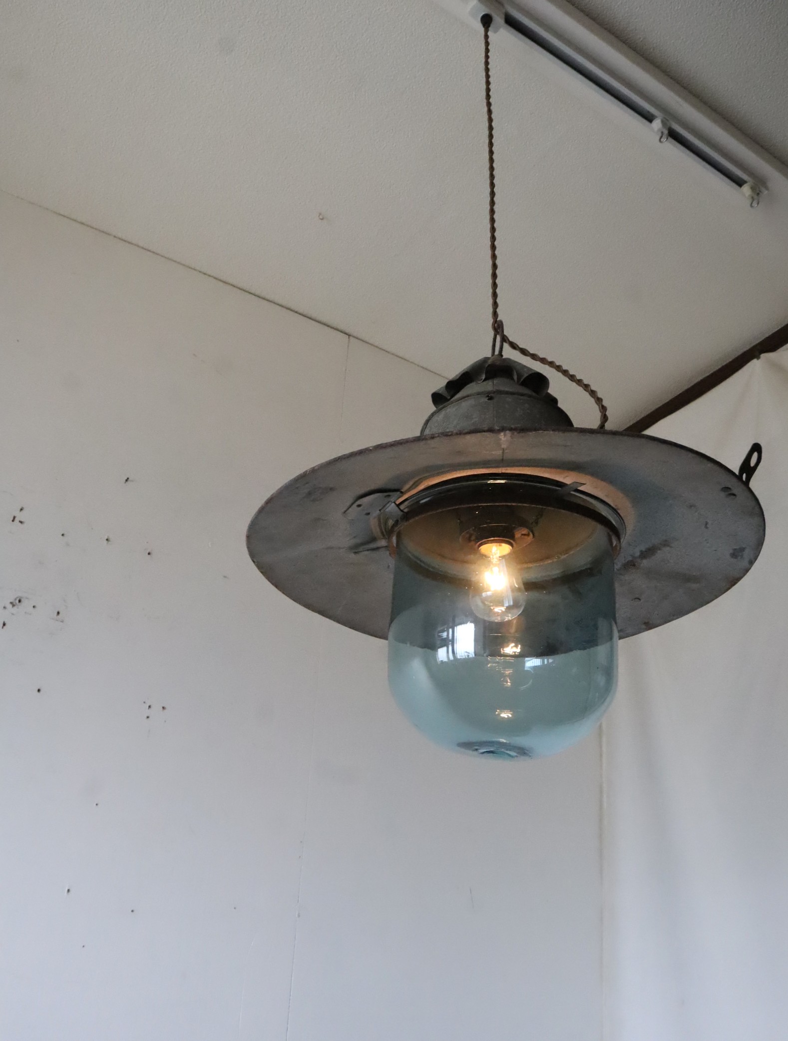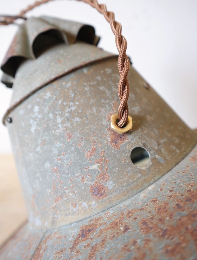 ガスを使って灯していた古い吊り下げランプに、ソケットとコードを取り付けて電気で使えるように当方で作り替えたペンダントライトになります。