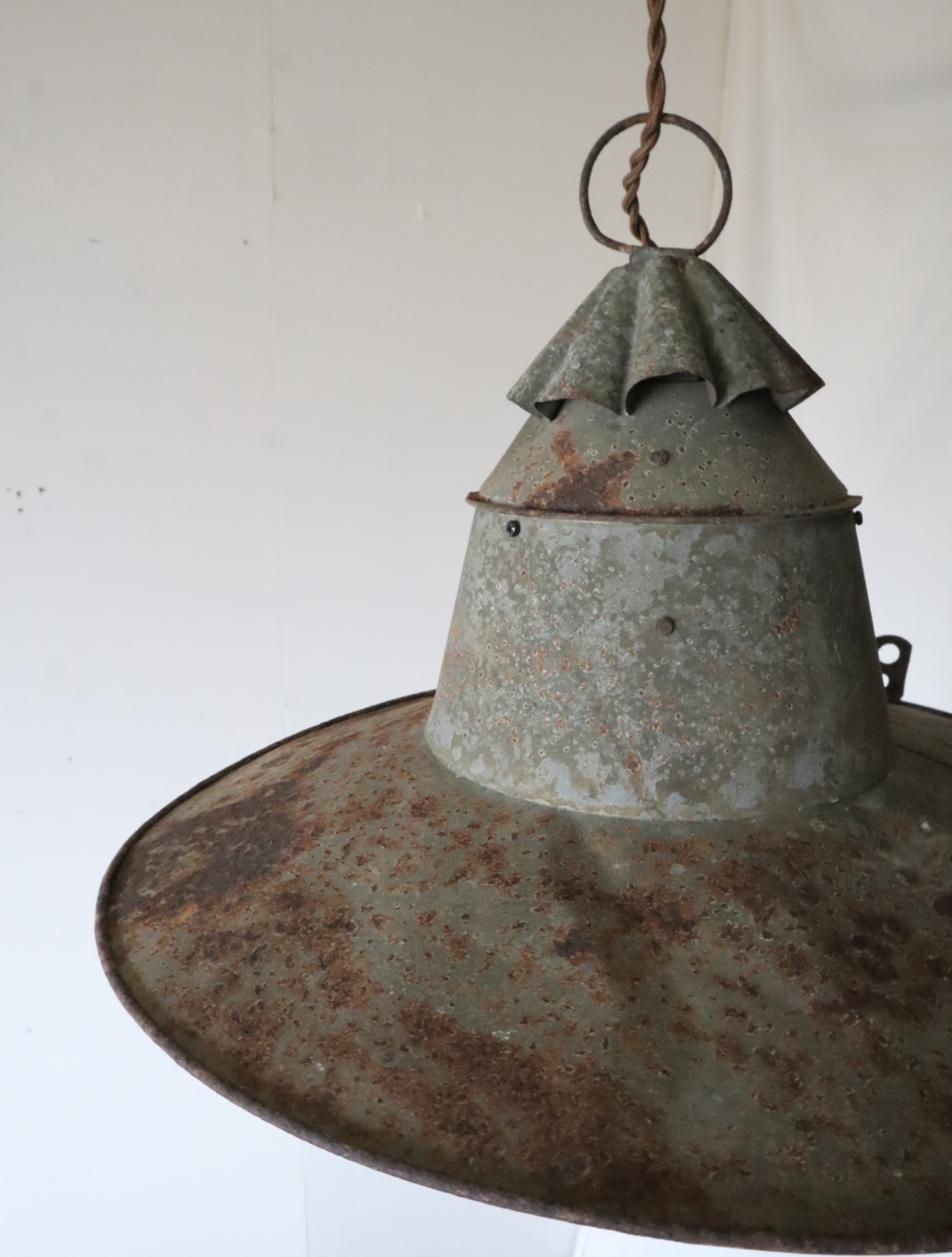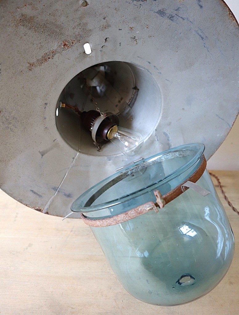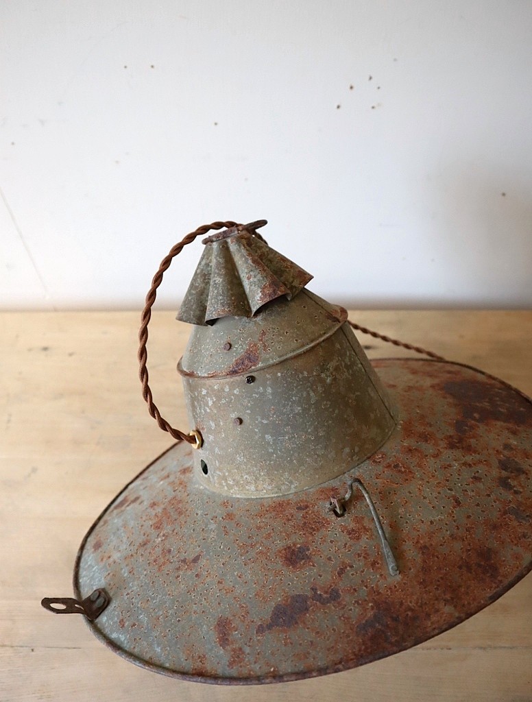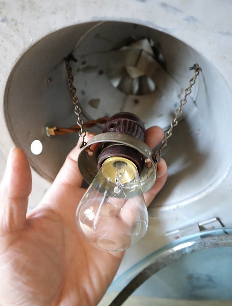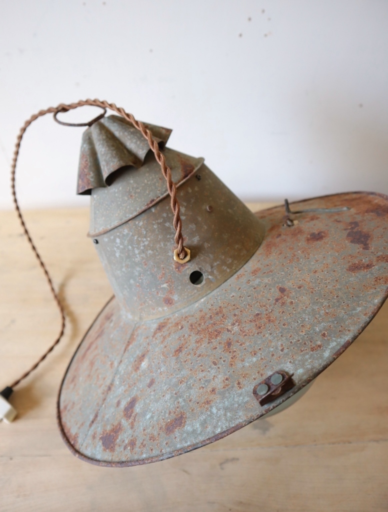 ガスを使って灯していた古い吊り下げランプに、ソケットとコードを取り付けて電気で使えるように当方で作り替えたペンダントライトになります。