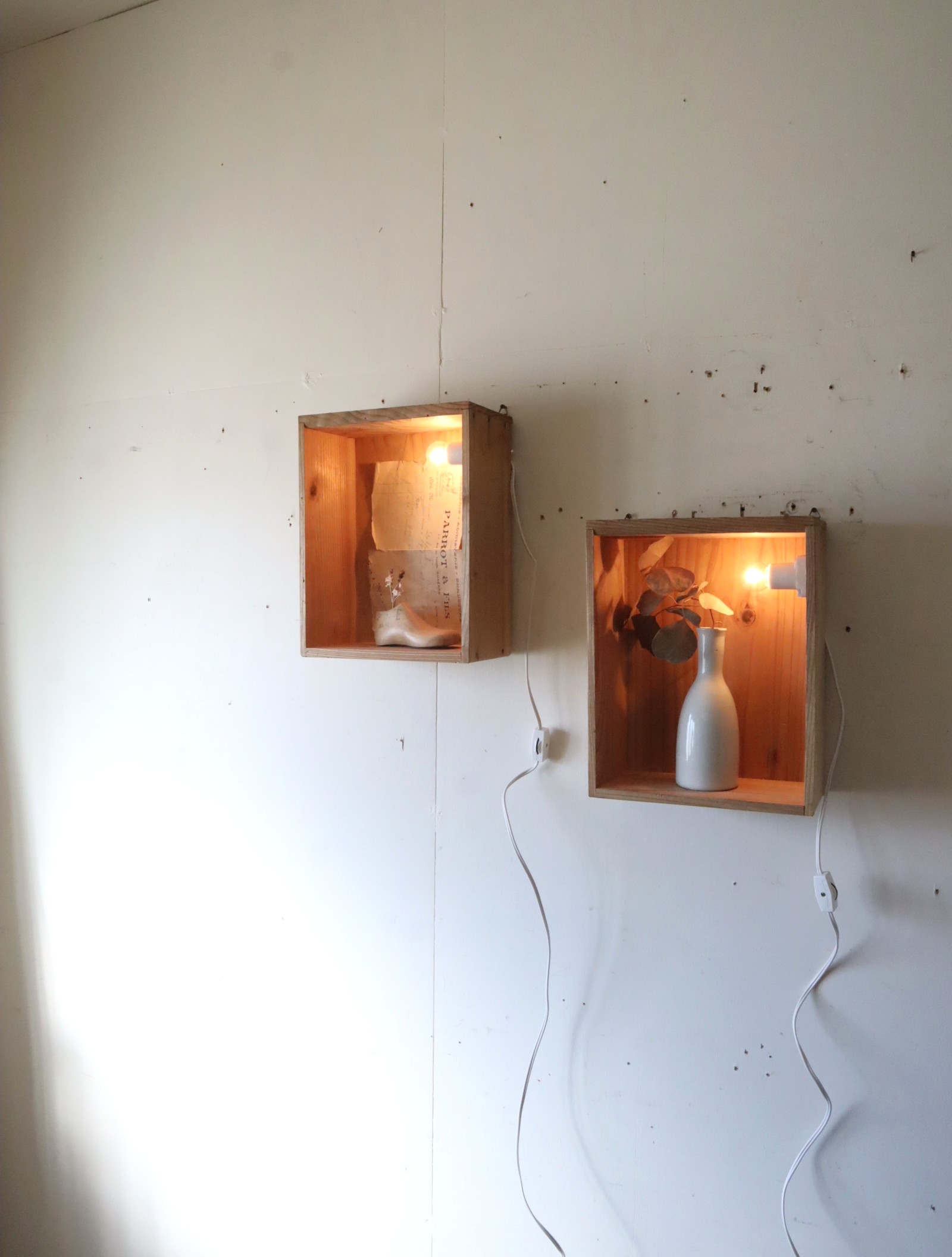 使わなくなった古い引き出しを使い、ソケットとコードを取り付けてライト付きの壁掛け飾り箱に仕立てました。