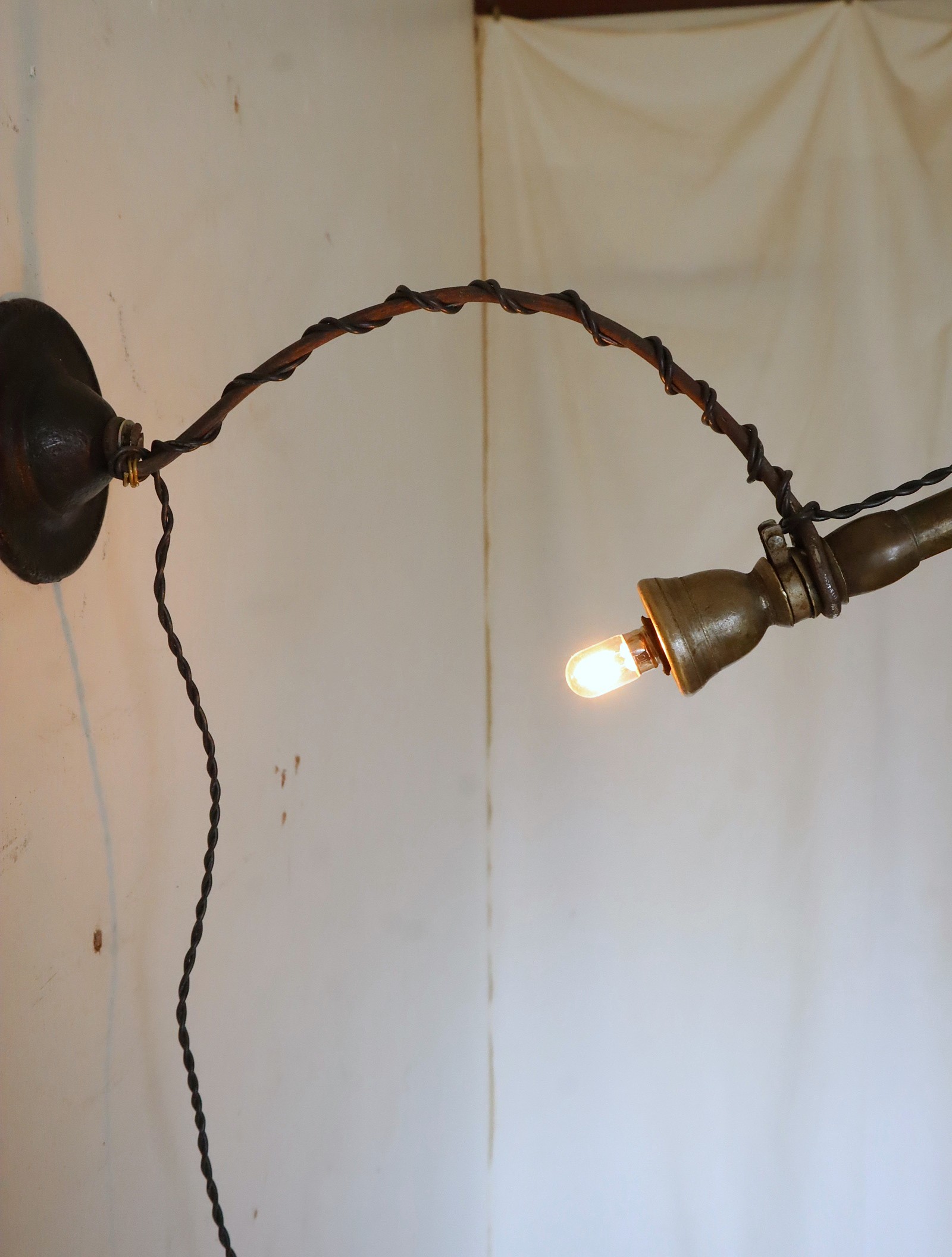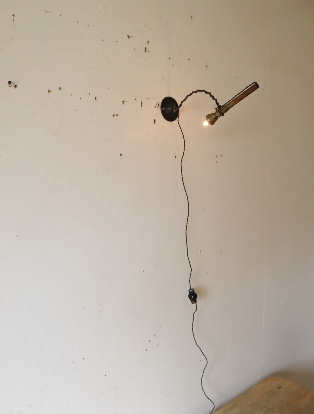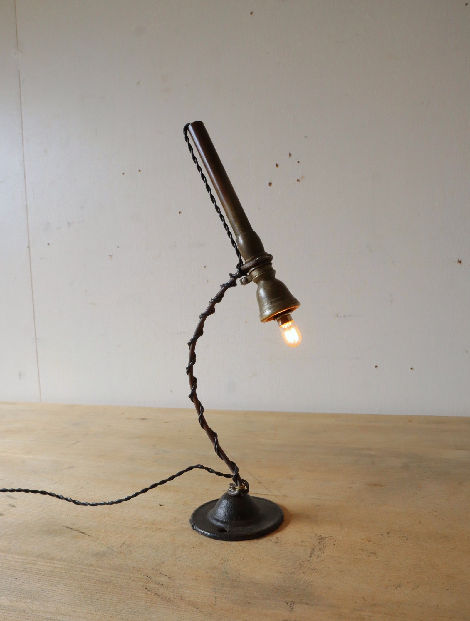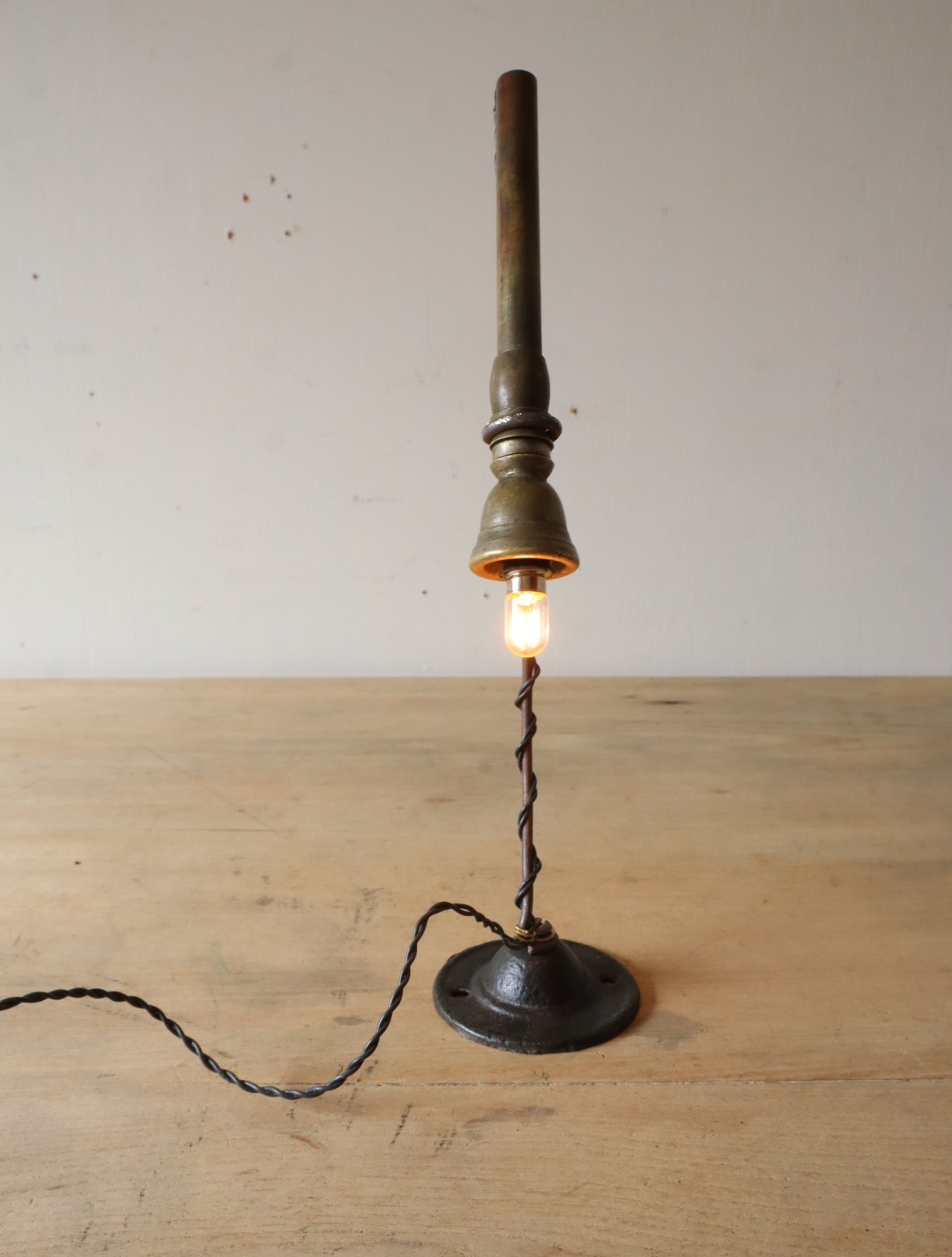金管楽器のマウスピースとサビた針金、柱時計内部の部品を使いカタチの面白いライトに仕立てました。