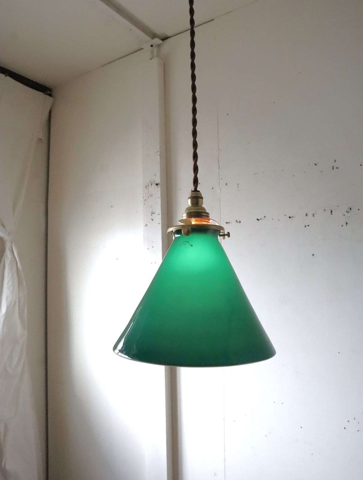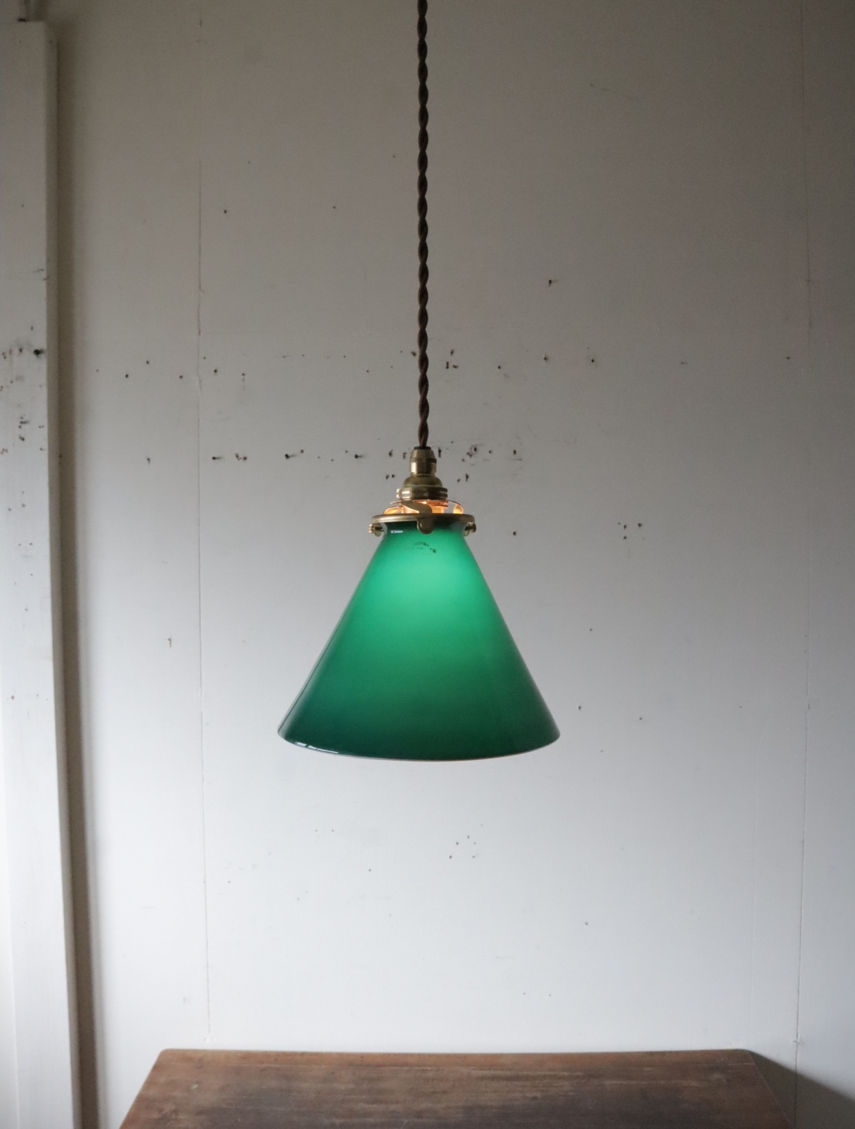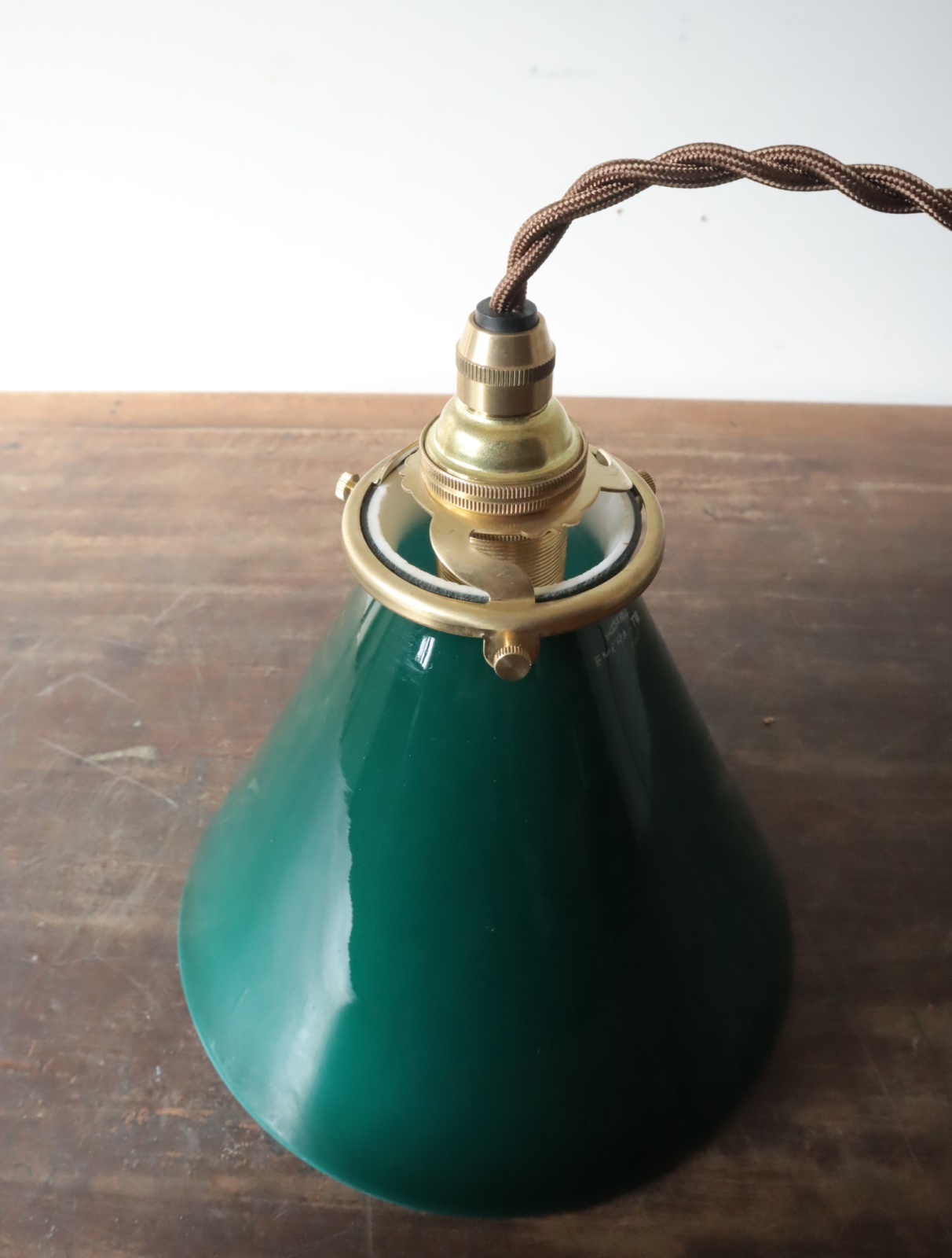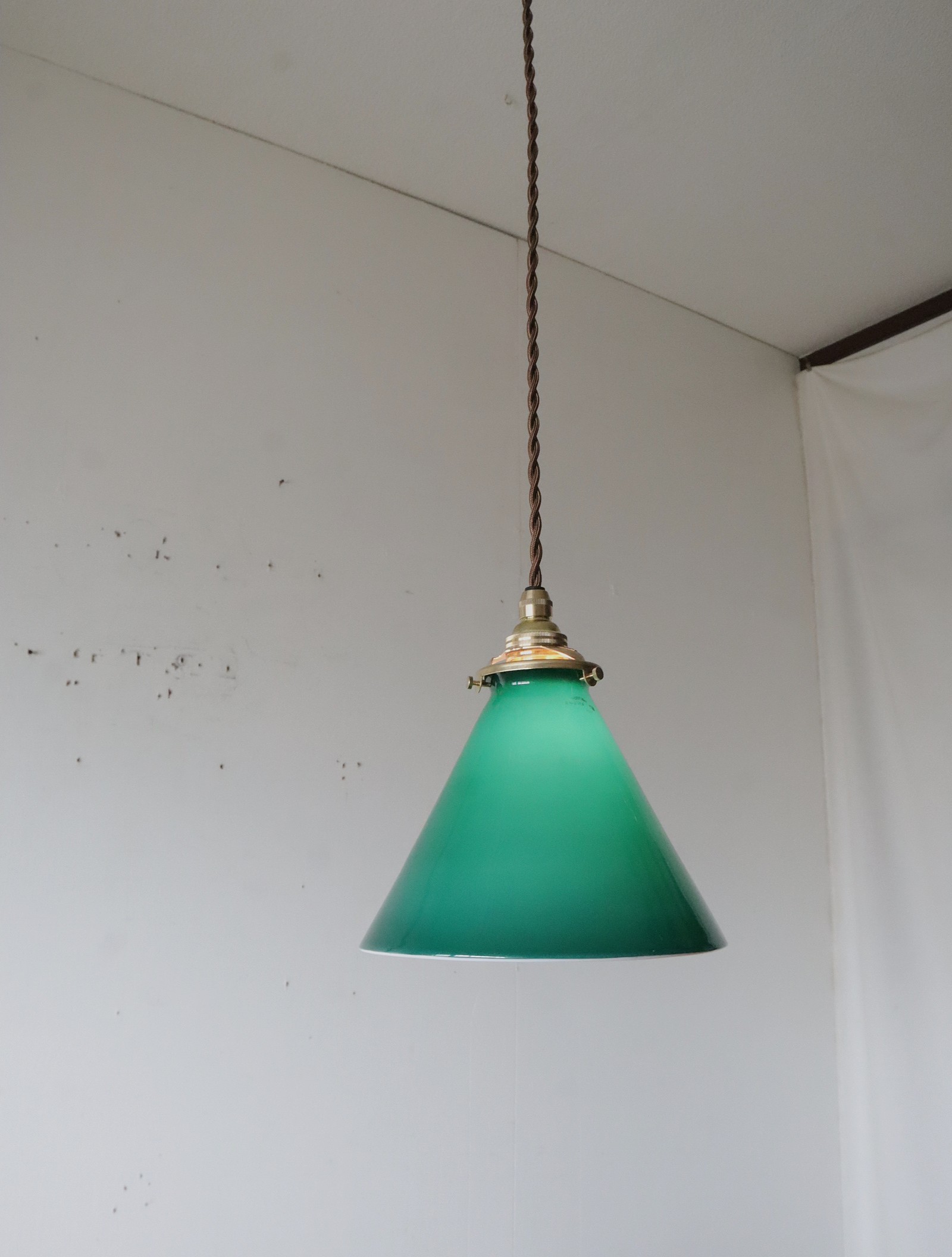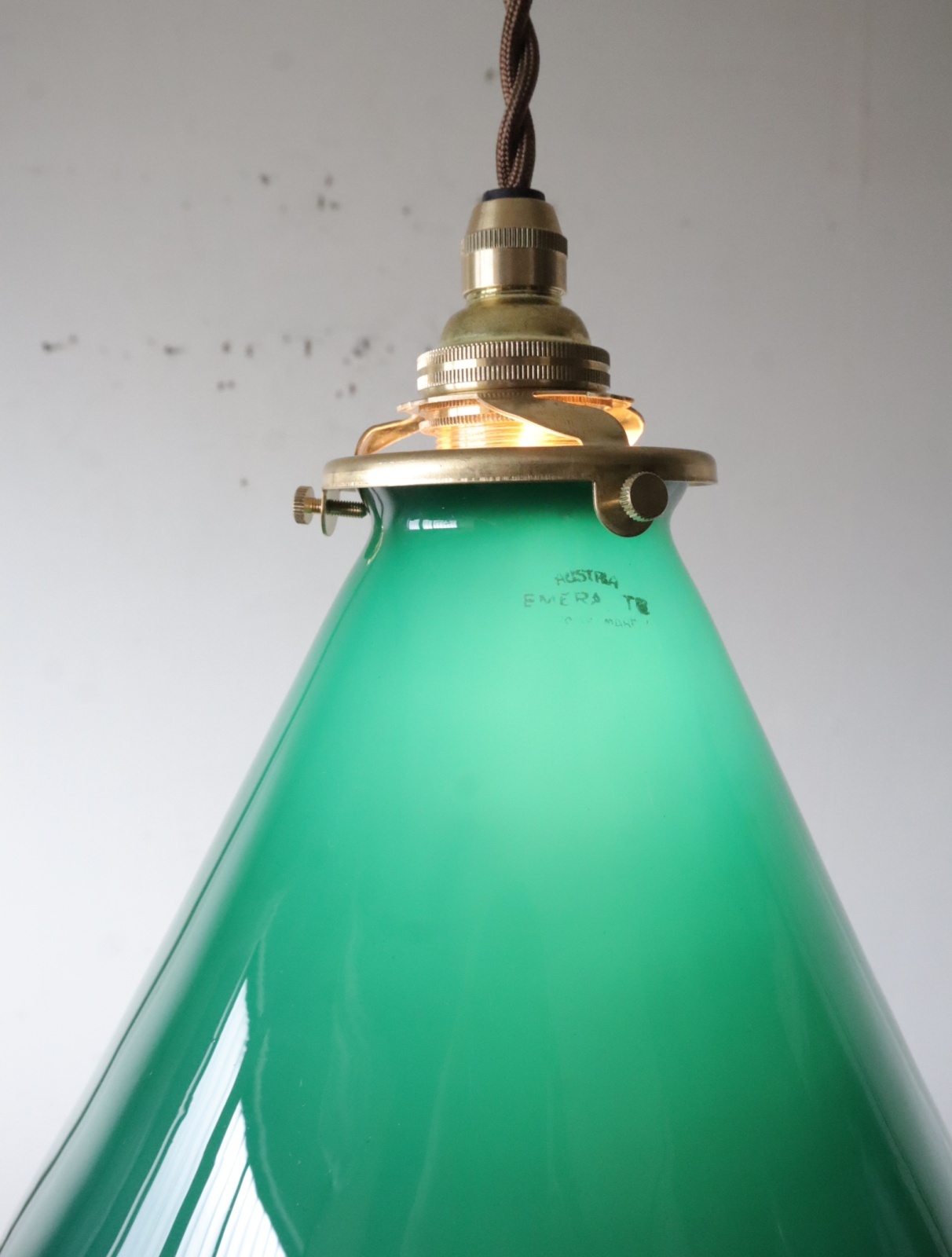 アメリカのHG McFaddin&Co.社(後にThe Emeralite Co. Inc.社に社名変更)のブランドEMERALITE(エメラライト)のグリーンの円錐型のガラスシェードが付いたペンダントライトになります。