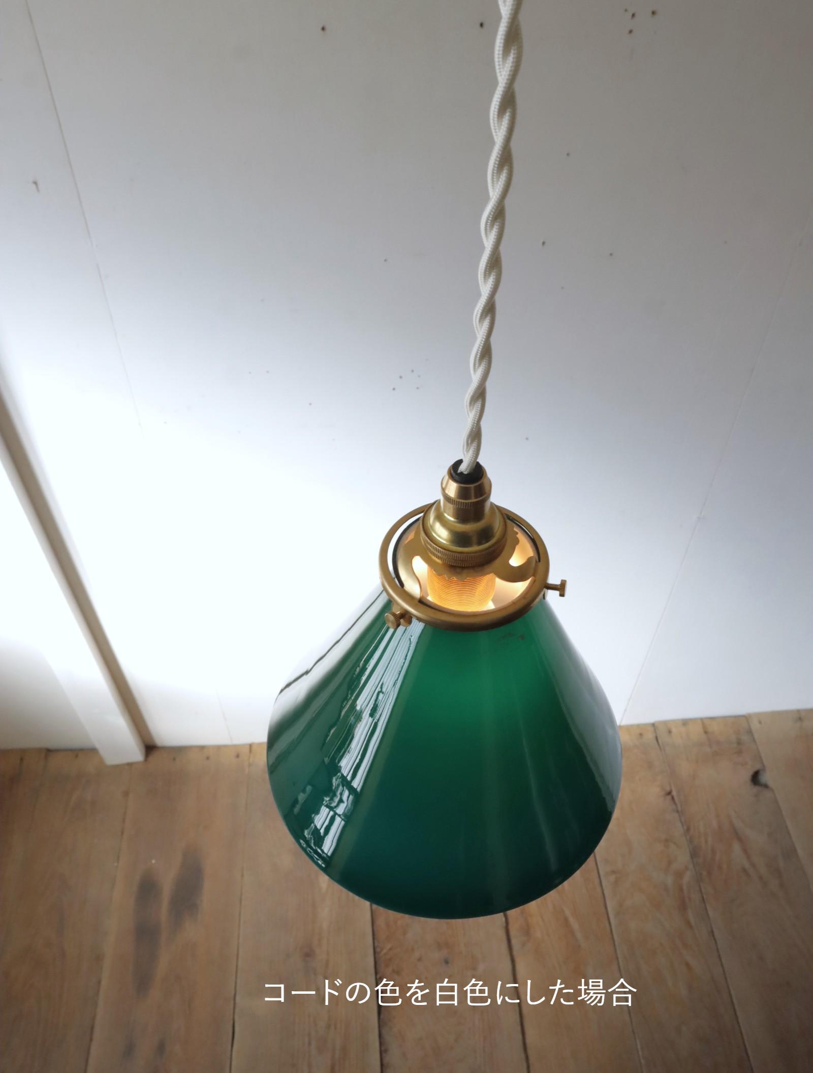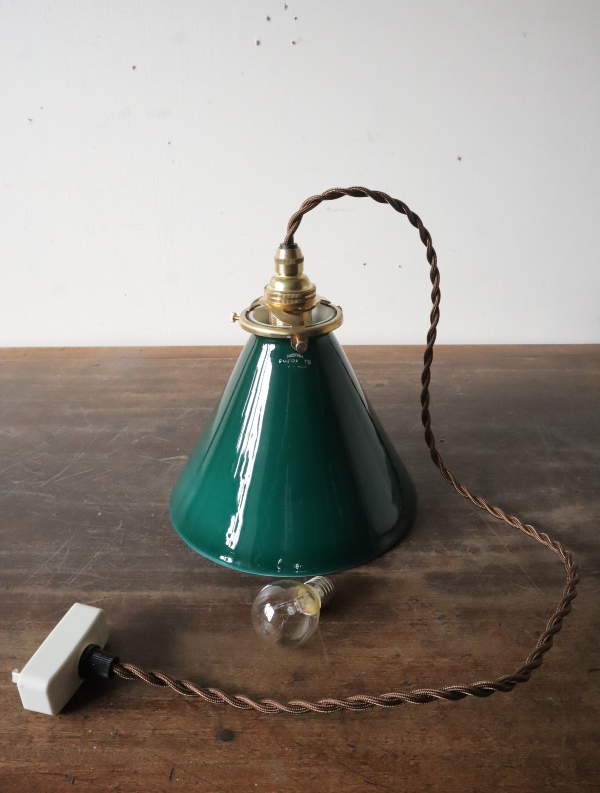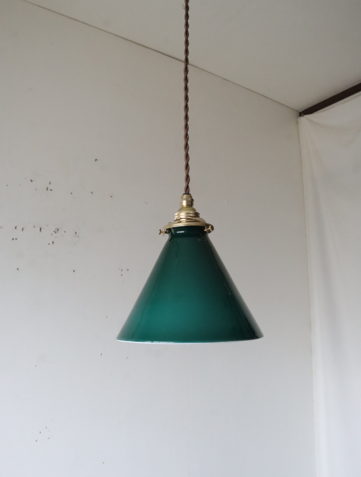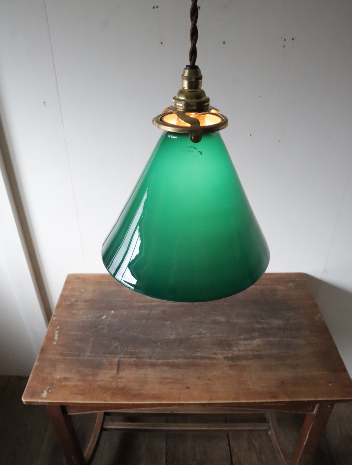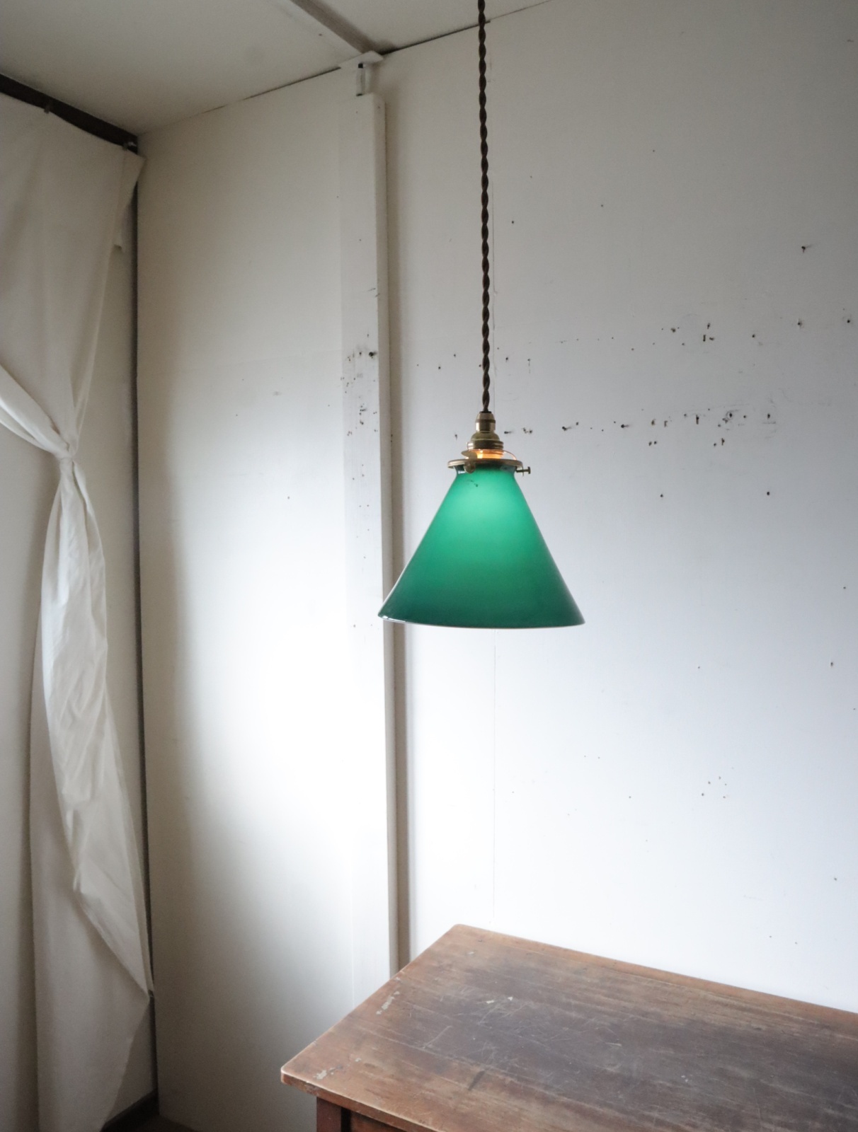 アメリカのHG McFaddin&Co.社(後にThe Emeralite Co. Inc.社に社名変更)のブランドEMERALITE(エメラライト)のグリーンの円錐型のガラスシェードが付いたペンダントライトになります。