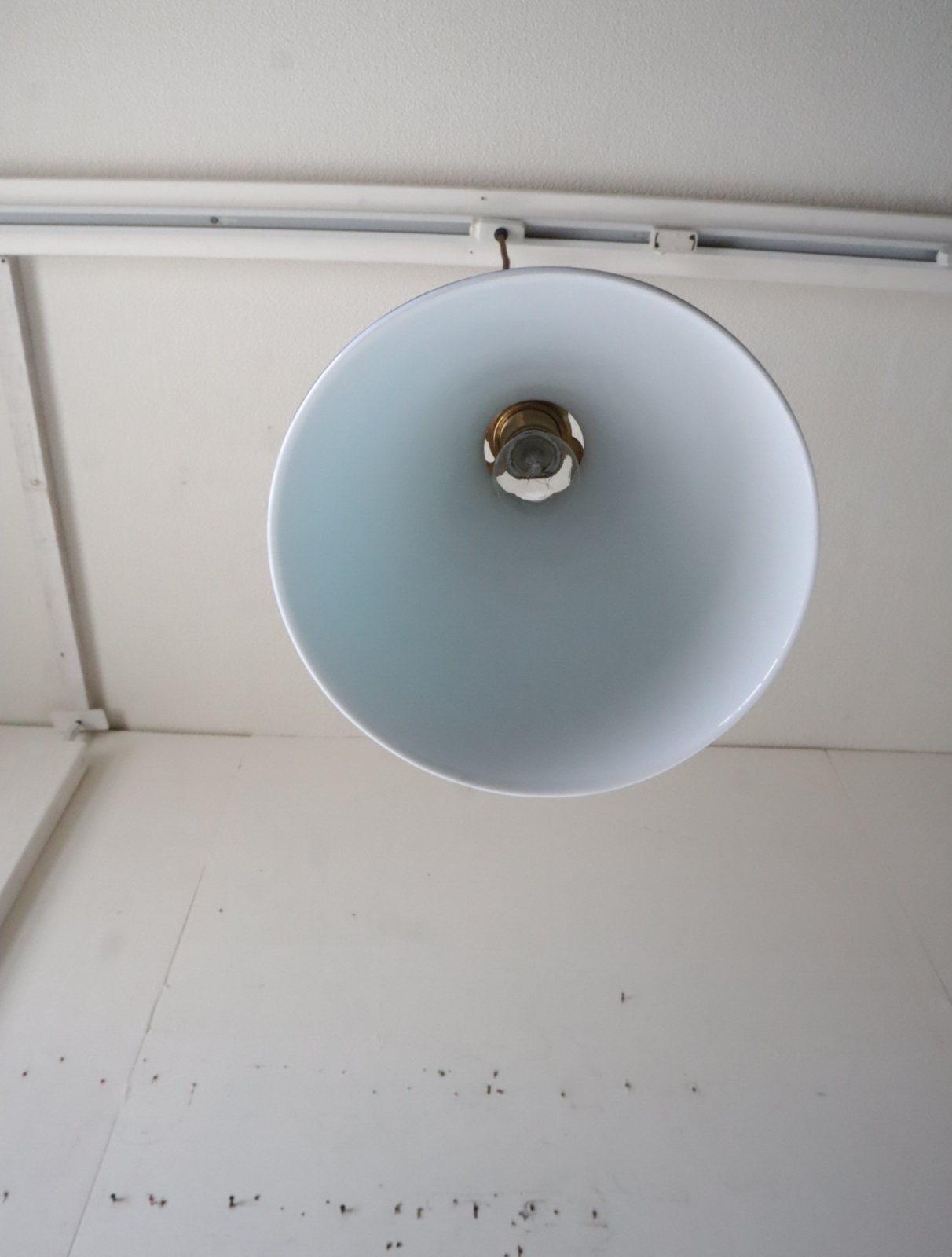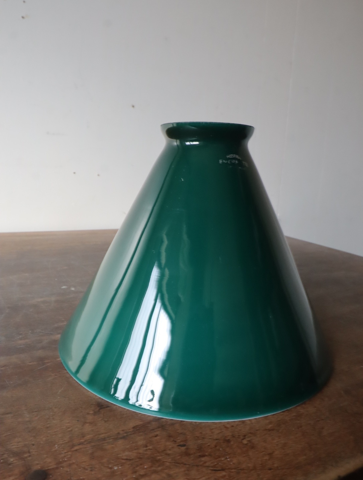 シェードは二層になっており、ホワイトオパールガラスの上から濃い緑色のガラスを被せて造られています。シェードは現在のチェコ共和国のモラヴィア州ラポティン市にあったJ.シュライバー&ネフェンガラス工場1つで全て生産されていたようです。(工場は第二次大戦後廃業)