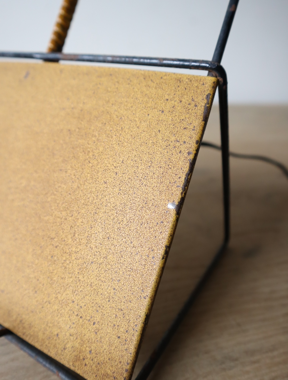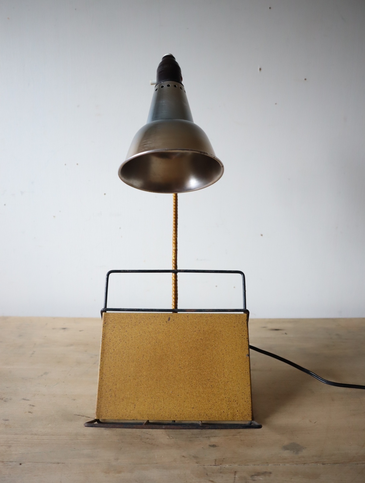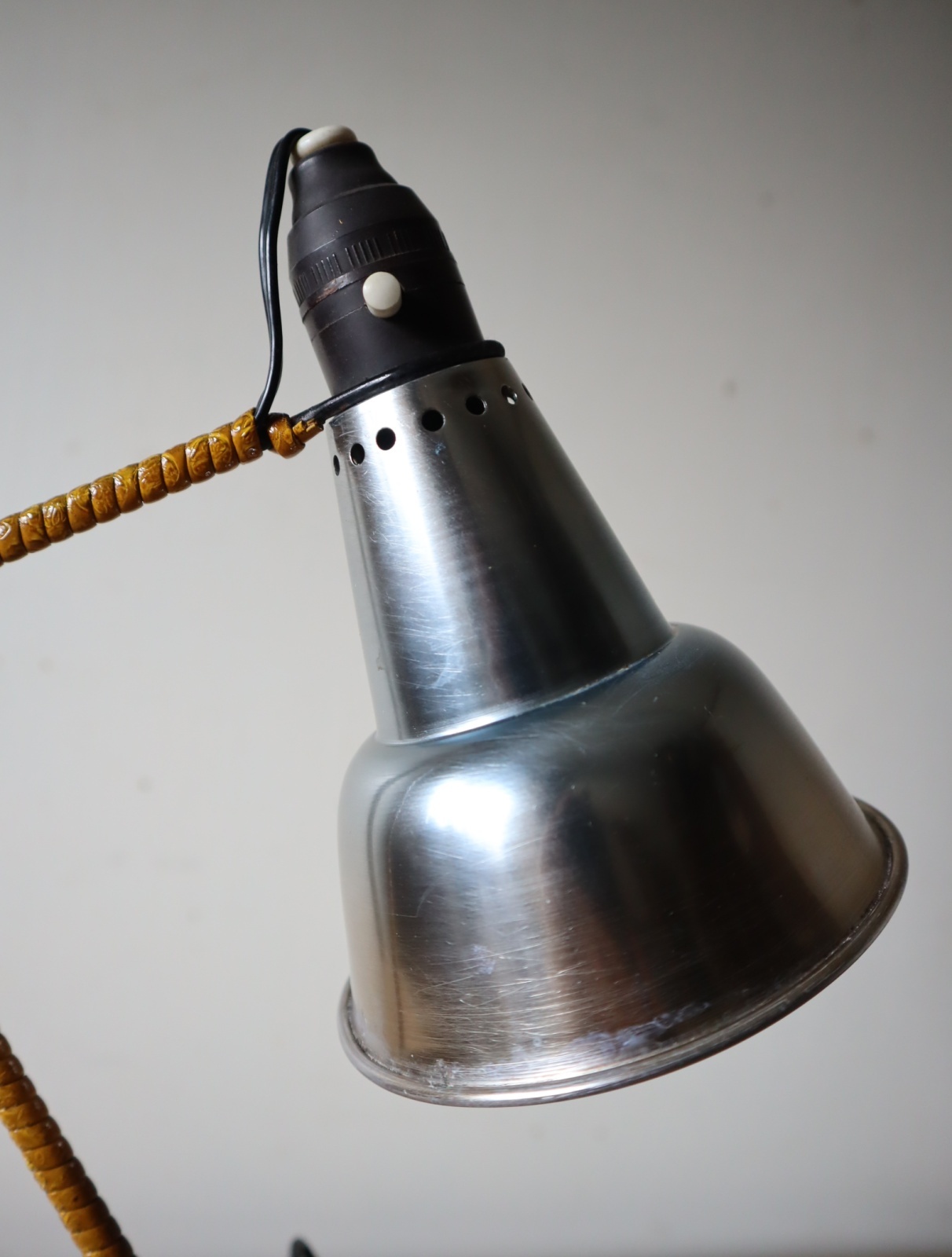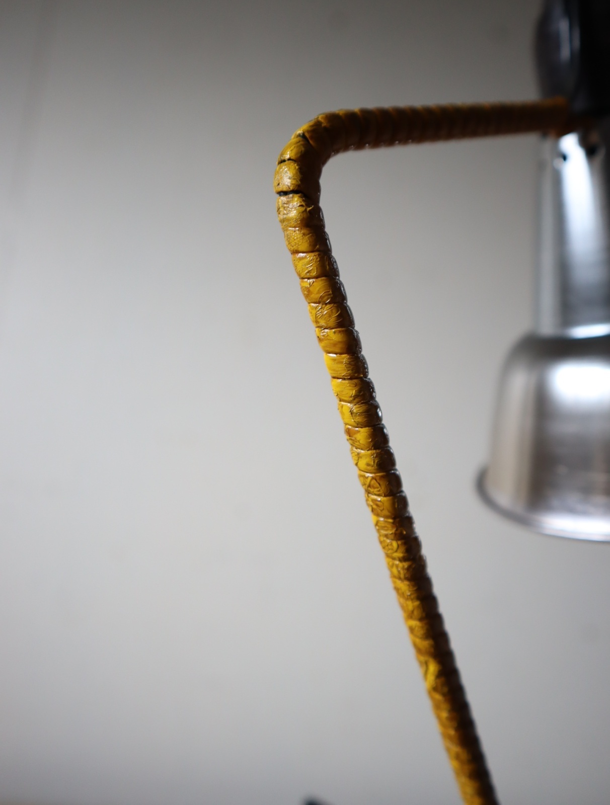 シェードはアルミ製、ソケットはベークライト製、スタンド部分はワイヤーと黄色く塗られたブリキ板のようなもので出来ており、支柱部分に巻かれているのは藤のようなものかと思います。上から黄色でペイントされています。