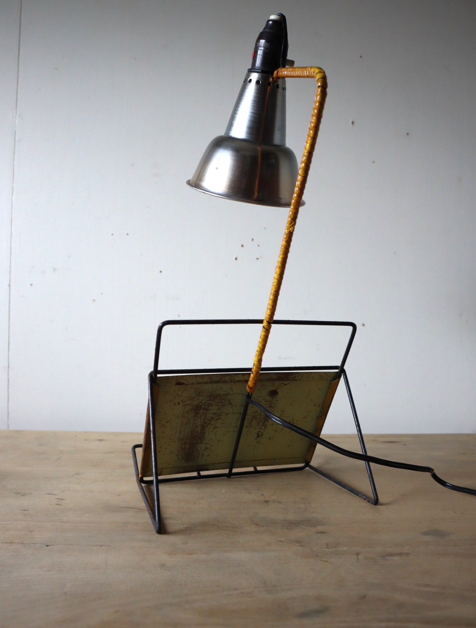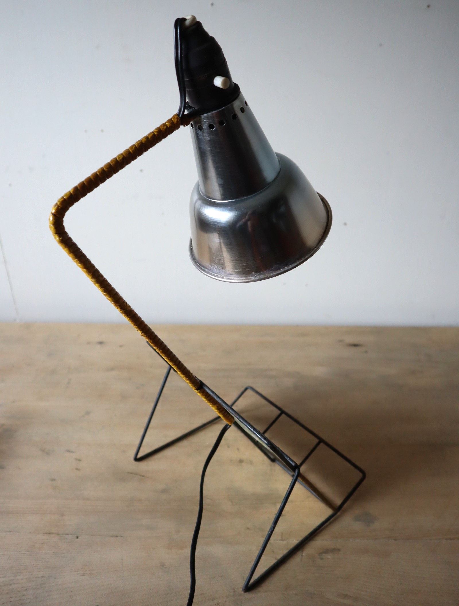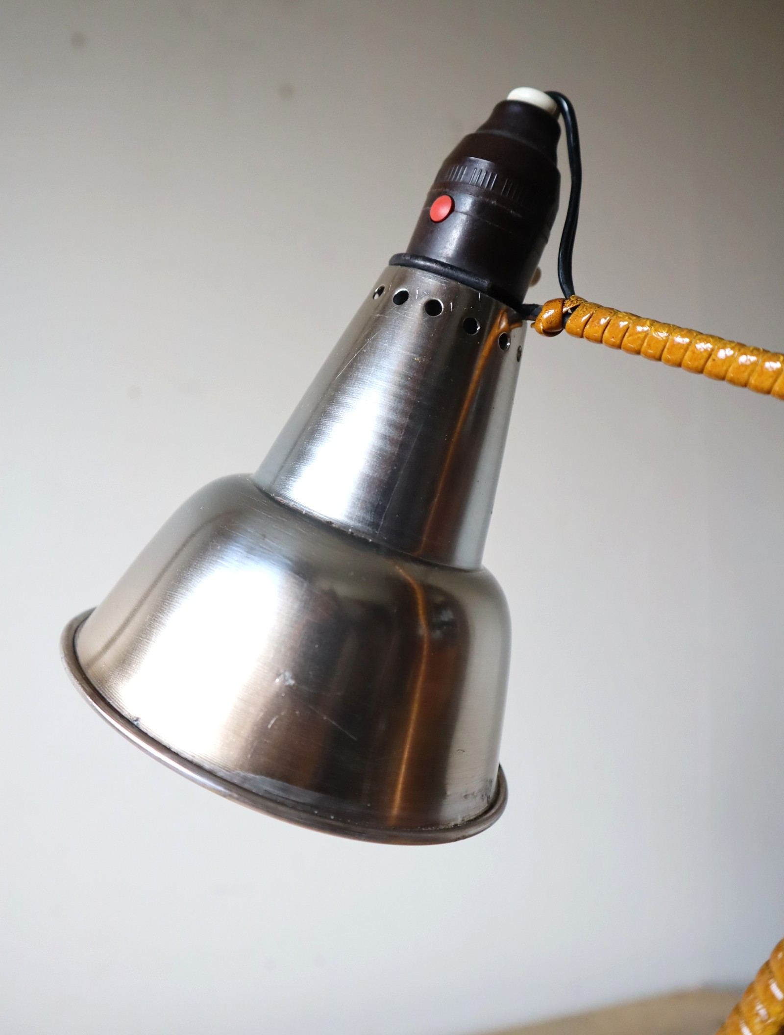 シェードはアルミ製、ソケットはベークライト製、スタンド部分はワイヤーと黄色く塗られたブリキ板のようなもので出来ており、支柱部分に巻かれているのは藤のようなものかと思います。上から黄色でペイントされています。