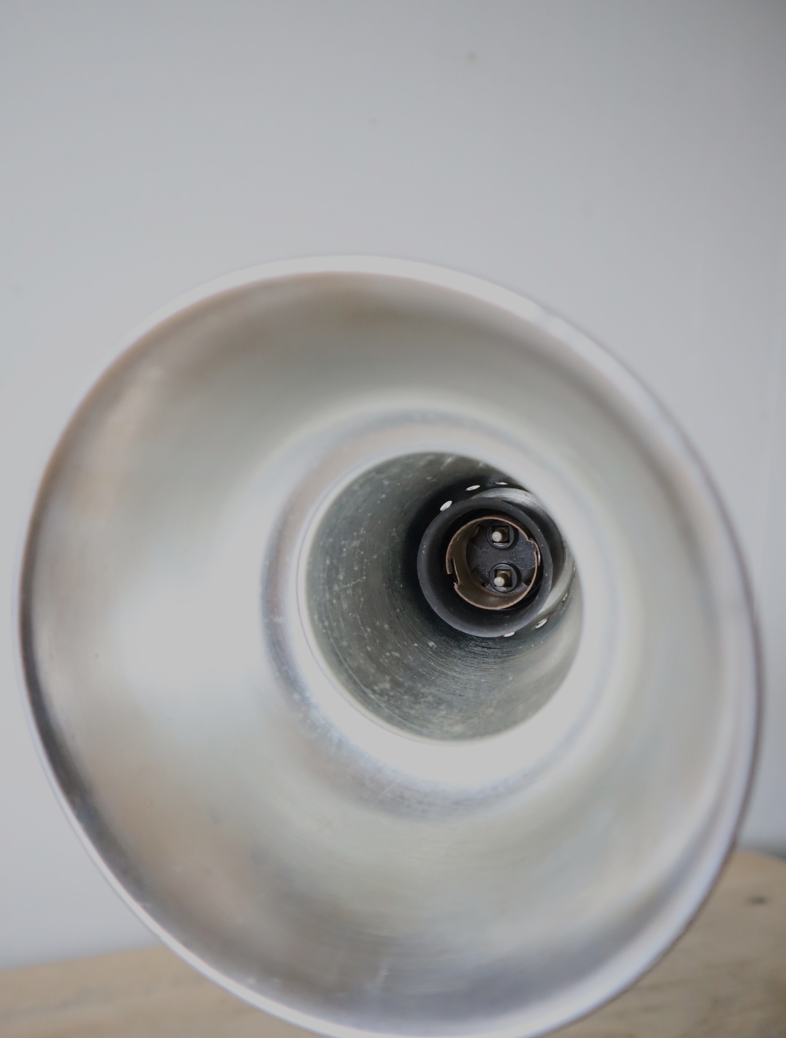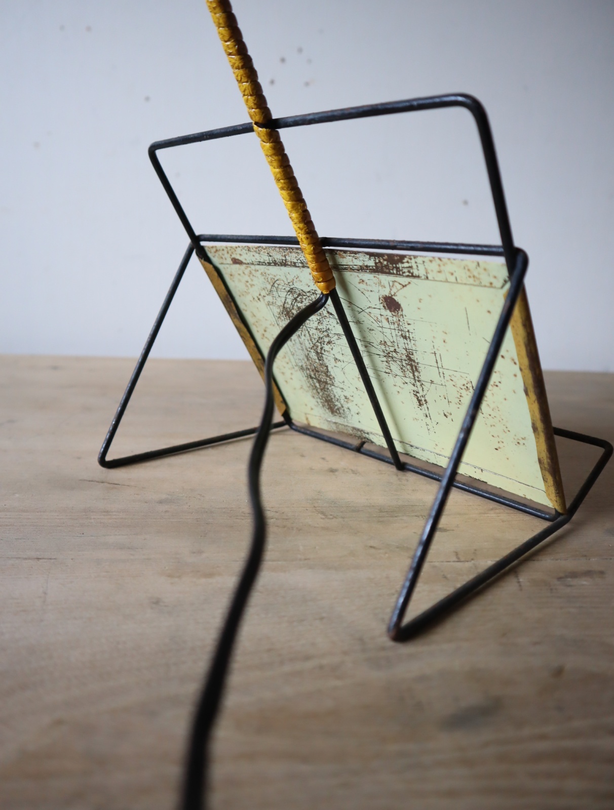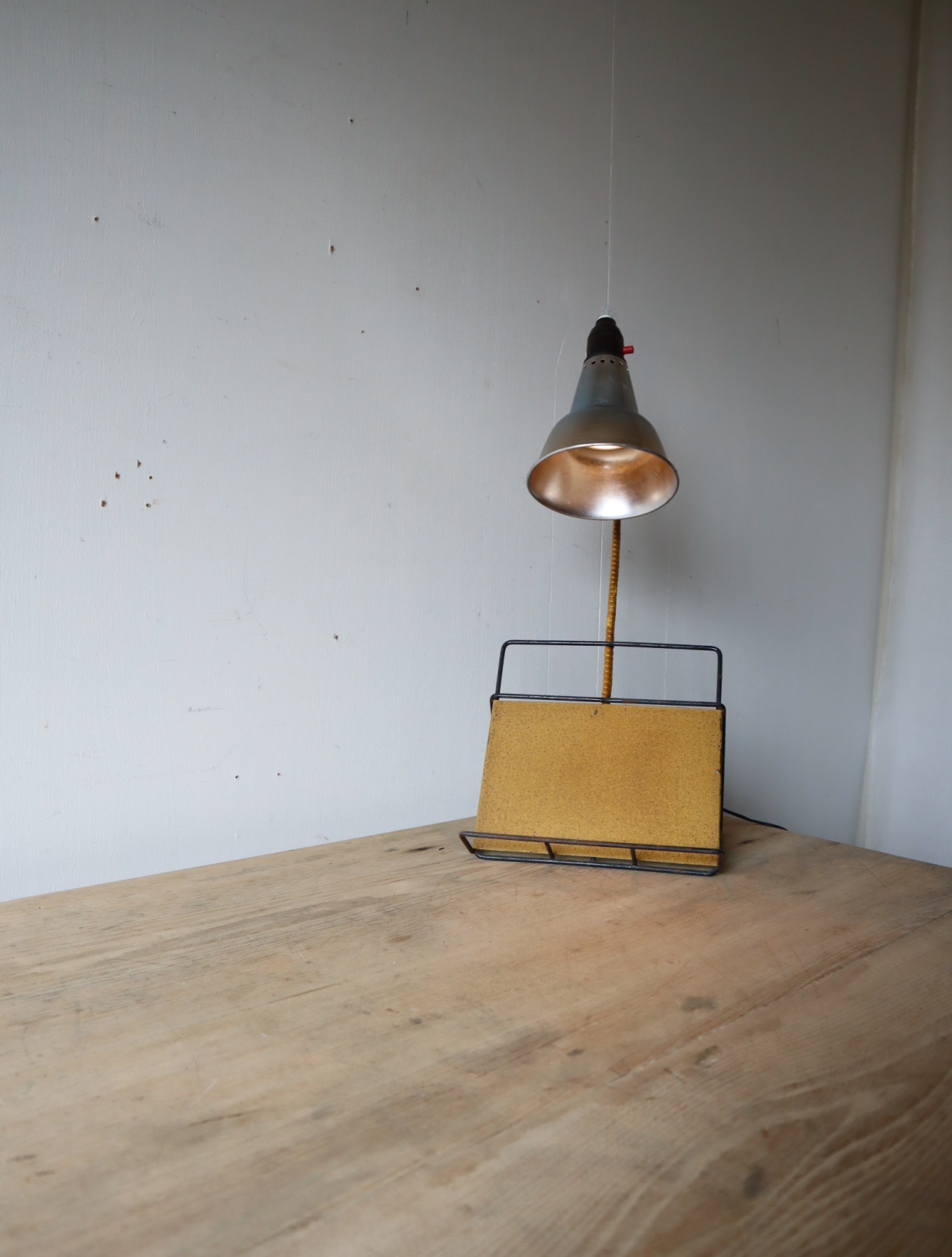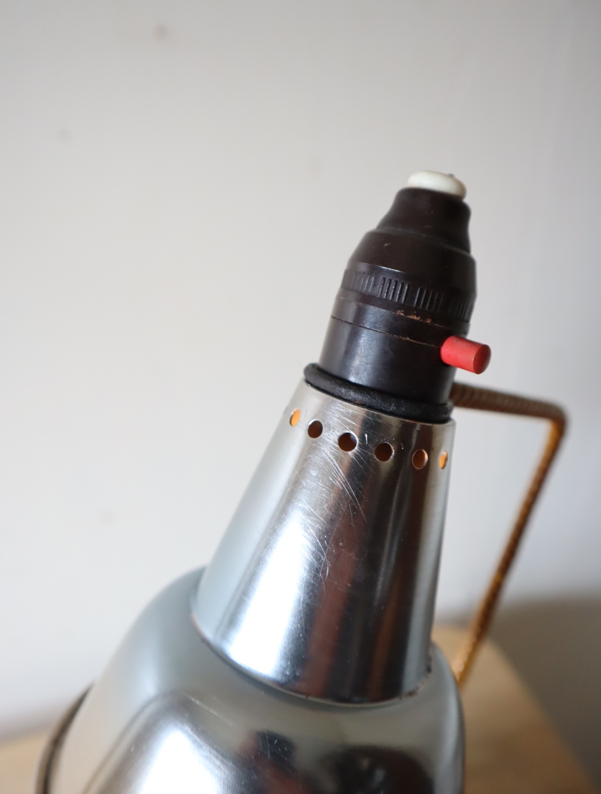 シェードはアルミ製、ソケットはベークライト製、スタンド部分はワイヤーと黄色く塗られたブリキ板のようなもので出来ており、支柱部分に巻かれているのは藤のようなものかと思います。上から黄色でペイントされています。