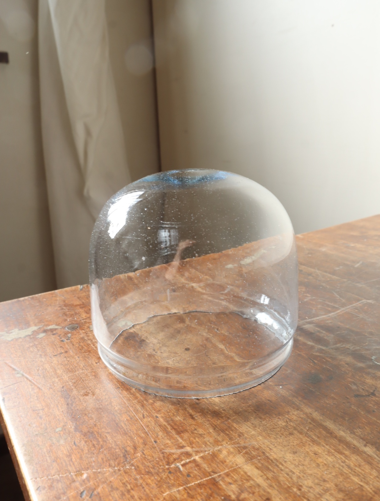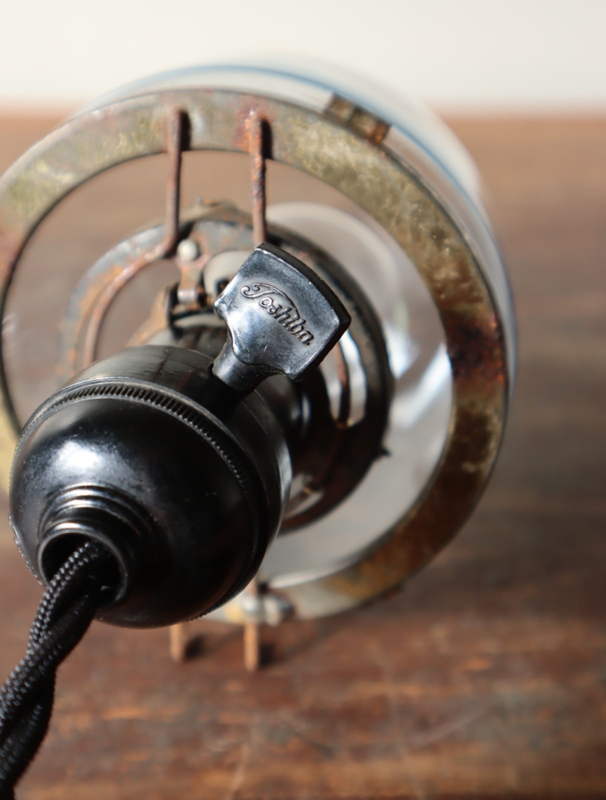 本来はスタンダードなカタチの電球の膨らんだ部分に引っ掛けて使うものになりますが、当方はあまりその見た目が好きではないので内部にブリキの部品を真鍮の針金で固定して電球が丸々ガラスの中に納まるように作り変えました。