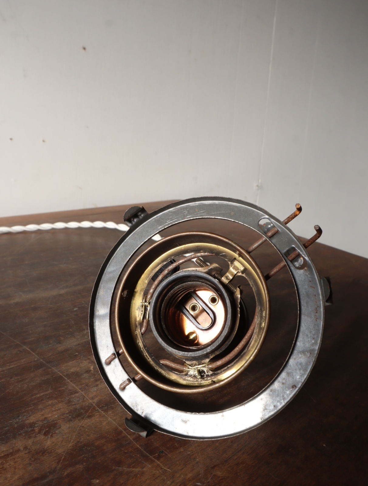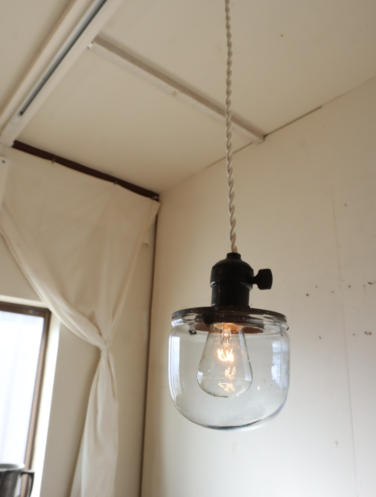 本来はスタンダードなカタチの電球の膨らんだ部分に引っ掛けて使うものになりますが、当方はあまりその見た目が好きではないので内部にブリキの部品を真鍮の針金で固定して電球が丸々ガラスの中に納まるように作り変えました。